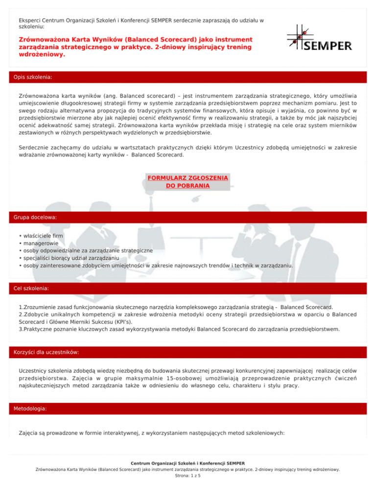 Eksperci Centrum Organizacji Szkoleń i Konferencji SEMPER serdecznie zapraszają do udziału w szkoleniu: Zrównoważona Karta Wyników (Balanced Scorecard) jako instrument zarządzania strategicznego w praktyce. 2-dniowy inspirujący trening wdrożeniowy. Opis szkolenia: Zrównoważona karta wyników (ang. Balanced scorecard) – jest instrumentem zarządzania strategicznego, który umożliwia umiejscowienie długookresowej strategii firmy w systemie zarządzania przedsiębiorstwem poprzez mechanizm pomiaru. Jest to swego rodzaju alternatywna propozycja do tradycyjnych systemów finansowych, która opisuje i wyjaśnia, co powinno być w przedsiębiorstwie mierzone aby jak najlepiej ocenić efektywność firmy w realizowaniu strategii, a także by móc jak najszybciej ocenić adekwatność samej strategii. Zrównoważona karta wyników przekłada misję i strategię na cele oraz system mierników zestawionych w różnych perspektywach wydzielonych w przedsiębiorstwie. Serdecznie zachęcamy do udziału w wartsztatach praktycznych dzięki którym Uczestnicy zdobędą umiejętności w zakresie wdrażanie zrównoważonej karty wyników - Balanced Scorecard. FORMULARZ ZGŁOSZENIA DO POBRANIA Grupa docelowa: • właściciele firm • managerowie • osoby odpowiedzialne za zarządzanie strategiczne • specjaliści biorący udział zarządzaniu • osoby zainteresowane zdobyciem umiejętności w zakresie najnowszych trendów i technik w zarządzaniu. Cel szkolenia: 1.Zrozumienie zasad funkcjonowania skutecznego narzędzia kompleksowego zarządzania strategią - Balanced Scorecard. 2.Zdobycie unikalnych kompetencji w zakresie wdrożenia metodyki oceny strategii przedsiębiorstwa w oparciu o Balanced Scorecard i Główne Mierniki Sukcesu (KPI’s). 3.Praktyczne poznanie kluczowych zasad wykorzystywania metodyki Balanced Scorecard do zarządzania przedsiębiorstwem. Korzyści dla uczestników: Uczestnicy szkolenia zdobędą wiedzę niezbędną do budowania skutecznej przewagi konkurencyjnej zapewniającej realizację celów przedsiębiorstwa. Zajęcia w grupie maksymalnie 15-osobowej umożliwiają przeprowadzenie praktycznych ćwiczeń najskuteczniejszych metod zarządzania także w odniesieniu do własnego celu, charakteru i stylu pracy. Metodologia: Zajęcia są prowadzone w formie interaktywnej, z wykorzystaniem następujących metod szkoleniowych: Centrum Organizacji Szkoleń i Konferencji SEMPER Zrównoważona Karta Wyników (Balanced Scorecard) jako instrument zarządzania strategicznego w praktyce. 2-dniowy inspirujący trening wdrożeniowy. Strona: 1 z 5 1. Warsztaty, prezentacje, praca zespołowa, konsultacje indywidualne, burza mózgów, case study, dyskusja nad osiągniętymi wynikami. 2. Projekt warsztatów ma charakter autorski i został opracowany w oparciu o doświadczenia praktyczne trenera, wynikające ze współpracy z organizacjami przy doskonaleniu ich systemów zarządzania. 3. Uczestnicy mogą liczyć na praktyczny i przystępny komentarz w odniesieniu do prezentowanego materiału, również z perspektywy własnej organizacji i problemów. Trener: dr inż Martin Daliga Specjalizacja trenerska: Jest ekspertem w zakresie zarządzania projektami. Jako niestrudzony propagator przywództwa sytuacyjnego Kennetha Blancharda skutecznie zarządzał zespołami interdyscyplinarnymi. Na przestrzeni ostatnich kilkunastu lat pracował z zespołami realizującymi projekty o budżetach sięgających ponad 10 mln zł. Pełnił szereg funkcji i ról w największych polskich przedsiębiorstwach, najbardziej dumny jest z udziału swojego zespołu w projektach związanych z optymalizacją procesów biznesowych i zwiększaniem ich konkurencyjności. Posiada kilkuletnią praktykę trenerską w kreowaniu wartości biznesowych i zarządzania ograniczeniami. Akredytowany trener metodyki PRINCE2? (PRINCE2? Approved Trainer). Specjalizacja: zarządzanie projektami, wykorzystanie metodyk zarządzania projektami PCM, PMBoK, PRINCE2, Agile, SCRUM do optymalizacji działań biznesowych. Program szkolenia: Dzień I Wprowadzenie do warsztatów szkoleniowych. 1.Podstawowe zasady funkcjonowania Balanced Scorecard. 2.Wykorzystanie Balanced Scorecard (BSC) w procesie zarządzania wartością przedsiębiorstwa. 3.Etapy budowy systemu Balanced Scorecard w 6 etapach (metoda „krok po kroku”). 4.Misja i wizja przedsiębiorstwa – punkt wyjścia do budowy strategii wzrostu wartości firmy. 5.Zasady ustalania i wyboru celów strategicznych w różnych perspektywach biznesowych. 6.Analiza procesów biznesowych pod względem realizacji celów strategicznych. Podsumowanie I dnia warsztatów szkoleniowych. DZIEŃ II Przegląd zagadnień I dnia warsztatów szkoleniowych. 1.Dobór mierników realizacji celów strategicznych i operacyjnych – opracowanie Karty Wyników. 2.Mierniki, cele, procesy, projekty, programy – czyli jaki to wszystko połączyć w jeden spójny system zarządzania. 3.Techniki realizacji strategii (inicjatywy strategiczne i zasady ich selekcji). 4.Mapowanie działań strategicznych na działania operacyjne. Centrum Organizacji Szkoleń i Konferencji SEMPER Zrównoważona Karta Wyników (Balanced Scorecard) jako instrument zarządzania strategicznego w praktyce. 2-dniowy inspirujący trening wdrożeniowy. Strona: 2 z 5 5.Etapy procesu wdrażania Kart Wyników. Podsumowanie warsztatów szkoleniowych. Informacje organizacyjne: Na kilka dni przed terminem wydarzenia skontaktujemy się z Państwem aby zapytać o Państwa oczekiwania, dotychczasowe doświadczenia i umiejętności, co pozwoli nam na częściowe dopasowanie programu szkolenia do Państwa potrzeb. -szkolenie trwa 2 dni (16h); -zajęcia odbywają się w godzinach 10.00-18.00 pierwszego dnia oraz w godzinach 09.00-17.00 drugiego dnia; -ze względu na warsztatową formę szkolenia maksymalna liczba uczestników to 15 osób; -w każdym dniu szkolenia przewidziane są 2 przerwy kawowe oraz lunch. Opcjonalnie: Istnieje możliwość dokonania