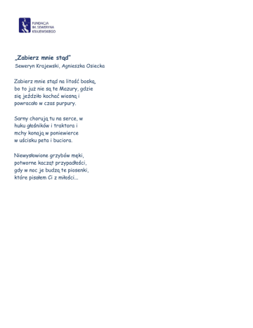 „Zabierz mnie stąd” Seweryn Krajewski, Agnieszka Osiecka Zabierz mnie stąd na litość boską, bo to już nie są te Mazury, gdzie się jeździło kochać wiosną i powracało w czas purpury. Sarny chorują tu na serce, w huku głośników i traktora i mchy konają w poniewierce w uścisku peta i buciora. Niewysłowione grzybów męki, potworne kacząt przypadłości, gdy w noc je budzą te piosenki, które pisałem Ci z miłości...
