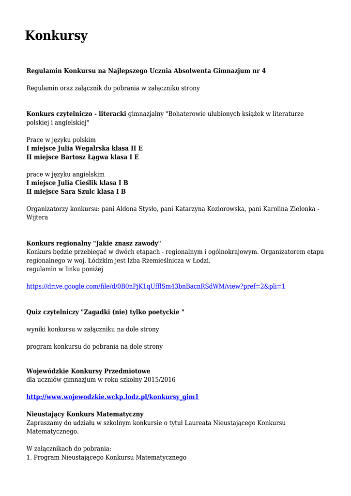 Konkursy Regulamin Konkursu na Najlepszego Ucznia Absolwenta Gimnazjum nr 4 Regulamin oraz załącznik do pobrania w załączniku strony Konkurs czytelniczo - literacki gimnazjalny "Bohaterowie ulubionych książek w literaturze polskiej i angielskiej" Prace w języku polskim I miejsce Julia Wegalrska klasa II E II miejsce Bartosz Łągwa klasa I E prace w języku angielskim I miejsce Julia Cieślik klasa I B II miejsce Sara Szulc klasa I B Organizatorzy konkursu: pani Aldona Stysło, pani Katarzyna Koziorowska, pani Karolina Zielonka Wijtera Konkurs regionalny "Jakie znasz zawody" Konkurs będzie przebiegać w dwóch etapach - regionalnym i ogólnokrajowym. Organizatorem etapu regionalnego w woj. Łódzkim jest Izba Rzemieślnicza w Łodzi. regulamin w linku poniżej https://drive.google.com/file/d/0B0nPjK1qUfflSm43bnBacnRSdWM/view?pref=2&pli=1 Quiz czytelniczy "Zagadki (nie) tylko poetyckie " wyniki konkursu w załączniku na dole strony program konkursu do pobrania na dole strony Wojewódzkie Konkursy Przedmiotowe dla uczniów gimnazjum w roku szkolny 2015/2016 http://www.wojewodzkie.wckp.lodz.pl/konkursy_gim1 Nieustający Konkurs Matematyczny Zapraszamy do udziału w szkolnym konkursie o tytuł Laureata Nieustającego Konkursu Matematycznego. W załącznikach do pobrania: 1. Program Nieustającego Konkursu Matematycznego 2. Zetstaw zadań nr 4 Opiekunowie konkursu: Ewa Kulik - Maślanka, Małgorzata Zając Olimpiada Matematyczna Gimnazjalistów Zapraszamy du udziału w XI edycji Olimpiady Matematycznej Gimnazjalistów. 1 września - 12 października 2015 r. - zawody I stopnia 24 września 2015 r. godz. 9.00 częśc testowa - etap szkolny https://www.omg.edu.pl/