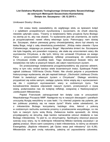 List Dziekana Wydziału Teologicznego Uniwersytetu Szczecińskiego do wiernych Metropolii Szczecińsko-Kamieńskiej Święto św. Szczepana – 26.12.2015 r. Umiłowani Siostry i Bracia Od czasu kiedy zasiadaliśmy do wigilijnego stołu ze śpiewem kolęd i z opłatkiem przepełnionym życzliwością i życzeniami, do chwili obecnej, niewiele upłynęło czasu. Trwamy w świętowaniu faktu przyjścia Syna Bożego na ziemię po to, aby nas zbawić. To wydarzenie jest tak znamienne, że warto je przypieczętować nawet ofiarą własnego życia. Patronujący nam dzisiaj św. Szczepan, diakon pierwszej gminy chrześcijańskiej, skoro był otwarty na łaskę Boga, mógł z całą otwartością powiedzieć: „Widzę niebo otwarte i Syna Człowieczego, stojącego po prawicy Boga”. Męczeńska śmierć św. Szczepana nie była tragedią, ani powodem rozpaczy, ale stała się umocnieniem wiary dla wyznawców Chrystusa, a dla tych, którzy nie uznawali Chrystusa za swego Pana – przyczynkiem pogłębionej refleksji prowadzącej do odkrywania w Chrystusie źródła wszelkiej łaski. Tego doświadczył Szaweł, który dał świadectwo nie tylko w pisanych listach, ale całym nawróconym życiem. Do przeżywanego świętowania przygotowywaliśmy się poprzez adwent, który w tym roku wniósł bardzo wiele brzemiennych treści. Episkopat Polski ogłosił Jubileusz 1050-lecia Chrztu Polski. Nie chodzi jedynie o przywołanie historycznego wydarzenia, ale jak napisali biskupi: „Obchodzić Jubileusz Chrztu Polski to świadczyć własnym życiem o Chrystusie”. Dlatego winniśmy przypatrzeć się sobie samym, zadając pytania, które wiążą się z wyrzeczeniem się zła i czytelnym wyznawaniem wiary w codziennym życiu. Tak konsekwentnie dawana odpowiedź naszym życiem, przeżywanym z żywą wiarą, podprowadza nas do kolejnej refleksji, związanej z Nadzwyczajnym Jubileuszem Miłosierdzia. Papież Franciszek zainaugurował ten święty czas w uroczystość Niepokalanego Poczęcia NMP. Następnie my w naszych diecezjach i parafiach uroczystą liturgią weszliśmy w czas łaski. I tu również pojawia się pytanie, jak ten jubileusz przełoży się na nasze życie? Warto sobie uświadomić, że z miłosierdzia Bożego korzystamy każdego dnia, ilekroć z pokorą w codziennym rachunku sumienia prosimy o przebaczenie wszystkiego, co nie było w naszym życiu wolą Bożą. Zwłaszcza każda spowiedź, do której przystępujemy ze skruchą, daje bardzo namacalnie odczuć działanie w nas Bożego miłosierdzia. To jest to, co otrzymujemy. Spróbujmy otworzyć jeszcze szerzej oczy wiary, by to dotknięcie miłosiernej Miłości bardziej zauważyć i je głębiej przeżyć. Skoro sami czerpiemy z łaski miłosierdzia, to idźmy za słowami Ewangelisty: „Bądźcie miłosierni, jak Ojciec wasz jest miłosierny” (Łk 6,36). Miłosierdzie nie jest cnotą naturalną, zależną od usposobienia człowieka. 2 Nie jest tak, że ogólnie pozytywnie postrzegany człowiek jest bardziej miłosierny od innych. Chodzi raczej o wewnętrzne usposobienie dojrzewające w miarę przebywania z Jezusem. Mam naśladować Jezusa czerpiąc z Niego inspirację i siłę do realizacji tego, co zawiera Mały katechizm. Papież Franciszek napisał: „Jest moim gorącym życzeniem, aby chrześcijanie przemyśleli podczas Jubileuszu uczynki miłosierdzia względem ciała i względem ducha. Będzie to sposobem na obudzenie naszego sumienia, często uśpionego wobec dramatu ubóstwa, a także umożliwi nam coraz głębsze wejście w serce Ewangelii (…). Odkryjmy na nowo uczynki miłosierdzia względem ciała: głodnych nakarmić, spragnionych napoić, nagich przyodziać, przybyszów w dom przyjąć, więźniów pocieszać, chorych nawiedzać, umarłych pogrzebać. I nie zapominajmy o uczynkach miłosiernych względem ducha – dalej pisze papież Franciszek – wątpiącym dobrze radzić, nieumiejętnych pouczać, strapionych pocieszać, krzywdy cierpliwie znosić, urazy chętnie darować, modlić się za żywych i umarłych” (Misericordiae vultus, 15). Św. Szczepan przez postawę oddania się w opiekę Bożą, mógł przebaczyć oprawcom mówiąc: „Panie, nie poczytaj im tego grzechu” (Dz 7,60). I tak wytrwał do końca, dlatego został zbawiony (por. Mt 10,22). Tym samym dał nam ochrzczonym piękny przykład realizacji postawy miłosiernej. Zachęceni przykładem dzisiejszego Patrona, dodatkowo zmotywowani inicjatywą papieża Franciszka i Konferencji Episkopatu Polski, chcemy jako społeczność akademicka Wydziału Teologicznego Uniwersytetu Szczecińskiego realizować wskazania płynące z Ewangelii. Nasi nauczyciele akademiccy podejmują starania, by poza fachową wiedzą z poszczególnych dyscyplin, przekazywać słuchaczom wartości, które swymi korzeniami sięgają Ewangelii. Zaś studenci przez postawę rzetelnego przykładania się do realizacji swoich obowiązków, troszczą się, by czas studiów wykorzystać na kształtowanie odpowiedzialnych postaw ludzi sumienia. Na Wydziale Teologicznym studiują zarówno klerycy naszych seminariów duchownych przygotowując się do przyjęcia sakramentu święceń, jak i osoby pragnące pogłębić wiedzę teologiczną czy to z myślą o pracy katechetycznej, czy dla pożytku wspólnot religijnych, do których należą. Przekazywane treści teologiczne zawsze służą ugruntowaniu i uczynieniu swojej wiary, bardziej świadomą. Na kierunku Nauki o rodzinie Wydział przygotowuje do pełnienia posługi asystenta rodziny i do podjęcia zadań związanych z profilaktyką społeczną oraz poradnictwem i terapią małżeństwa i rodziny. Na trzecim kierunku prowadzonym przez Wydział – Italianistyka z elementami studiów nad chrześcijaństwem studenci zdobywają biegłość w kierunkowym języku i podstawową wiedzę o początkach chrześcijaństwa i jego fundamentach dla współczesnej Europy. Mamy nadzieję, że wszystko co dokonuje się na naszym Wydziale (zajęcia dydak