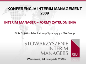 KONFERENCJA INTERIM MANAGEMENT 2009 INTERIM MANAGER – FORMY ZATRUDNIENIA Piotr Gujski – Adwokat, współpracujący z FPA Group Warszawa, 24 listopada 2009 r. • ROLA I ZADANIA INTERIM MANAGERA (IM): Zatrudnienie w celu realizacji konkretnego projektu; Zatrudnienie najczęściej na czas określony; Faktycznym „pracodawcą” bywa rada nadzorcza lub wspólnik; Częśd działao bywa podejmowana obok lub wbrew urzędującemu zarządowi. • INTERIM MANAGER A SPÓŁKA – WZAJEMNE RELACJE: IM jako członek zarządu, IM poza zarządem zatrudniony przez ten organ, IM jako prokurent, IM poza zarządem faktycznie zatrudniony przez radę nadzorczą lub wspólnika. • SPÓŁKA Z OGRANICZONĄ ODPOWIEDZIALNOŚCIĄ oraz SPÓŁKA AKCYJNA jako przykłady „pracodawców” – formalnie zarządzającego, kontrolującego i właścicielskiego. rozdzielenie czynnika Konflikt lojalności – możliwe kwestie sporne • organem prowadzącym sprawy spółki i reprezentującym spółkę jest zarząd (art. 201 par. 1 k.s.h., art. 368 par. 1 k.s.h.), który z tego tytułu ponosi odpowiedzialnośd zarówno wobec spółki (art. 293 par. 1 k.s.h., art. 483 par. 1 k.s.h.) , jak i czasami wobec podmiotów trzecich (art. 299 k.s.h.), • nie można ograniczyd prawa zarządu do reprezentowania spółki ze skutkiem prawnym wobec osób trzecich (art. 204 par. 2 k.s.h., art. 372 par. 2 k.s.h.), • rada nadzorcza nie ma prawa wydawania zarządowi wiążących poleceo co do prowadzenia spraw spółki (art. 219 par. 2 k.s.h.), • IM faktycznie zatrudniony przez radę nadzorczą lub wspólnika może zatem znaleźd się w sytuacji, w której będzie zmuszony działad wbrew zarządowi spółki (brak akceptacji dla jego aktywności), który to organ jednak będzie ponosił odpowiedzialnośd za działania IM, • obowiązek zachowania lojalności wobec interesów spółki, a nie członka konkretnego jej organu (spółka jest odrębnym podmiotem prawa), • w każdej sytuacji ostatnie słowo należy do zarządu, • najbardziej komfortowa dla IM sytuacja – przed jego zatrudnieniem poszczególne organy spółki porozumieją się co do charakteru aktywności IM w spółce, • „wewnętrzne” ograniczenie kompetencji zarządu w umowie lub statucie spółki (art. 207 k.s.h.). Jak zabezpieczyd interesy Interim Managera w razie powstania konfliktu między organami spółki? • Art. 389 – 390 k.c. – umowa przedwstępna, • Art. 391 k.c. – umowa o świadczenie przez osobę trzecią, • Art. 392 k.c. – umowa o zwolnienie z długu, • W przypadku umowy przedwstępnej jej stroną jest spółka. • W przypadku umowy o zwolnienie z długu i umowy o świadczenie przez osobę • • • trzecią jej stroną jest „faktyczny pracodawca” Art. 519 par. 1 k.c. – przejęcie długu, Instytucja przystąpienia do długu Art. 300 k.p. – wszystkie opisane wyżej instytucje mogą byd zastosowane także w przypadku stosunku pracy, • • FUNDAMENTALNE ZASADY ZAWIERANIA UMÓW ”Clara pacta claros amicos faciunt” - „Jasne umowy czynią prawdziwych przyjaciół” „Si vis pacem para bellum” – „Pragniesz pokoju szykuj się do wojny” Ważnośd umowy – zachowanie prawidłowej reprezentacji • IM jako członek zarządu – art. 210 k.s.h. i art. 379 par. 1 k.s.h., • IM poza zarządem – reprezentacja przez zarząd lub przez pełnomocnika, • IM jako prokurent – zasady udzielania i odwoływania prokury (art. 208 par. 67 k.s.h., art. 371 par. 4-5 k.s.h.), • Praktyczne przykłady naruszenia zasad prawidłowej reprezentacji przy zawieraniu umów i ich konsekwencje (art. 58 k.c.). Rodzaje umów • • • • • Umowa o pracę, Zlecenie, Kontrakt menedżerski, Umowy menedżerskie nazwane, Umowy zawierane w ramach prowadzonej działalności gospodarczej. Rodzaje umów UMOWA O PRACĘ 1. 2. Zobowiązanie starannego działania, Rodzaje umów o pracę: a) umowa na czas nieokreślony, b) umowa na czas określony, c) umowa na czas wykonania określonej pracy, 3. Ochrona pracownika poprzez tzw. regulacje semiimperatywne, 4. Czas pracy, 5. Zagadnienie tzw. pracowniczego podporządkowania menedżera, 6. Zasady odpowiedzialności, 7. Rozwiązanie umowy o pracę, 8. Sądowa i pozasądowa ochrona roszczeo pracowniczych, ZLECENIE 1. 2. 3. 4. 5. Cywilnoprawna umowa starannego działania, Zlecenie a umowa o świadczenie usług, Dopuszczalnośd rozwiązania zlecenia, Zasady odpowiedzialności, Zlecenie a umowa o dzieło. 1. 2. 3. 4. 5. 6. 7. 8. 9. KONTRAKT MENEDŻERSKI Umowa cywilnoprawna nienazwana, Zasada swobody umów, Połączenie umowy rezultatu i umowy starannego działania, Zasady wynagradzania, Czas pracy, Zasady odpowiedzialności, Rozwiązanie kontraktu menedżerskiego, Sądowa ochrona roszczeo, Korzystanie z własności intelektualnej. UMOWY MENEDŻERSKIE NAZWANE 1. Umowa o zarządzanie przedsiębiorstwem paostwowym, 2. Ustawowy wzór kontraktu menedżerskiego. Rodzaje umów UMOWY ZAWIERANE W RAMACH DZIAŁALNOŚCI GOSPODARCZEJ 1. Obowiązek zachowania należytej staranności (art.. 355 par. 1 k.c.), 2. Odrębności proceduralne przy dochodzeniu roszczeo, 1. 2. 3. 1. 2. 3. ŚWIADCZENIA DODATKOWE Zasady przyznawania dodatkowych świadczeo, Rodzaje dodatkowych świadczeo, Na co zwracad szczególną uwagę? BIZNESOWY MODEL INTERIM MANAGERA A ODPOWIEDZIALNOŚD KARNA Zastosowanie art. 296 k.k., Przestępstwa zawarte w kodeksie spółek handlowych, Inne przestępstwa i wykroczenia. Wspólne zagadnienia problemowe • • • • • • • • Ubezpieczenie odpowiedzialności odszkodowawczej – modele i zasady odpowiedzialności (art. 518 par. 1 k.c.), Problematyka stosowania tzw. ustawy kominowej, Regulacje prawne a „zasada interesu”, 4. Unikanie zarzutów nieprzestrzegania umowy 5. Zapis na sąd polubowny, 6. Wybór prawa i jurysdykcji, 7. Egzekucja i zabezpieczenie roszczeo, 8. Jak samodzielnie poznad kondycję przyszłego kontrahenta? DZIĘKUJĘ!