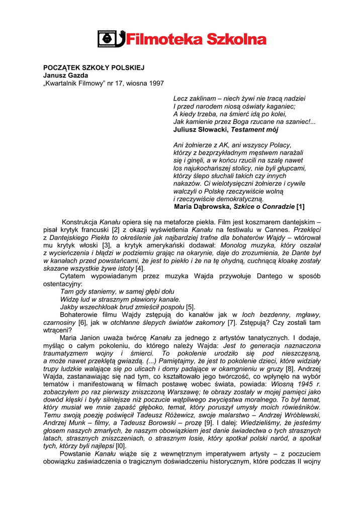 POCZĄTEK SZKOŁY POLSKIEJ Janusz Gazda „Kwartalnik Filmowy” nr 17, wiosna 1997 Lecz zaklinam – niech żywi nie tracą nadziei I przed narodem niosą oświaty kaganiec; A kiedy trzeba, na śmierć idą po kolei, Jak kamienie przez Boga rzucane na szaniec!... Juliusz Słowacki, Testament mój Ani żołnierze z AK, ani wszyscy Polacy, którzy z bezprzykładnym męstwem narażali się i ginęli, a w końcu rzucili na szalę nawet los najukochańszej stolicy, nie byli głupcami, którzy ślepo słuchali takich czy innych nakazów. Ci wielotysięczni żołnierze i cywile walczyli o Polskę rzeczywiście wolną i rzeczywiście demokratyczną. Maria Dąbrowska, Szkice o Conradzie [1] Konstrukcja Kanału opiera się na metaforze piekła. Film jest koszmarem dantejskim – pisał krytyk francuski [2] z okazji wyświetlenia Kanału na festiwalu w Cannes. Przeklęci z Dantejskiego Piekła to określenie jak najbardziej trafne dla bohaterów Wajdy – wtórował mu krytyk włoski [3], a krytyk amerykański dodawał: Monolog muzyka, który oszalał z wycieńczenia i błądzi w podziemiu grając na okarynie, daje do zrozumienia, że Dante był w kanałach przed powstańcami, że jest to piekło i że na tę ohydną, cuchnącą kloakę zostały skazane wszystkie żywe istoty [4]. Cytatem wypowiadanym przez muzyka Wajda przywołuje Dantego w sposób ostentacyjny: Tam gdy staniemy, w samej głębi dołu Widzę lud w strasznym pławiony kanale. Jakby wszechkloak brud zmieścił pospołu [5]. Bohaterowie filmu Wajdy zstępują do kanałów jak w loch bezdenny, mgławy, czarnosiny [6], jak w otchłanne ślepych światów zakomory [7]. Zstępują? Czy zostali tam wtrąceni? Maria Janion uważa twórcę Kanału za jednego z artystów tanatycznych. I dodaje, myśląc o całym pokoleniu, do którego należy Wajda: Jest to generacja naznaczona traumatyzmem wojny i śmierci. To pokolenie urodziło się pod nieszczęsną, a może nawet przeklętą gwiazdą. (...) Pamiętajmy, że jest to pokolenie dzieci, które widziały trupy ludzkie walające się po ulicach i domy padające w okamgnieniu w gruzy [8]. Andrzej Wajda, zastanawiając się nad tym, co kształtowało jego twórczość, co wpłynęło na wybór tematów i manifestowaną w filmach postawę wobec świata, powiada: Wiosną 1945 r. zobaczyłem po raz pierwszy zniszczoną Warszawę; te obrazy zostały w mojej pamięci jako dowód klęski i były silniejsze niż poczucie wątpliwego zwycięstwa moralnego. To był temat, który musiał we mnie zapaść głęboko, temat, który poruszył umysły moich rówieśników. Temu swoją poezję poświęcił Tadeusz Różewicz, swoje malarstwo – Andrzej Wróblewski, Andrzej Munk – filmy, a Tadeusz Borowski – prozę [9]. I dalej: Wiedzieliśmy, że jesteśmy głosem naszych zmarłych, że naszym obowiązkiem jest danie świadectwa o tych strasznych latach, strasznych zniszczeniach, o strasznym losie, który spotkał polski naród, a spotkał tych, którzy byli najlepsi [l0]. Powstanie Kanału wiąże się z wewnętrznym imperatywem artysty – z poczuciem obowiązku zaświadczenia o tragicznym doświadczeniu historycznym, które podczas II wojny światowej stało się udziałem Polski i jej mieszkańców. Kanał jest filmem fabularnym, całkowicie zainscenizowanym (sceny w kanałach były kręcone w dekoracjach wybudowanych w atelier w Łodzi), ale film ten rozpoczynają obrazy zaczerpnięte z kronik i filmów dokumentalnych (umieszczone jako tło pod napisy czołowe): panorama zburzonej Warszawy, sceny palenia i burzenia przez Niemców całych kwartałów miasta. Zazwyczaj zdjęcia dokumentalne stwarzają pozór obiektywnego spojrzenia na rzeczywistość. Gdy jednak w Kanale skojarzymy je z szokiem, jaki wywołał w świadomości twórcy – wiosną 1945 roku – widok zniszczonej Warszawy, zdjęcia te nabiorą w naszych oczach charakteru subiektywnego. Przestaną być cytatem z kronik, z utworów, które nakręcił inny reżyser, staną się cytatem z pamięci, ale także z wyobraźni twórcy Kanału. Wyobraźni naznaczonej przede wszystkim poczuciem rozpaczy i klęski. Spokojnie i rzeczowo deklaruję: Wajda zajmuje miejsce obok Bunuela i Bergmana. Pochodzi z plemienia Feuillade’ów i Borzage’ów, Vigo i Franju. Jest jedynym Europejczykiem, który ma gwałtowność tonu godną „Ziemi bez chleba” i „Los Ohidados” i to w epoce słabości i lenistwa intelektualnego zniewieściałych salonów literackich [11]. W ten sposób Ado Kyrou, wybitny francuski badacz sztuki kina, zareagował na pojawienie się Kanału Andrzeja Wajdy w Cannes, gdzie film ten zdobył drugą co do znaczenia nagrodę – Srebrną Palmę (przyznaną Kanałowi ex aequo z Siódmą pieczęcią Ingmara Bergmana) [l2]. Polski świadek tego zdarzenia zanotował, że Kanał w Cannes zadziwił swoją ostrością, nonkonformizmem, pesymizmem, a może i echami egzystencjalistycznych koncepcji, tym atrakcyjniejszych, że przychodzących ze wschodu [13]. Tak zaczynała się światowa sława Andrzeja Wajdy, ale ten canneński sukces był czymś więcej niż tylko wydarzeniem z biografii twórczej wybitnego filmowca polskiego. W dziejach każdej kinematografii zdarzają się momenty szczególne. Po okresie spokojnego rozwoju, czasem nawet stagnacji, urozmaicanej jedynie rzadkimi błyskami indywidualnych talentów, następuje nagle gwałtowny wybuch. Miłośnicy kina przeżywają kolejną przygodę artystyczną. Pojawia się grupa filmów ożywionych wspólnym tematem, wspólnym nastawieniem czy posłaniem, zrodzonych z podobnej pasji lub dotychczas ukrywanego kompleksu: społecznego, narodowego, moralnego. Filmy te w okamgnieniu burzą dotychczasowe konwencje, przynoszą coś nowego, szokują swoją innością, odmiennym od dotychczasowego spojrzeniem na otaczający świat, innym rodzajem ekspresji, innym rozumieniem pewnych zasad uważanych do niedawna za niewzruszone. Na ogół pojawienie się takiej wyrazistej grupy filmów jest rezulta