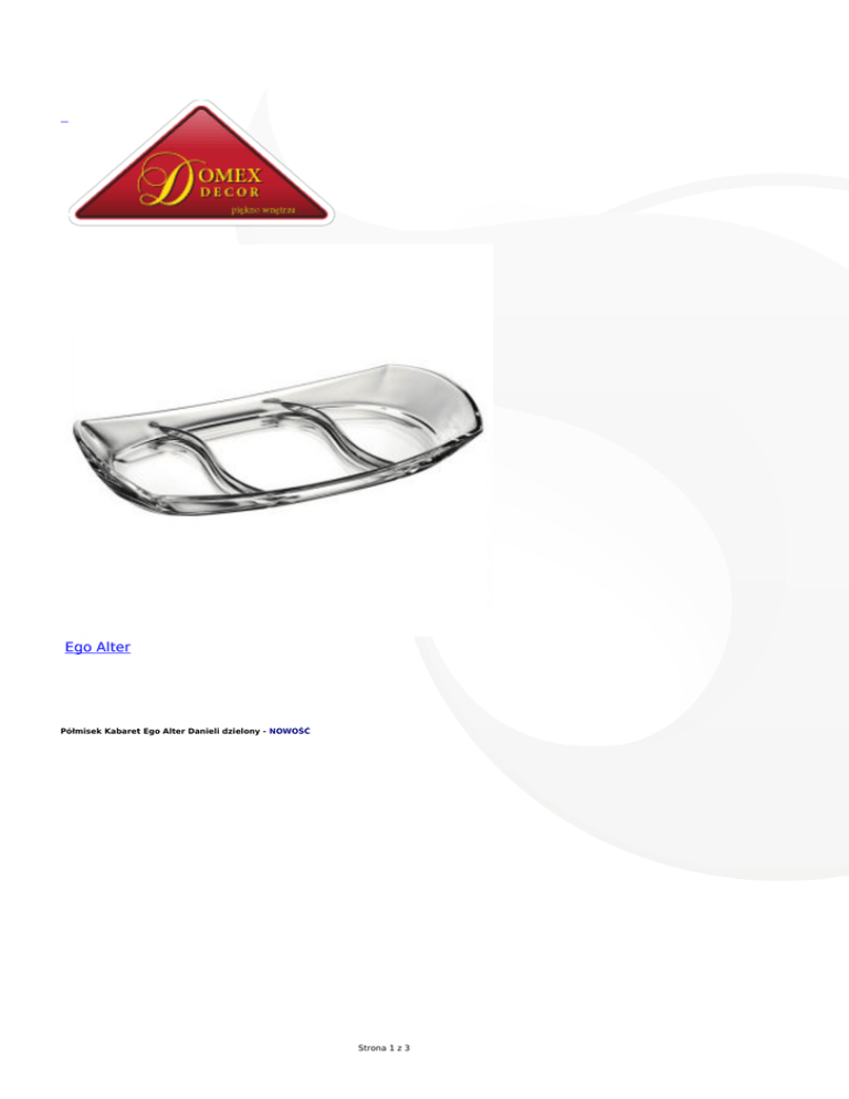 Ego Alter Półmisek Kabaret Ego Alter Danieli dzielony - NOWOŚĆ Strona 1 z 3 Strona 2 z 3 Najwyższa jakość szkła zapewnia absolutną przejrzystość i doskonałość. Dodatkowe informacje: długość 37cm szerokość 20cm wysokość 5cm (boki), 2,5cm (środek). Kabaret będzie idealnym uzupełnieniem nowoczesnego salonu, po umieszczeniu na stole wywoła poczucie luksusu, wypełniając przestrzeń artystycznym klimatem. Półmisek jest nowy, zapakowany w oryginalny karton, dzięki czemu będzie wspaniałym prezentem. Kabaret DANIELI to niepowtarzalny produkt włoskiej firmy Alter Ego - producenta luksusowego szkła. Strona 3 z 3