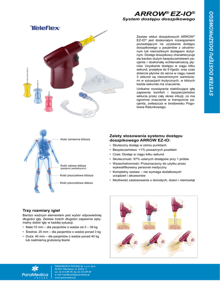 System dostępu doszpikowego Zestaw wkłuć doszpikowych ARROW® EZ-IO® jest doskonałym rozwiązaniem pozwalającym na uzyskanie dostępu doszpikowego u pacjentów z utrudnionym lub niemożliwym dostępem dożylnym. Dostęp doszpikowy charakteryzuje się bardzo dużym bezpieczeństwem pacjenta i doskonałą wchłanialnością płynów. Uzyskanie dostępu w ciągu kilku sekund, przepływ do 5 l/godz. oraz czas dotarcia płynów do serca w ciągu nawet 3 sekund są nieocenionymi wartościami w sytuacjach krytycznych, w których każda sekunda ma znaczenie. Unikalne rozwiązanie stabilizujące igłę zapewnia komfort i bezpieczeństwo wkłucia przez cały okres infuzji, co ma ogromne znaczenie w transporcie pacjenta, zwłaszcza w środowisku Pogotowia Ratunkowego. Kość ramienna bliższa Zalety stosowania systemu dostępu doszpikowego ARROW EZ-IO: • Skuteczny dostęp w ośmiu punktach. • Bezpieczeństwo: <1% poważnych powikłań • Czas: Dostęp w ciągu kilku sekund • Skuteczność: 97% udanych dostępów przy 1 próbie Kość udowa dalsza (pacjenci pediatryczni) Kość piszczelowa bliższa Kość piszczelowa dalsza Trzy rozmiary igieł Bardzo ważnym elementem jest wybór odpowiedniej długości igły. Zestaw trzech długości zapewnia optymalny dobór igły w każdej sytuacji. • Mała:15 mm – dla pacjentów o wadze od 3 – 39 kg • Średnia: 25 mm – dla pacjentów o wadze ponad 3 kg • Duża: 45 mm – dla pacjentów o wadze ponad 40 kg lub nadmierną grubością tkanki PARAMEDICA POLSKA Sp. z o.o. Sp.k. 02-815 Warszawa, ul. Żołny 11 tel. 22 313 09 39, fax 22 313 09 59 e-mail: [email protected] www.paramedica.pl • Wszechstronność: Przeznaczony do użytku przez wykwalifikowany personel medyczny • Kompletny zestaw – nie wymaga dodatkowych urządzeń i akcesoriów • Możliwość zastosowania u dorosłych, dzieci i niemowląt SYSTEM DOSTĘPU DOSZPIKOWEGO ARROW® EZ-IO® Jest to najbardziej efektywny punkt dostępu. W sytuacjach krytycznych lokalizacja ta jest optymalna w działaniach Zespołu Ratownictwa Medycznego. Głównymi zaletami dostępu są: • Przepływ do 5 l/godz. • 3 sekundy do serca – leki/płyny • Niski wskaźnik bólu • Mniejsze zapotrzebowanie na leki przeciwbólowe Materiały eksploatacyjne Szeroka gama igieł i akcesoriów umożliwia użycie urządzenia w każdych warunkach i na każdym pacjencie, co czyni go niezwykle wszechstronnym i zarazem bezpiecznym dla personelu medycznego oraz pacjenta. Nr kat. Opis Ilość szt. 9001-EE-001 Igła doszpikowa EZ-IO 25 mm 15G 1 9018-EE-001 Igła doszpikowa EZ-IO 15mm 15G 1 9079-EE-001 Igła doszpikowa EZ-IO 45 mm 15 G 1 9058 Napęd EZ-IO do igieł doszpikowych 1 9066 Stabilizator igły doszpikowej EZ 1 9013 Dren łączący do igły doszpikowej EZ-IO 1 W związku z ciągłym udoskonalaniem wyrobów, przedstawione w niniejszym materiale informacje oraz dane techniczne mają wyłącznie charakter orientacyjny i mogą ulec zmianie bez uprzedzenia. W celu zweryfikowania aktualności niniejszego materiału należy skontaktować się z przedstawicielem firmy Paramedica Polska Sp. z o.o. Sp.k. 02-815 Warszawa; ul. Żołny 11; tel: +48 22 313 09 39; www.paramedica.pl Powyższe zdjęcia, znaki firmowe oraz teksty należą do ich właścicieli. Zabrania się kopiowania i publikowania zdjęć i tekstów w całości i/lub części w internecie, prasie, mediach bez zgody na piśmie właścicieli. PARAMEDICA POLSKA Sp. z o.o. Sp.k. 02-815 Warszawa, ul. Żołny 11 tel. 22 313 09 39, fax 22 313 09 59 e-mail: [email protected] www.paramedica.pl EZ-IO: 0516WER.01 SYSTEM DOSTĘPU DOSZPIKOWEGO Dostęp poprzez kość ramienną