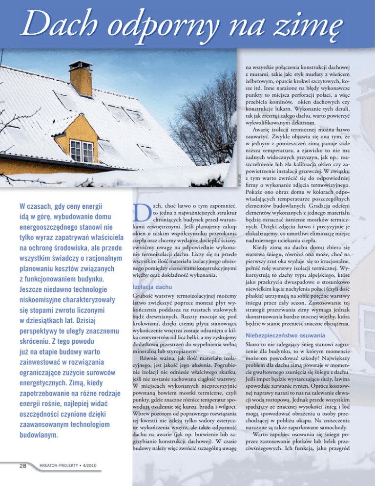 © VELUX Dach odporny na zimę W czasach, gdy ceny energii idą w górę, wybudowanie domu energooszczędnego stanowi nie tylko wyraz zapatrywań właściciela na ochronę środowiska, ale przede wszystkim świadczy o racjonalnym planowaniu kosztów związanych z funkcjonowaniem budynku. Jeszcze niedawno technologie niskoemisyjne charakteryzowały się stopami zwrotu liczonymi w dziesiątkach lat. Dzisiaj perspektywy te uległy znacznemu skróceniu. Z tego powodu już na etapie budowy warto zainwestować w rozwiązania ograniczające zużycie surowców energetycznych. Zimą, kiedy zapotrzebowanie na różne rodzaje energii rośnie, najlepiej widać oszczędności czynione dzięki zaawansowanym technologiom budowlanym. 28 KREATOR–PROJEKTY • 4/2010 D ach, choć łatwo o tym zapomnieć, to jedna z najważniejszych struktur chroniących budynek przed warunkami zewnętrznymi. Jeśli planujemy zakup okien o niskim współczynniku przenikania ciepła oraz chcemy wydajnie docieplić ściany, zwróćmy uwagę na odpowiednie wykonanie termoizolacji dachu. Liczy się tu przede wszystkim ilość materiału izolacyjnego ułożonego pomiędzy elementami konstrukcyjnymi więźby oraz dokładność wykonania. Izolacja dachu Grubość warstwy termoizolacyjnej możemy łatwo zwiększyć poprzez montaż płyt wykończenia poddasza na rusztach stalowych bądź drewnianych. Ruszty mocuje się pod krokwiami, dzięki czemu płyta stanowiąca wykończenie wnętrza zostaje odsunięta o kilka centymetrów od lica belki, a my zyskujemy dodatkową przestrzeń do wypełnienia wełną mineralną lub styropianem. Równie ważna, jak ilość materiału izolacyjnego, jest jakość jego ułożenia. Pogrubienie izolacji nie odniesie właściwego skutku, jeśli nie zostanie zachowana ciągłość warstwy. W miejscach wykonanych nieprecyzyjnie powstaną bowiem mostki termiczne, czyli punkty, gdzie znaczne różnice temperatur spowodują osadzanie się kurzu, brudu i wilgoci. Wbrew pozorom od poprawnego rozwiązania tej kwestii nie zależą tylko walory estetyczne wykończenia wnętrz, ale także odporność dachu na awarie (jak np. butwienie lub zagrzybianie konstrukcji dachowej). W czasie budowy należy więc zwrócić szczególną uwagę na wszystkie połączenia konstrukcji dachowej z murami, takie jak: styk murłaty z wieńcem żelbetowym, oparcie krokwi szczytowych, kosze itd. Inne narażone na błędy wykonawcze punkty to miejsca perforacji połaci, a więc przebicia kominów, okien dachowych czy konstrukcje lukarn. Wykonanie tych detali, tak jak zresztą i całego dachu, warto powierzyć wykwalifikowanym dekarzom. Awarię izolacji termicznej można łatwo zauważyć. Zwykle objawia się ona tym, że w jednym z pomieszczeń zimą panuje stale niższa temperatura, a zjawisko to nie ma żadnych widocznych przyczyn, jak np.: rozszczelnienie lub zła kalibracja okien czy zapowietrzenie instalacji grzewczej. W związku z tym warto zwrócić się do odpowiedniej firmy o wykonanie zdjęcia termowizyjnego. Pokaże ono obraz domu w kolorach odpowiadających temperaturze poszczególnych elementów budowlanych. Gradacja odcieni elementów wykonanych z jednego materiału będzie oznaczać istnienie mostków termicznych. Dzięki zdjęciu łatwo i precyzyjnie je zlokalizujemy, co umożliwi eliminację miejsc nadmiernego uciekania ciepła. Kiedy zimą na dachu domu zbiera się warstwa śniegu, również ona może, choć na pierwszy rzut oka wydaje się to irracjonalne, pełnić rolę warstwy izolacji termicznej. Wykorzystują to dachy typu alpejskiego, które jako przekrycia dwuspadowe o stosunkowo niewielkim kącie nachylenia połaci (czyli dość płaskie) utrzymują na sobie potężne warstwy śniegu przez cały sezon. Zastosowanie tej strategii przetrwania zimy wymaga jednak skonstruowania bardzo mocnej więźby, która będzie w stanie przenieść znaczne obciążenia. Niebezpieczeństwo osuwania Skoro to nie zalegający śnieg stanowi zagrożenie dla budynku, to w którym momencie może on powodować szkody? Największy problem dla dachu zimą powstaje w momencie gwałtownego zsunięcia się śniegu z dachu. Jeśli impet będzie wystarczająco duży, lawina spowoduje zerwanie rynien. Oprócz kosztownej naprawy narazi to nas na zalewanie elewacji wodą roztopową. Jednak przede wszystkim spadający ze znacznej wysokości śnieg i lód mogą spowodować obrażenia u osoby przechodzącej w pobliżu okapu. Na zniszczenia narażone są także zaparkowane samochody. Warto zapobiec osuwaniu się śniegu poprzez zastosowanie płotków lub belek przeciwśniegowych. Ich funkcją, jako przegród Instalacje antyoblodzeniowe © RAYCHEM Stosunkowo nowym rozwiązaniem budowlanym są elektryczne systemy antyoblodzeniowe montowane w rynnach i rurach spustowych. Rozłożone wzdłuż tych elementów kable rozgrzewają się, dzięki czemu lód i sople ulegają roztopieniu. Zapobiega to nadmiernemu obciążeniu rynien i chroni je przed zerwaniem. W końcu zima zamieni się w przedwiośnie i zamiast ze śniegiem, nasz dach będzie musiał wykazać się odpornością na wodę. I to wodę w najgorszej postaci, gdyż nie spływającą swobodnie, a stojącą. Wśród resztek śniegu i lodu łatwo pojawiają się zatory i zastoiny. Zgromadzona woda ma wtedy możliwość głębokiej penetracji pokrycia dachu, co nasilone jest przez zjawisko podciągania kapilarnego. Najlepszą konstrukcją dachową zapobiegającą zagrożeniom związanym z okresem roztopów jest kanał wentylacyjny umiejscowiony pomiędzy kontrłatami a warstwą izolacji przeciwwodnej. Powietrze, którego przepływ © VELUX usytuowanych w poprzek połaci dachu, jest zatrzymywanie lub przynajmniej spowolnienie spadającej masy. Płotki i belki mocuje się do krokwi za pomocą uchwytów. Najlepiej przewidzieć ich montaż jeszcze na etapie układania pokrycia dachowego. Maksymalny rozstaw wsporników to 80 cm. Ustala się go w zależności od kąta nachylenia i długości połaci dachu