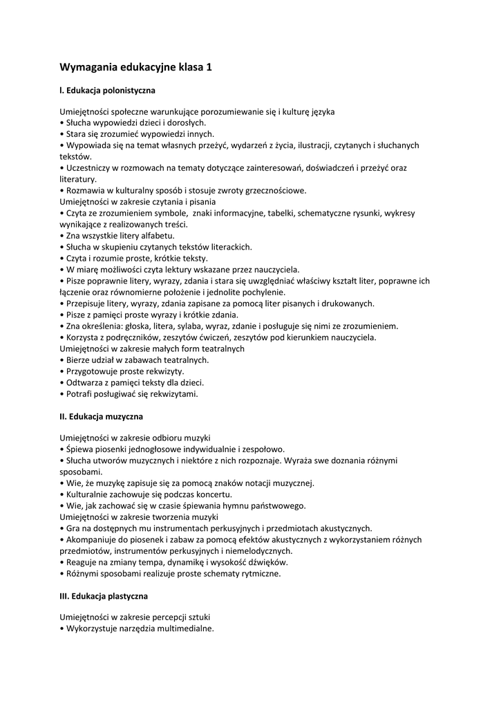 Wymagania edukacyjne klasa 1 l. Edukacja polonistyczna Umiejętności społeczne warunkujące porozumiewanie się i kulturę języka • Słucha wypowiedzi dzieci i dorosłych. • Stara się zrozumieć wypowiedzi innych. • Wypowiada się na temat własnych przeżyć, wydarzeń z życia, ilustracji, czytanych i słuchanych tekstów. • Uczestniczy w rozmowach na tematy dotyczące zainteresowań, doświadczeń i przeżyć oraz literatury. • Rozmawia w kulturalny sposób i stosuje zwroty grzecznościowe. Umiejętności w zakresie czytania i pisania • Czyta ze zrozumieniem symbole, znaki informacyjne, tabelki, schematyczne rysunki, wykresy wynikające z realizowanych treści. • Zna wszystkie litery alfabetu. • Słucha w skupieniu czytanych tekstów literackich. • Czyta i rozumie proste, krótkie teksty. • W miarę możliwości czyta lektury wskazane przez nauczyciela. • Pisze poprawnie litery, wyrazy, zdania i stara się uwzględniać właściwy kształt liter, poprawne ich łączenie oraz równomierne położenie i jednolite pochylenie. • Przepisuje litery, wyrazy, zdania zapisane za pomocą liter pisanych i drukowanych. • Pisze z pamięci proste wyrazy i krótkie zdania. • Zna określenia: głoska, litera, sylaba, wyraz, zdanie i posługuje się nimi ze zrozumieniem. • Korzysta z podręczników, zeszytów ćwiczeń, zeszytów pod kierunkiem nauczyciela. Umiejętności w zakresie małych form teatralnych • Bierze udział w zabawach teatralnych. • Przygotowuje proste rekwizyty. • Odtwarza z pamięci teksty dla dzieci. • Potrafi posługiwać się rekwizytami. II. Edukacja muzyczna Umiejętności w zakresie odbioru muzyki • Śpiewa piosenki jednogłosowe indywidualnie i zespołowo. • Słucha utworów muzycznych i niektóre z nich rozpoznaje. Wyraża swe doznania różnymi sposobami. • Wie, że muzykę zapisuje się za pomocą znaków notacji muzycznej. • Kulturalnie zachowuje się podczas koncertu. • Wie, jak zachować się w czasie śpiewania hymnu państwowego. Umiejętności w zakresie tworzenia muzyki • Gra na dostępnych mu instrumentach perkusyjnych i przedmiotach akustycznych. • Akompaniuje do piosenek i zabaw za pomocą efektów akustycznych z wykorzystaniem różnych przedmiotów, instrumentów perkusyjnych i niemelodycznych. • Reaguje na zmiany tempa, dynamikę i wysokość dźwięków. • Różnymi sposobami realizuje proste schematy rytmiczne. III. Edukacja plastyczna Umiejętności w zakresie percepcji sztuki • Wykorzystuje narzędzia multimedialne. • Wypowiada się w różnorodnych technikach plastycznych na płaszczyźnie i w przestrzeni, prezentując sceny np. z życia rodzinnego i szkolnego. Umiejętności w zakresie ekspresji przez sztukę • Chętnie podejmuje różnorodne działania związane z edukacją plastyczno-techniczną. • Posługuje się takimi środkami wyrazu plastycznego, jak kształt, barwa, faktura. • Przedstawia różnymi środkami i technikami plastycznymi barwne kompozycje. •Koloruje obrazki, uzupełnia je nalepkami zgodnie z instrukcją. • Ilustruje sceny realne i fantastyczne inspirowane wyobraźnią, literaturą, muzyką, otoczeniem społecznym i przyrodniczym. • Wykonuje proste projekty plastyczne w zespole. • Wykonuje i wykorzystuje proste rekwizyty. • Tworzy przedmioty charakterystyczne dla swojego regionu. • Tnie papier po liniach. • Projektuje i wykonuje różnorodne formy użytkowe. Umiejętności w zakresie recepcji sztuki • Stara się właściwie organizować swoje stanowisko pracy. • Porządkuje miejsce pracy po zakończeniu działania. • Korzysta z nowych technologii informacyjnych. • Rozsądnie korzysta z telewizji i komputera. • Rozpoznaje wybrane dziedziny sztuki: architekturę (architekturę zieleni), malarstwo, rzeźbę, grafikę i krótko wypowiada się na ich temat. IV. Edukacja społeczno-przyrodnicza Umiejętności społeczne • Ocenia postępowanie swoje i innych, potrafi odróżnić, co jest dobre, a co złe. • Rozumie, że należy mówić prawdę. • Właściwie reaguje na sygnały alarmowe, sytuacje niebezpieczne. • Dba o dobro własne i innych. • Buduje pozytywny obraz samego siebie. • Przeżywa satysfakcję z własnego działania i osiąganych wyników. • Wykazuje poczucie przynależności do rodziny, społeczności szkolnej, lokalnej. • Przestrzega przepisów i zasad bezpieczeństwa w szkole, domu, na ulicy..., wie, gdzie można organizować zabawy. • Podejmuje próby samooceny. • Wykazuje szacunek i zrozumienie dla innych osób. • Szanuje pracę własną i innych, wie, że pieniądze otrzymuje się za pracę. • Rozumie, że należy dostosowywać swe oczekiwania do realiów ekonomicznych rodziny. • Podejmuje zadania wymagające troskliwości i opiekuńczości. • Akceptuje różnice między ludźmi, uczy się zachowań tolerancyjnych i szacunku dla odmienności. • Uczy się, jak właściwie się zachowywać w sytuacji zagrożenia ze strony innych ludzi. • Wie, do kogo zwrócić się o pomoc. • Współpracuje z innymi w różnych sytuacjach. • Zna status swojej miejscowości (wieś, miasto). • Zna zawody osób, które mogą pomóc w trudnych i niebezpiecznych sytuacjach. • Zna swoją narodowość i symbole narodowe oraz rozpoznaje flagę i hymn Unii Europejskiej. • Wie, że mieszka w Polsce, a Polska znajduje się w Europie. Umiejętności w zakresie postrzegania przyrody • Rozpoznaje powszechnie znane rośliny i zwierzęta w różnych środowiskach przyrodniczych. • Potrafi wymienić sposoby przystosowania się zwierząt do poszczególnych pór roku. • Potrafi wymienić podstawowe warunki niezbędne do życia zwierzętom i roślinom. • Samodzielnie prowadzi proste hodowle. • Segreguje śmieci. • Uzasadnia potrzebę oszczędzania wody. • Wie, że należy szanować przyrodę ożywioną i nieożywioną. • Zna nazwy niektórych roślin i zwierząt chronionych. • Zna zasady prowadzenia prostych h