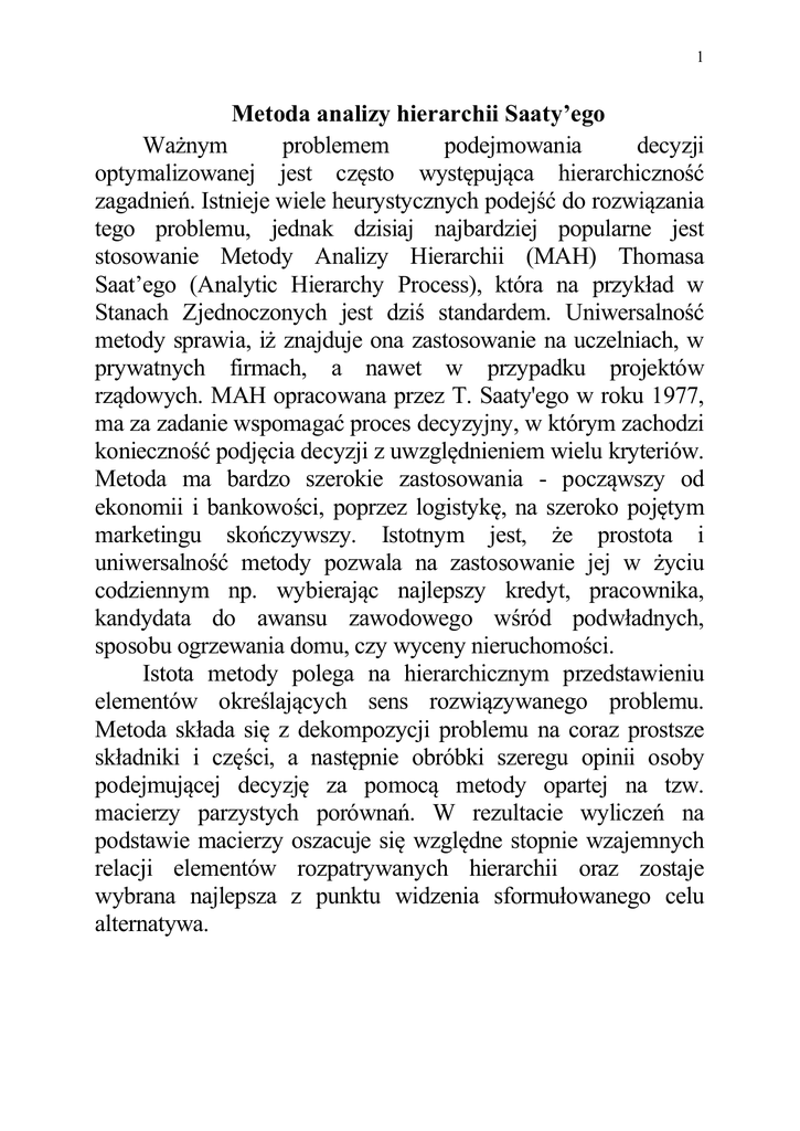 1 Metoda analizy hierarchii Saaty’ego Ważnym problemem podejmowania decyzji optymalizowanej jest często występująca hierarchiczność zagadnień. Istnieje wiele heurystycznych podejść do rozwiązania tego problemu, jednak dzisiaj najbardziej popularne jest stosowanie Metody Analizy Hierarchii (MAH) Thomasa Saat’ego (Analytic Hierarchy Process), która na przykład w Stanach Zjednoczonych jest dziś standardem. Uniwersalność metody sprawia, iż znajduje ona zastosowanie na uczelniach, w prywatnych firmach, a nawet w przypadku projektów rządowych. MAH opracowana przez T. Saaty'ego w roku 1977, ma za zadanie wspomagać proces decyzyjny, w którym zachodzi konieczność podjęcia decyzji z uwzględnieniem wielu kryteriów. Metoda ma bardzo szerokie zastosowania - począwszy od ekonomii i bankowości, poprzez logistykę, na szeroko pojętym marketingu skończywszy. Istotnym jest, że prostota i uniwersalność metody pozwala na zastosowanie jej w życiu codziennym np. wybierając najlepszy kredyt, pracownika, kandydata do awansu zawodowego wśród podwładnych, sposobu ogrzewania domu, czy wyceny nieruchomości. Istota metody polega na hierarchicznym przedstawieniu elementów określających sens rozwiązywanego problemu. Metoda składa się z dekompozycji problemu na coraz prostsze składniki i części, a następnie obróbki szeregu opinii osoby podejmującej decyzję za pomocą metody opartej na tzw. macierzy parzystych porównań. W rezultacie wyliczeń na podstawie macierzy oszacuje się względne stopnie wzajemnych relacji elementów rozpatrywanych hierarchii oraz zostaje wybrana najlepsza z punktu widzenia sformułowanego celu alternatywa. 2 Algorytm MAH składa się z pięciu podstawowych etapów: budowy modelu hierarchicznej struktury decyzyjnej oceny ważności kryteriów wyboru, oceny alternatyw na podstawie kryterium wyboru, sprawdzenia spójności danych, oceny alternatyw. Budowa modelu hierarchicznej struktury decyzyjnej. W ramach MAH powinien być wykonany rozkład problemu decyzyjnego w postaci hierarchicznej struktury decyzyjnej: określenie celu analizy, zdefiniowanie kryteriów oceny, określenie alternatyw. Dane do wyboru najlepszej karty kredytowej 19,90% 50 zl Okres Sieć nieopro bankom centowa a nego tów kredytu 87 54 dni 16,90 % 38zl 200 52 dni 21.90% 70zl 150 56 dni Sieć Oprocentowa placów nie Opłaty ek kredytu mBank 25 Bank Milleniu 50 m Bank 62 BPH 3 KARTY KREDYT OWE SZEROKA SIEĆ NISKIE PLACÓWEK OPROCENTOWA NIE KREDYTU mBANK NISKI KOSZT PROWADZENIA KARTY BANK MILLENIUM OKRES ILOŚĆ NIEOPROCENTOW BANKOMATÓW NEGO KREDYTU BANK BPH Ocena ważności kryteriów wyboru Porównanie kryteriów odbywa się w parach na podstawie subiektywnego określenia, które z nich i w jakim stopniu przeważa nad drugim. Przyjmuje się przy tym 9-stopniową skalę ocen ważności kryteriów: 1 - oba elementy są równoznaczne, 2 - jeden element ma niewielką przewagę nad drugim, 3- jeden element ma umiarkowaną przewagę nad drugim, 4 - jeden element ma silną przewagę nad drugim, 5 - jeden element ma znaczną przewagę nad drugim 6 - jeden element ma silną przewagę nad drugim, 7 - jeden element ma bardzo silną przewagę nad drugim, 8- jeden element ma bardzo silną, ale nie absolutną przewagę nad drugim, 9 - jeden element ma absolutną przewagę nad drugim. Oceny kryteriów o relacjach odwrotnych są odwrotne do podanych powyżej ocen. Oceny te tworzą macierz parzystych porównań, w której wierszom i kolumną odpowiadają konkretne elementy modelu hierarchicznej struktury decyzyjnej. 4 W macierzy tej na głównej przekątnej znajdują się wartości 1. Liczbę porównań, których należy dokonać przedstawia wzór: c n(n 1) , 2 (1) gdzie: n - liczba kryteriów Utworzenie macierzy parzystych porównań kryteriów wiąże się z wyliczeniem ich względnej ważności. W tym celu stosuje się wzór na współczynnik względnej ważności: n n j a ij j 1 n n n a n i 1 (2) ij j 1 Suma współczynników względnej ważności musi być równa lub zbliżona do liczby kryteriów. (3) n n j 1 j Macierz parzystych porównań aij K1 K2 K3 K4 K5 K1 1 1/7 1/3 3 1/5 K2 7 1 5 9 3 K3 3 1/5 1 5 1/3 K4 1/3 1/9 1/5 1 1/7 K5 5 1/3 3 7 1 5 Korzystając ze wzoru (2) liczymy kolejne współczynniki: 5 1 1 / 7 1 / 3 3 1 / 5 0,491 5 7 1 5 9 3 3,936 5 3 1 / 5 1 5 1 / 3 1 5 1 / 3 1 / 9 1 / 5 1 1 / 7 0.254 5 5 1 / 3 3 7 1 2,036 7,717 0,491 0,064 5 0,32 7,717 3,936 0,51 5 2,55 7,717 1 0,13 5 0,65 7,717 0,254 0,33 5 0,165 7,717 2,036 0,264 5 1,32 7,717 1 2 3 4 5 5 Ocena alternatyw na podstawie kryterium wyboru W tym kroku macierz parzystych porównań alternatyw tworzona jest dla każdego kryterium. Skala ocen ważności alternatyw jest podobna do stosowanej w przypadku oceny ważności kryteriów: 1 - oba elementy równoznacznie spełniają kryterium, 2 - jeden element z niewielką przewagą nad drugim spełnia kryterium, 3 - jeden element z umiarkowaną przewagą nad drugim spełnia kryterium, 4 - jeden element z umiarkowanie silną przewagą nad drugim spełnia kryterium, 6 5 - jeden element ze znaczną przewagą nad drugim spełnia kryterium, 6 - jeden element z silną przewagą nad drugim spełnia kryterium, 7 - jeden element z bardzo silną przewagą nad drugim spełnia kryterium, 8 - jeden element z bardzo silną, ale nie absolutną przewagą nad drugim spełnia kryterium, 9 - jeden element z absolutną przewagą nad drugim spełnia kryterium. Oceny alternatyw o relacjach odwrotnych podobnie jak oceny kryteriów są odwrotne do podanych powyżej ocen. Liczba porównań: c m(m 1) n, 2 (4) gdzie: n - liczba kryteriów, m - liczba alternatyw. Macierze parzystych porównań alternatyw wykonuje się tak samo jak dla kryteriów. Wzór na wyliczenie współczynnika względnej ważności: m m j a ij j 1 m m m a m i 1 (5) ij j 1 Suma współczynników względnej ważności jest równa lub bliska liczbie alternatyw: n j 1 j m (6) 7 Ocena alternatyw dla K1( szeroka sieć placówek) mBank Mil