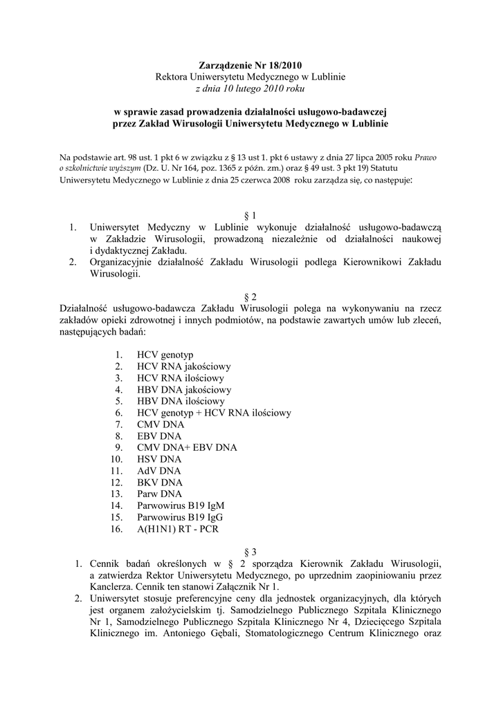 Zarządzenie Nr 18/2010 Rektora Uniwersytetu Medycznego w Lublinie z dnia 10 lutego 2010 roku w sprawie zasad prowadzenia działalności usługowo-badawczej przez Zakład Wirusologii Uniwersytetu Medycznego w Lublinie Na podstawie art. 98 ust. 1 pkt 6 w związku z § 13 ust 1. pkt 6 ustawy z dnia 27 lipca 2005 roku Prawo o szkolnictwie wyŜszym (Dz. U. Nr 164, poz. 1365 z późn. zm.) oraz § 49 ust. 3 pkt 19) Statutu Uniwersytetu Medycznego w Lublinie z dnia 25 czerwca 2008 roku zarządza się, co następuje: 1. 2. §1 Uniwersytet Medyczny w Lublinie wykonuje działalność usługowo-badawczą w Zakładzie Wirusologii, prowadzoną niezaleŜnie od działalności naukowej i dydaktycznej Zakładu. Organizacyjnie działalność Zakładu Wirusologii podlega Kierownikowi Zakładu Wirusologii. §2 Działalność usługowo-badawcza Zakładu Wirusologii polega na wykonywaniu na rzecz zakładów opieki zdrowotnej i innych podmiotów, na podstawie zawartych umów lub zleceń, następujących badań: 1. 2. 3. 4. 5. 6. 7. 8. 9. 10. 11. 12. 13. 14. 15. 16. HCV genotyp HCV RNA jakościowy HCV RNA ilościowy HBV DNA jakościowy HBV DNA ilościowy HCV genotyp + HCV RNA ilościowy CMV DNA EBV DNA CMV DNA+ EBV DNA HSV DNA AdV DNA BKV DNA Parw DNA Parwowirus B19 IgM Parwowirus B19 IgG A(H1N1) RT - PCR §3 1. Cennik badań określonych w § 2 sporządza Kierownik Zakładu Wirusologii, a zatwierdza Rektor Uniwersytetu Medycznego, po uprzednim zaopiniowaniu przez Kanclerza. Cennik ten stanowi Załącznik Nr 1. 2. Uniwersytet stosuje preferencyjne ceny dla jednostek organizacyjnych, dla których jest organem załoŜycielskim tj. Samodzielnego Publicznego Szpitala Klinicznego Nr 1, Samodzielnego Publicznego Szpitala Klinicznego Nr 4, Dziecięcego Szpitala Klinicznego im. Antoniego Gębali, Stomatologicznego Centrum Klinicznego oraz klinik na bazie obcej: Zakładu Onkologii oraz Katedry i Kliniki Ginekologii i Endokrynologii Ginekologicznej. Cennik ten stanowi Załącznik nr 2. 3. Ceny badań, o których mowa w ust. 1, wynikają z kalkulacji kosztów badania składających się z: - kosztów materiałów: odczynniki, testy, sprzęt laboratoryjny, - kosztów wynagrodzeń, - narzutu kosztów pośrednich – 20%, - zysku do 20% w zaleŜności od badania. 1. 2. §4 Obsługę administracyjną, finansową i techniczną działalności usługowo-badawczej Zakładu Wirusologii prowadzą jednostki organizacyjne Uczelni, których pracownicy za te czynności wynagradzani są w ramach narzutu kosztów pośrednich. Zakład Wirusologii korzysta z konta bankowego Uczelni w PKO S.A. O Lublin Nr 96 1240 5497 1111 0000 5003 9148. §5 1. Umowy z podmiotami zlecającymi Uczelni badania, na wniosek Kierownika Zakładu Wirusologii zaakceptowany przez Prorektora ds. Nauki, w imieniu Uniwersytetu podpisuje Kanclerz przy kontrasygnacie Kwestora bądź odpowiednio osoby zastępujące. 2. Kierownik Zakładu Wirusologii monitoruje regulowanie zobowiązań przez podmioty, na rzecz których wykonywane są badania poprzez stały kontakt z Działem Księgowości. 3. W przypadku istnienia zaległości w płatnościach, o których mowa w ust. 2, za 2 miesiące, realizacja kolejnych badań od tego samego zleceniodawcy nie moŜe być podjęta bez pisemnej zgody Władz Uczelni. 4. Badania określone w § 2, zlecone bez zawierania pisemnej umowy, rejestrowane są w kasie fiskalnej. Zlecone badania mogą być wykonane wyłącznie po pobraniu przedpłaty w wysokości ceny badania. Wydanie wyniku badania nie moŜe nastąpić bez uregulowania całkowitej naleŜności za usługę. 1. 2. 1. 2. 3. §6 W ramach prowadzonej przez Uczelnię działalności usługowo-badawczej, na prace wykraczające poza obowiązki słuŜbowe poszczególnych pracowników, moŜe być zawarta umowa zlecenie. Umowy zlecenia, o których mowa w ust. 1, na wniosek Kierownika Zakładu Wirusologii zaakceptowany przez Prorektora ds. Nauki, w imieniu Uniwersytetu podpisuje Kanclerz przy kontrasygnacie Kwestora. §7 Z tytułu umów zleceń, o których mowa w § 6 pracownicy otrzymywać będą wynagrodzenie naliczane wg zróŜnicowanych stawek, których wysokość zaleŜy od rodzaju wykonywanego badania i kwalifikacji zawodowych poszczególnych pracowników. (Załącznik Nr 3 i 3a). Zmiana stawek określonych w Załącznikach następuje na wniosek Kierownika Zakładu Wirusologii w trybie zmiany zarządzenia. Wynagrodzenia z tytułu wykonywanych umów zleceń na koniec kaŜdego miesiąca wypłacane są na podstawie przedłoŜonych rachunków podpisanych przez Kierownika Zakładu Wirusologii i zatwierdzonych do wypłaty przez Kanclerza. 4. Dokumenty rozliczające wynagrodzenia z tytułu umów-zleceń, będące podstawą sporządzenia rachunku, są archiwizowane w Zakładzie Wirusologii. §8 Dysponentem wypracowanego zysku jest Rektor. Kierownik Katedry moŜe wnioskować do Rektora o wyraŜenie zgody na wykorzystanie tych środków w ramach działalności statutowej prowadzonej przez Katedrę. §9 W Zarządzeniu Nr 17/2009 Rektora Uniwersytetu Medycznego w Lublinie z 10 marca 2009 roku § 3 ust. 2 pkt 3 lit. b otrzymuje brzmienie: „b) dla kosztów badań wykonywanych dla pozostałych zleceniodawców – 20% ”. § 10 Tracą moc dotychczasowe przepisy dotyczące działalności usługowej Zakładu Wirusologii wprowadzone Zarządzeniem Nr 54/2004 Rektora z dnia 15 września 2004 roku w sprawie zasad prowadzenia działalności usługowo-badawczej przez Zakład Wirusologii Akademii Medycznej w Lublinie. § 11 Zarządzenie wchodzi w Ŝycie z dniem podpisania z mocą obowiązującą od 1 marca 2010 roku.