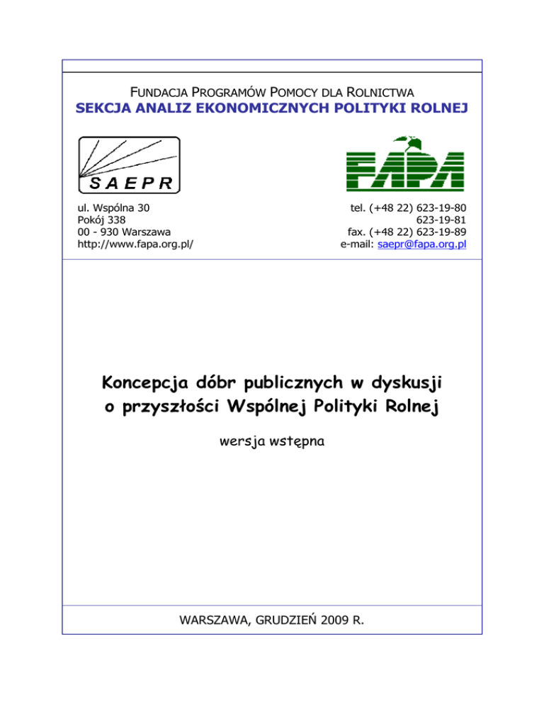 FUNDACJA PROGRAMÓW POMOCY DLA ROLNICTWA SEKCJA ANALIZ EKONOMICZNYCH POLITYKI ROLNEJ ul. Wspólna 30 Pokój 338 00 - 930 Warszawa http://www.fapa.org.pl/ tel. (+48 22) 623-19-80 623-19-81 fax. (+48 22) 623-19-89 e-mail: [email protected] Koncepcja dóbr publicznych w dyskusji o przyszłości Wspólnej Polityki Rolnej wersja wstępna WARSZAWA, GRUDZIEŃ 2009 R. Spis treści 1. Wielofunkcyjność rolnictwa europejskiego ....................................................................... 3 2. Klasyfikacja dóbr w zależności od stopnia ich wykorzystania przez społeczeństwo ........ 3 3. Definicja dóbr publicznych ................................................................................................ 4 4. Globalne dobra publiczne dostarczane przez rolnictwo ..................................................... 5 5. Lokalne dobra publiczne dostarczane przez rolnictwo ...................................................... 5 6. Warianty wynagradzania za dobra publiczne..................................................................... 6 7. Problemy z wynagradzaniem za dobra publiczne .............................................................. 6 1. Wielofunkcyjność rolnictwa europejskiego Podstawową cechą europejskiego modelu rolnictwa jest jego wielofunkcyjność. Tradycyjny rolnik europejski z konieczności pełnił wiele funkcji. Słaby rozwój otoczenia rolnictwa wymagał od niego nie tylko produkcji płodów rolnych, ale także ich przetwarzania, wytwarzania narzędzi, produkcji odzieży itd. Późniejsze procesy specjalizacji i intensyfikacji rolnictwa doprowadziły do drastycznego ograniczenia funkcji rolnika do tych podstawowych polegających na produkcji rolniczej. Do funkcji produkcyjnych należy zaliczyć produkcję żywności, surowców przemysłowych (bawełna, len, wełna itd.), pasz oraz odnawialnych źródeł energii, w tym głównie biomasy. Za tę funkcję rolnik jest wynagradzany w oparciu o mechanizm rynkowy, tj. w ramach transakcji kupna–sprzedaży. Obecnie wyraźnie traci na znaczeniu funkcja rolnictwa jako głównego sektora na obszarach wiejskich. Dzisiaj Europejczycy w odróżnieniu od okresu powojennego nie napotykają problemu niedobory żywności, natomiast coraz większe znaczenie przywiązują do jakości życia, bezpieczeństwa i wypoczynku. W rezultacie dzisiejszy rolnik ponownie rozszerza zakres wykonywanych funkcji, świadcząc coraz szerszy zakres usług dla ogółu społeczeństwa (dostarczając dobra publiczne)1. Dodatkowe funkcje rolnictwa europejskiego Funkcje środowiskowe 1. Produkcja tlenu i pochłanianie (sekwestracja) węgla. Rośliny uprawne produkują tlen w procesie fotosyntezy oraz pochłaniają dwutlenek węgla, który następnie jest magazynowany w glebie w formie węgla i próchnicy. 2. Ochrona wód gruntowych jako źródła wody pitnej. 3. Ochrona gruntów (zapobieganie degradacji, walka z erozją). 4. Ochrona bioróżnorodności (pszczelarstwo, ochrona siedlisk ptaków). 5. Ochrona krajobrazu (drzewostanu, zabytkowych budynków itd.). Funkcje społeczno-kulturowe 1. Tworzenie warunków do rekreacji i wypoczynku. 2. Ochrona dziedzictwa kulturowego wsi. 3. Tworzenie miejsc pracy na obszarach wiejskich. Te funkcje związane są z dostarczaniem dóbr publicznych. Mechanizm rynkowy nie jest w stanie dostarczać te dobra publiczne2. 2. Klasyfikacja dóbr w zależności od stopnia ich wykorzystania przez społeczeństwo W ekonomii mianem dóbr określa się środki, które mogą być wykorzystane do zaspokajania potrzeb ludzkich. Najczęściej można je sprzedać lub kupić w określonej ilości. 1 2 WPR – nowoczesna polityka rozwoju rolnictwa I obszarów wiejskich (2007) FAPA, Warszawa Baldock D. (2009) Conceptual Framework on Public Goods Provided Through Agriculture in the EU. Working Document for the Meeting of the Technical Working Group 'Public Goods' ‐ European Network for Rural Development Tabela. Klasyfikacja dóbr w zależności od stopnia ich wykorzystania przez społeczeństwo stopień wykorzystywania przez społeczeństwo niski średni wysoki dobra prywatne dobra klubowe lokalne dobra publiczne globalne dobra publiczne konkurencyjne w konsumpcji niekonkurencyjne w konsumpcji dla małej grupy użytkowników niekonkurencyjne w konsumpcji z wysokim ryzykiem wyczerpania przy zaistnieniu nadmiaru konsumentów niekonkurencyjne w konsumpcji, chociaż ryzyko wyczerpania przy nadmiarze konsumentów jest możliwe wyłączają z konsumpcji nie będących właścicielami grono użytkowników ograniczone, wyłączają innych z konsumpcji można wyłączyć innych z konsumpcji jedynie ponosząc wysokie koszty brak możliwości wyłączenia innych z konsumpcji np. produkty rolne np. parki prywatne np. regionalny krajobraz, lokalne źródła wody pitnej np. klimat, bioróżnorodność, Źródło: Conceptual Framework on Public Goods Provided Through Agriculture in the EU. Working Document of the Technical Working Group 'Public Goods' - European Network for Rural Development, 2009 3. Definicja dóbr publicznych W uproszczeniu można powiedzieć, że dobra publiczne to dobra pożądane przez społeczeństwo, a których mechanizm rynkowy nie jest w stanie dostarczyć. Według Paula Samuelsona (1954)3 są to dobra o następujących cechach: • nikt nie jest wyłączany z korzyści wynikających z ich użytkowania (brak wyłączenia z konsumpcji); • powiększenie się liczby użytkowników nie eliminuje ani nie pomniejsza możliwości korzystania z danego dobra przez wszystkich użytkowników (nie są konkurencyjne w konsumpcji). W przypadku rolnictwa mamy do czynienia z dobrami publicznymi wytwarzanymi na gruntach prywatnych, chociaż ziemia jest dziedzictwem ogólnonarodowym. Część korzyści wynikających z działalności rolnika jest przenoszona na osoby trzecie bez jakiejkolwiek rekompensaty. Są to tzw. zewnętrzne efekty gospodarowania4. Jednak bez odpowiednich zachęt (nakładów społecznych) dobra publiczne nie 