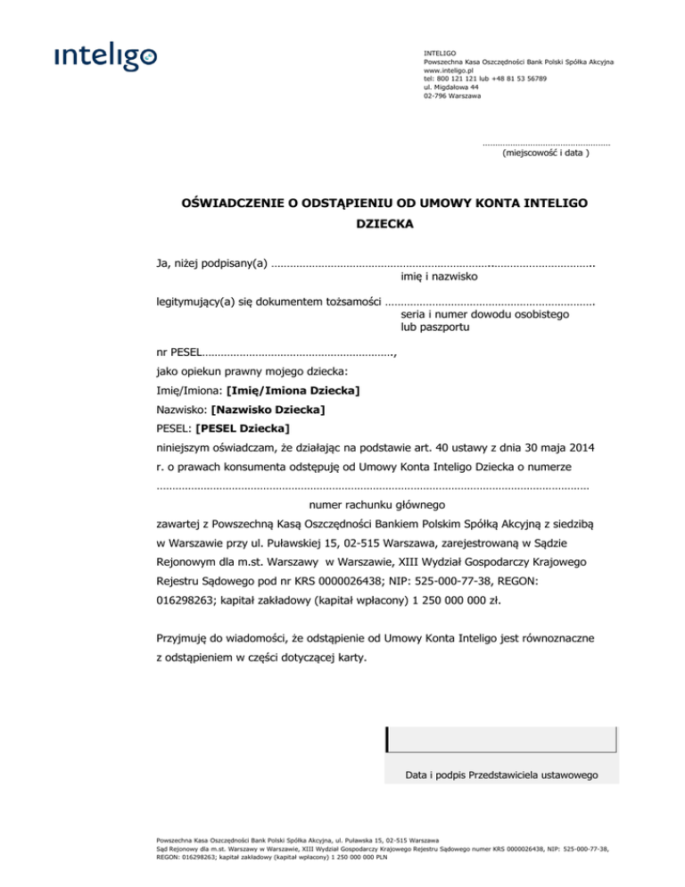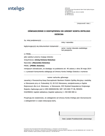 INTELIGO Powszechna Kasa Oszczędności Bank Polski Spółka Akcyjna www.inteligo.pl tel: 800 121 121 lub +48 81 53 56789 ul. Migdałowa 44 02-796 Warszawa …………………………………………… (miejscowość i data ) OŚWIADCZENIE O ODSTĄPIENIU OD UMOWY KONTA INTELIGO DZIECKA Ja, niżej podpisany(a) ……………………………………………………………..………………………….. imię i nazwisko legitymujący(a) się dokumentem tożsamości …………………………………………………………. seria i numer dowodu osobistego lub paszportu nr PESEL……………………………………………………., jako opiekun prawny mojego dziecka: Imię/Imiona: [Imię/Imiona Dziecka] Nazwisko: [Nazwisko Dziecka] PESEL: [PESEL Dziecka] niniejszym oświadczam, że działając na podstawie art. 40 ustawy z dnia 30 maja 2014 r. o prawach konsumenta odstępuję od Umowy Konta Inteligo Dziecka o numerze ………………………………………………………………………………………………………………………… numer rachunku głównego zawartej z Powszechną Kasą Oszczędności Bankiem Polskim Spółką Akcyjną z siedzibą w Warszawie przy ul. Puławskiej 15, 02-515 Warszawa, zarejestrowaną w Sądzie Rejonowym dla m.st. Warszawy w Warszawie, XIII Wydział Gospodarczy Krajowego Rejestru Sądowego pod nr KRS 0000026438; NIP: 525-000-77-38, REGON: 016298263; kapitał zakładowy (kapitał wpłacony) 1 250 000 000 zł. Przyjmuję do wiadomości, że odstąpienie od Umowy Konta Inteligo jest równoznaczne z odstąpieniem w części dotyczącej karty. Data i podpis Przedstawiciela ustawowego Powszechna Kasa Oszczędności Bank Polski Spółka Akcyjna, ul. Puławska 15, 02-515 Warszawa Sąd Rejonowy dla m.st. Warszawy w Warszawie, XIII Wydział Gospodarczy Krajowego Rejestru Sądowego numer KRS 0000026438, NIP: 525-000-77-38, REGON: 016298263; kapitał zakładowy (kapitał wpłacony) 1 250 000 000 PLN