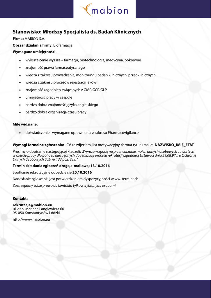 Stanowisko: Młodszy Specjalista ds. Badań Klinicznych Firma: MABION S.A. Obszar działania firmy: Biofarmacja Wymagane umiejętności: • wykształcenie wyższe – farmacja, biotechnologia, medycyna, pokrewne • znajomość prawa farmaceutycznego • wiedza z zakresu prowadzenia, monitoringu badań klinicznych, przedklinicznych • wiedza z zakresu procesów rejestracji leków • znajomość zagadnień związanych z GMP, GCP, GLP • umiejętność pracy w zespole • bardzo dobra znajomość języka angielskiego • bardzo dobra organizacja czasu pracy Mile widziane: • doświadczenie i wymagane uprawnienia z zakresu Pharmacovigilance Wymogi formalne zgłoszenia: CV ze zdjęciem, list motywacyjny, format tytułu maila: NAZWISKO_IMIĘ_ETAT Prosimy o dopisanie następującej klauzuli: „Wyrażam zgodę na przetwarzanie moich danych osobowych zawartych w ofercie pracy dla potrzeb niezbędnych do realizacji procesu rekrutacji (zgodnie z Ustawą z dnia 29.08.97 r. o Ochronie Danych Osobowych DzU nr 133 poz. 833)” Termin składania zgłoszeń drogą e-mailową: 13.10.2016 Spotkanie rekrutacyjne odbędzie się 20.10.2016 Nadesłanie zgłoszenia jest potwierdzeniem dyspozycyjności w ww. terminach. Zastrzegamy sobie prawo do kontaktu tylko z wybranymi osobami. Kontakt: [email protected] ul. gen. Mariana Langiewicza 60 95-050 Konstantynów Łódzki http://www.mabion.eu
