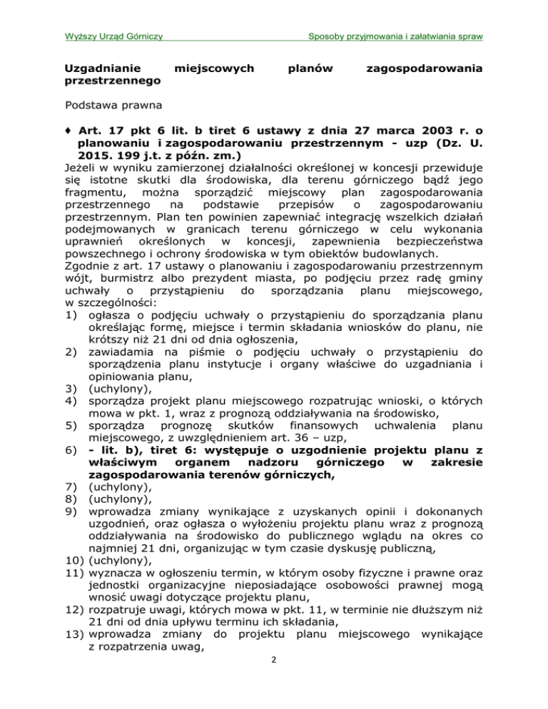 Wyższy Urząd Górniczy Uzgadnianie przestrzennego Sposoby przyjmowania i załatwiania spraw miejscowych planów zagospodarowania Podstawa prawna ♦ Art. 17 pkt 6 lit. b tiret 6 ustawy z dnia 27 marca 2003 r. o planowaniu i zagospodarowaniu przestrzennym - uzp (Dz. U. 2015. 199 j.t. z późn. zm.) Jeżeli w wyniku zamierzonej działalności określonej w koncesji przewiduje się istotne skutki dla środowiska, dla terenu górniczego bądź jego fragmentu, można sporządzić miejscowy plan zagospodarowania przestrzennego na podstawie przepisów o zagospodarowaniu przestrzennym. Plan ten powinien zapewniać integrację wszelkich działań podejmowanych w granicach terenu górniczego w celu wykonania uprawnień określonych w koncesji, zapewnienia bezpieczeństwa powszechnego i ochrony środowiska w tym obiektów budowlanych. Zgodnie z art. 17 ustawy o planowaniu i zagospodarowaniu przestrzennym wójt, burmistrz albo prezydent miasta, po podjęciu przez radę gminy uchwały o przystąpieniu do sporządzania planu miejscowego, w szczególności: 1) ogłasza o podjęciu uchwały o przystąpieniu do sporządzania planu określając formę, miejsce i termin składania wniosków do planu, nie krótszy niż 21 dni od dnia ogłoszenia, 2) zawiadamia na piśmie o podjęciu uchwały o przystąpieniu do sporządzenia planu instytucje i organy właściwe do uzgadniania i opiniowania planu, 3) (uchylony), 4) sporządza projekt planu miejscowego rozpatrując wnioski, o których mowa w pkt. 1, wraz z prognozą oddziaływania na środowisko, 5) sporządza prognozę skutków finansowych uchwalenia planu miejscowego, z uwzględnieniem art. 36 – uzp, 6) - lit. b), tiret 6: występuje o uzgodnienie projektu planu z właściwym organem nadzoru górniczego w zakresie zagospodarowania terenów górniczych, 7) (uchylony), 8) (uchylony), 9) wprowadza zmiany wynikające z uzyskanych opinii i dokonanych uzgodnień, oraz ogłasza o wyłożeniu projektu planu wraz z prognozą oddziaływania na środowisko do publicznego wglądu na okres co najmniej 21 dni, organizując w tym czasie dyskusję publiczną, 10) (uchylony), 11) wyznacza w ogłoszeniu termin, w którym osoby fizyczne i prawne oraz jednostki organizacyjne nieposiadające osobowości prawnej mogą wnosić uwagi dotyczące projektu planu, 12) rozpatruje uwagi, których mowa w pkt. 11, w terminie nie dłuższym niż 21 dni od dnia upływu terminu ich składania, 13) wprowadza zmiany do projektu planu miejscowego wynikające z rozpatrzenia uwag, 2 Wyższy Urząd Górniczy Sposoby przyjmowania i załatwiania spraw 14) przedstawia radzie gminy projekt planu miejscowego wraz z listą nieuwzględnionych uwag. Uwagi do projektu planu miejscowego może wnieść każdy, kto kwestionuje ustalenia przyjęte w projekcie planu, wyłożonym do publicznego wglądu. Uwagi do projektu planu należy wnieść na piśmie w terminie wyznaczonym w ogłoszeniu. Organy nadzoru górniczego w zakresie swojej właściwości rzeczowej i miejscowej są obowiązane do współpracy przy sporządzaniu projektu planu miejscowego, polegającej na wyrażaniu opinii, składaniu wniosków oraz udostępnianiu informacji. Uzgodnień dokonują na swój koszt, działając w trybie art. 106 Kodeksu postępowania administracyjnego. Po uzyskaniu zawiadomienia o podjęciu przez gminę uchwały o przystąpieniu do sporządzania planu zagospodarowania przestrzennego, organ nadzoru górniczego: 1) powiadamia o tym fakcie właściwych przedsiębiorców górniczych, będących w granicach opracowania planu, 2) wnosi na piśmie ewentualne uwagi i opinie w terminie wyznaczonym w zawiadomieniu lub ogłoszeniu. Uzgadniając projekt miejscowego planu zagospodarowania przestrzennego organ nadzoru górniczego: 1) zasięga opinii właściwych przedsiębiorców górniczych o projekcie planu, 2) bada, czy projekt planu zapewnia integracje wszelkich działań podejmowanych w granicach terenu górniczego w celu: a) wykonania działalności określonej w koncesji, b) zapewnienia bezpieczeństwa powszechnego, c) ochrony środowiska, w tym obiektów budowlanych, 3) wydaje w trybie art. 106 Kodeksu postępowania administracyjnego postanowienie, w którym uzgadnia projekt planu. Odmawiając jego uzgodnienie, organ nadzoru górniczego musi podać warunki, na jakich uzgodnienie będzie mogło nastąpić. Wójt, burmistrz albo prezydent miasta może uznać za uzgodniony projekt planu miejscowego w przypadku, w którym organ uzgadniający nie określi warunków, na jakich uzgodnienie może nastąpić. Organ nadzoru górniczego, z którym uzgodniono projekt planu miejscowego, ponosi koszty zmiany tego projektu, spowodowane późniejszą zmianą stanowiska. ♦ Art. 101 ust.1 - ustawy o samorządzie gminnym (Dz.U. z 2015, poz. 1515 j.t. z poźn.zm.) Każdy, czyj interes prawny lub uprawnienie zostały naruszone uchwałą lub zarządzeniem podjętymi przez organ gminy w sprawie z zakresu administracji publicznej, może - po bezskutecznym wezwaniu do usunięcia naruszenia - zaskarżyć uchwałę lub zarządzenie do sądu administracyjnego. Za treść informacji odpowiada: Piotr Kujawski – Dyrektor Departamentu Ochrony Środowiska i Gospodarki Złożem 3