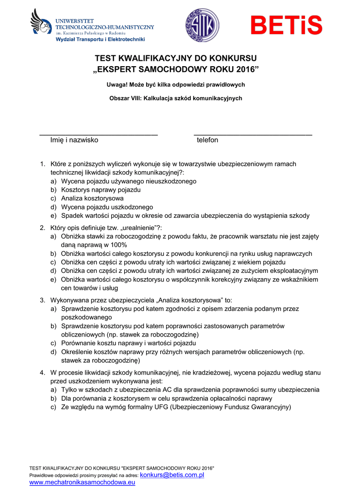TEST KWALIFIKACYJNY DO KONKURSU „EKSPERT SAMOCHODOWY ROKU 2016” Uwaga! Może być kilka odpowiedzi prawidłowych Obszar VIII: Kalkulacja szkód komunikacyjnych ____________________________________ Imię i nazwisko ____________________________________ telefon 1. Które z poniższych wyliczeń wykonuje się w towarzystwie ubezpieczeniowym ramach technicznej likwidacji szkody komunikacyjnej?: a) Wycena pojazdu używanego nieuszkodzonego b) Kosztorys naprawy pojazdu c) Analiza kosztorysowa d) Wycena pojazdu uszkodzonego e) Spadek wartości pojazdu w okresie od zawarcia ubezpieczenia do wystąpienia szkody 2. Który opis definiuje tzw. „urealnienie”?: a) Obniżka stawki za roboczogodzinę z powodu faktu, że pracownik warsztatu nie jest zajęty daną naprawą w 100% b) Obniżka wartości całego kosztorysu z powodu konkurencji na rynku usług naprawczych c) Obniżka cen części z powodu utraty ich wartości związanej z wiekiem pojazdu d) Obniżka cen części z powodu utraty ich wartości związanej ze zużyciem eksploatacyjnym e) Obniżka wartości całego kosztorysu o współczynnik korekcyjny związany ze wskaźnikiem cen towarów i usług 3. Wykonywana przez ubezpieczyciela „Analiza kosztorysowa” to: a) Sprawdzenie kosztorysu pod katem zgodności z opisem zdarzenia podanym przez poszkodowanego b) Sprawdzenie kosztorysu pod katem poprawności zastosowanych parametrów obliczeniowych (np. stawek za roboczogodzinę) c) Porównanie kosztu naprawy i wartości pojazdu d) Określenie kosztów naprawy przy różnych wersjach parametrów obliczeniowych (np. stawek za roboczogodzinę) 4. W procesie likwidacji szkody komunikacyjnej, nie kradzieżowej, wycena pojazdu według stanu przed uszkodzeniem wykonywana jest: a) Tylko w szkodach z ubezpieczenia AC dla sprawdzenia poprawności sumy ubezpieczenia b) Dla porównania z kosztorysem w celu sprawdzenia opłacalności naprawy c) Ze względu na wymóg formalny UFG (Ubezpieczeniowy Fundusz Gwarancyjny) TEST KWALIFIKACYJNY DO KONKURSU "EKSPERT SAMOCHODOWY ROKU 2016" Prawidłowe odpowiedzi prosimy przesyłać na adres: [email protected] www.mechatronikasamochodowa.eu 5. Tzw. „szkoda całkowita” liczona jest przez ubezpieczyciela: a) Gdy szacowany koszt naprawy przekracza określony procent wartości pojazdu według stanu przed uszkodzeniem b) Tylko, gdy szacowany koszt naprawy przekracza wartość pojazdu według stanu przed uszkodzeniem c) Dla sprawdzenia zasadności oferty z aukcji internetowej pozostałości 6. Moduł optymalizacyjny stosowany w szacowaniu kosztów naprawy umożliwia: a) Obniżenie szacowanego kosztu naprawy poprzez zadaną obniżkę procentową cen części b) Obniżenie szacowanego kosztu naprawy poprzez zadaną obniżkę procentową materiałów lakierniczych c) Obniżenie szacowanego kosztu naprawy poprzez zadaną obniżkę procentową stawki za roboczogodzinę d) Obniżenie szacowanego kosztu naprawy poprzez użycie w kosztorysie cen części od dostawców nie autoryzowanych przez producenta pojazdu e) Obniżenie szacowanego kosztu naprawy poprzez optymalizację korekt czasów pracy zadanych w kosztorysie 7. W metodzie kosztorysowania prac lakierniczych AZT, stosowanej w szacowaniu kosztów naprawy, pojęcie „lakierowania wstępnego” dotyczy: a) Lakierowania podkładem reaktywnym elementu dostarczanego w stanie surowym b) Lakierowania podkładem c) Lakierowania niewielkiej powierzchni dla sprawdzenia koloru przygotowanego lakieru d) Lakierowania częściowego wykonywanego przed montażem elementu na pojeździe e) Lakierowania próbnego dla sprawdzenia przygotowania powierzchni 8. Tzw. ”automatyka korekt” w modułach kalkulacyjnych służących do kosztorysowania naprawy pojazdu to: a) Automatyczne doliczanie korekty na ceny części i roboczogodziny zgodnie ze wskaźnikiem cen towarów i usług ogłaszanym przez GUS b) Automatyczne liczenie korekty na ceny części ze względu na zmiany kursowe PLN-EURO c) Automatycznie eliminowanie pokrywającego się czasu robocizny przy wprowadzaniu do kosztorysu operacji kompletnych d) Automatyczne obniżanie kosztów lakierowania przy kosztorysowaniu jednoczesnego lakierowania kilku sąsiadujących elementów 9. Oferowane klientom przez warsztaty naprawcze, zajmujące się naprawą szkód powypadkowych, tzw. „rozliczenie bezgotówkowe” to: a) Możliwość zapłaty przelewem lub karta kredytową b) Rozliczenie się warsztatu bezpośrednio z ubezpieczycielem finansującym naprawę c) Bezpłatne załatwienie przez warsztat formalności związanych z prowadzoną naprawą powypadkową 10. Pojęcie części „porównywalnej jakości” zostało wprowadzone w Polsce w roku: a) 2001 b) 2004 c) 2007 d) 2010 TEST KWALIFIKACYJNY DO KONKURSU "EKSPERT SAMOCHODOWY ROKU 2016" Prawidłowe odpowiedzi prosimy przesyłać na adres: [email protected] www.mechatronikasamochodowa.eu