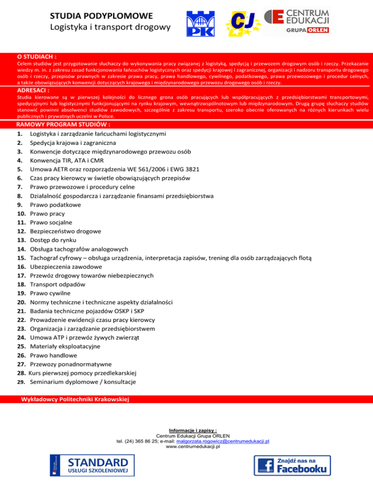 STUDIA PODYPLOMOWE Logistyka i transport drogowy O STUDIACH : Celem studiów jest przygotowanie słuchaczy do wykonywania pracy związanej z logistyką, spedycją i przewozem drogowym osób i rzeczy. Przekazanie wiedzy m. in. z zakresu zasad funkcjonowania łańcuchów logistycznych oraz spedycji krajowej i zagranicznej, organizacji i nadzoru transportu drogowego osób i rzeczy, przepisów prawnych w zakresie prawa pracy, prawa handlowego, cywilnego, podatkowego, prawa przewozowego i procedur celnych, a także obowiązujących konwencji dotyczących krajowego i międzynarodowego przewozu drogowego osób i rzeczy. ADRESACI : Studia kierowane są w pierwszej kolejności do licznego grona osób pracujących lub współpracujących z przedsiębiorstwami transportowymi, spedycyjnymi lub logistycznymi funkcjonującymi na rynku krajowym, wewnątrzwspólnotowym lub międzynarodowym. Drugą grupę słuchaczy studiów stanowić powinni absolwenci studiów zawodowych, szczególnie z zakresu transportu, szeroko obecnie oferowanych na różnych kierunkach wielu publicznych i prywatnych uczelni w Polsce. RAMOWY PROGRAM STUDIÓW : 1. Logistyka i zarządzanie łańcuchami logistycznymi 2. Spedycja krajowa i zagraniczna 3. Konwencje dotyczące międzynarodowego przewozu osób 4. Konwencja TIR, ATA i CMR 5. Umowa AETR oraz rozporządzenia WE 561/2006 i EWG 3821 6. Czas pracy kierowcy w świetle obowiązujących przepisów 7. Prawo przewozowe i procedury celne 8. Działalność gospodarcza i zarządzanie finansami przedsiębiorstwa 9. Prawo podatkowe 10. Prawo pracy 11. Prawo socjalne 12. Bezpieczeństwo drogowe 13. Dostęp do rynku 14. Obsługa tachografów analogowych 15. Tachograf cyfrowy – obsługa urządzenia, interpretacja zapisów, trening dla osób zarządzających flotą 16. Ubezpieczenia zawodowe 17. Przewóz drogowy towarów niebezpiecznych 18. Transport odpadów 19. Prawo cywilne 20. Normy techniczne i techniczne aspekty działalności 21. Badania techniczne pojazdów OSKP i SKP 22. Prowadzenie ewidencji czasu pracy kierowcy 23. Organizacja i zarządzanie przedsiębiorstwem 24. Umowa ATP i przewóz żywych zwierząt 25. Materiały eksploatacyjne 26. Prawo handlowe 27. Przewozy ponadnormatywne 28. Kurs pierwszej pomocy przedlekarskiej 29. Seminarium dyplomowe / konsultacje Wykładowcy Politechniki Krakowskiej Informacje i zapisy : Centrum Edukacji Grupa ORLEN tel. (24) 365 86 25; e-mail: [email protected] www.centrumedukacji.pl STUDIA PODYPLOMOWE Logistyka i transport drogowy CZAS TRWANIA, TERMIN I MIEJSCE ZAJĘĆ : 2 semestry 240 h Inauguracja: marzec/kwiecień 2017 r. Siedziba Centrum Edukacji Grupa ORLEN, Al. F. Kobylińskiego 25, Płock Rekrutacja trwa do 19 lutego 2017 r. CENA : 4 300,00 zł brutto* *Istnieje możliwość wnoszenia opłaty w dwóch ratach (semestralnych). Uczestnicy studiów podyplomowych otrzymują (w ramach opłaty) materiały oraz poczęstunki w przerwach zajęć poszczególnych sesji. 3 DODATKOWE INFORMACJE: Uczestnicy otrzymują: Świadectwo ukończenia studiów podyplomowych Politechniki Krakowskiej im. Tadeusza Kościuszki (dodatkowa opłata 30 zł zgodnie z Zarządzeniem JM Rektora Politechniki Krakowskiej nr 21 z dnia 21.06.2007) Zaświadczenie ukończenia Kursu Pierwszej Pomocy Przedlekarskiej Absolwenci studiów posiadają wiedzę zgodną zakresem zagadnień objętych egzaminem państwowym na certyfikat kompetencji zawodowych przewoźnika, określonym przez część I załącznika I do rozporządzenia Parlamentu Europejskiego i Rady (WE) nr 1071/2009 z dnia 21 października 2009 r. ustanawiającego wspólne zasady dotyczące warunków wykonywania zawodu przewoźnika drogowego i uchylające dyrektywę Rady 96/26/WE. Oznacza to, że absolwenci naszych studiów - NA CHWILĘ OBECNĄ - mają możliwość uzyskania Certyfikatu kompetencji zawodowych przewoźnika drogowego osób i rzeczy, po złożeniu wymaganych dokumentów w Instytucie Transportu Samochodowego w Warszawie, bez konieczności zdawania egzaminu. Zastrzegamy możliwość zmiany przepisów przez ITS w przemiotowym zakresie. Grupa 20-25 uczestników. Informacje i zapisy : Centrum Edukacji Grupa ORLEN tel. (24) 365 86 25; e-mail: [email protected] www.centrumedukacji.pl STUDIA PODYPLOMOWE Logistyka i transport drogowy KARTA ZGŁOSZENIA uczestnictwa w studiach podyplomowych w zakresie: "Logistyka i transport drogowy" organizowanych przez Centrum Edukacji Sp. z o.o. w Płocku oraz Centrum Szkolenia i Organizacji Systemów Jakości Politechniki Krakowskiej im. T. Kościuszki 1. Nazwisko i imię ..................................................................................................... Nr NIP: ........................................... 2. Data ur. ...................................... miejsce ur. ....................................................... 3a. Miejsce zamieszkania ......................................................................................... .............................................. .................................... ......................................... 3b. Adres do korespondencji .................................................................................... telefon...........................................e-mail ............................................................ 4. Wykształcenie ..................................................................................................... nazwa ukończonej uczelni .................................................................................. wydział ................................................................................................................. kierunek ............................................................................................................... rok ukończenia studiów .......................... uzyskany tytuł .................................... 5. Pełna nazwa i adres zakładu pracy .................................................................... ...........