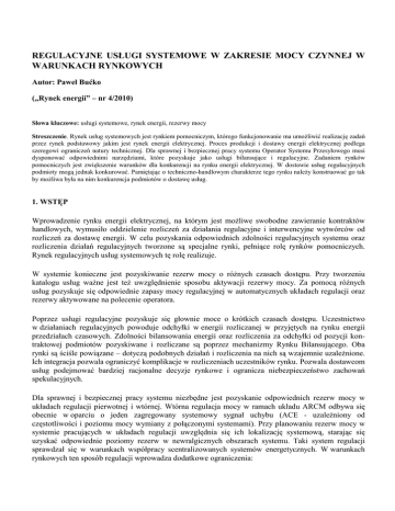 REGULACYJNE USŁUGI SYSTEMOWE W ZAKRESIE MOCY CZYNNEJ W WARUNKACH RYNKOWYCH Autor: Paweł Bućko („Rynek energii” – nr 4/2010) Słowa kluczowe: usługi systemowe, rynek energii, rezerwy mocy Streszczenie. Rynek usług systemowych jest rynkiem pomocniczym, którego funkcjonowanie ma umożliwić realizację zadań przez rynek podstawowy jakim jest rynek energii elektrycznej. Proces produkcji i dostawy energii elektrycznej podlega szeregowi ograniczeń natury technicznej. Dla sprawnej i bezpiecznej pracy systemu Operator Systemu Przesyłowego musi dysponować odpowiednimi narzędziami, które pozyskuje jako usługi bilansujące i regulacyjne. Zadaniem rynków pomocniczych jest zwiększenie warunków dla konkurencji na rynku energii elektrycznej. W dostawie usług regulacyjnych podmioty mogą jednak konkurować. Pamiętając o techniczno-handlowym charakterze tego rynku należy konstruować go tak by możliwa była na nim konkurencja podmiotów o dostawę usług. 1. WSTĘP Wprowadzenie rynku energii elektrycznej, na którym jest możliwe swobodne zawieranie kontraktów handlowych, wymusiło oddzielenie rozliczeń za działania regulacyjne i interwencyjne wytwórców od rozliczeń za dostawę energii. W celu pozyskania odpowiednich zdolności regulacyjnych systemu oraz rozliczenia działań regulacyjnych tworzone są specjalne rynki, pełniące rolę rynków pomocniczych. Rynek regulacyjnych usług systemowych tę rolę realizuje. W systemie konieczne jest pozyskiwanie rezerw mocy o różnych czasach dostępu. Przy tworzeniu katalogu usług ważne jest też uwzględnienie sposobu aktywacji rezerwy mocy. Za pomocą różnych usług pozyskuje się odpowiednie zapasy mocy regulacyjnej w automatycznych układach regulacji oraz rezerwy aktywowane na polecenie operatora. Poprzez usługi regulacyjne pozyskuje się głownie moce o krótkich czasach dostępu. Uczestnictwo w działaniach regulacyjnych powoduje odchyłki w energii rozliczanej w przyjętych na rynku energii przedziałach czasowych. Zdolności bilansowania energii oraz rozliczenia za odchyłki od pozycji kontraktowej podmiotów pozyskiwane i rozliczane są poprzez mechanizmy Rynku Bilansującego. Oba rynki są ściśle powiązane – dotyczą podobnych działań i rozliczenia na nich są wzajemnie uzależnione. Ich integracja pozwala ograniczyć komplikacje w rozliczeniach uczestników rynku. Pozwala dostawcom usług podejmować bardziej racjonalne decyzje rynkowe i ogranicza niebezpieczeństwo zachowań spekulacyjnych. Dla sprawnej i bezpiecznej pracy systemu niezbędne jest pozyskanie odpowiednich rezerw mocy w układach regulacji pierwotnej i wtórnej. Wtórna regulacja mocy w ramach układu ARCM odbywa się obecnie w oparciu o jeden zagregowany systemowy sygnał uchybu (ACE - uzależniony od częstotliwości i poziomu mocy wymiany z połączonymi systemami). Przy planowaniu rezerw mocy w systemie pracujących w układach regulacji uwzględnia się ich lokalizację systemową, starając się uzyskać odpowiednie poziomy rezerw w newralgicznych obszarach systemu. Taki system regulacji sprawdzał się w warunkach współpracy scentralizowanych systemów energetycznych. W warunkach rynkowych ten sposób regulacji wprowadza dodatkowe ograniczenia: − pojawiają się ograniczenia możliwości przesyłowych niektórych połączeń systemowych, co bywa szczególnie uciążliwe w przypadku połączeń międzysystemowych, − system regulacji nie jest dostosowany do postulowanej (i wdrażanej) decentralizacji procesów rynkowych. Rozwój rynków, a w szczególności ewentualne wprowadzenie bilansowania obszarowego, nie będzie praktycznie możliwe bez zmiany podejścia do regulacji mocy w systemie. Część funkcji związanych z realizacją zadań regulacji rozpływami mocy powinna być stopniowo rozpraszana. Równolegle ze zmianami sposobu regulacji mocą w systemie mogą następować zmiany w organizacji Rynku Bilansującego i rynków usług systemowych. Wprowadzenie wydzielonych obszarów bilansowania wygeneruje zapotrzebowanie na dostawę usług regulacyjnych w ramach obszarów. Poza rynkiem systemowym będą mogły funkcjonować lokalne Rynki Bilansujące i działające na tych samych obszarach lokalne rynki usług systemowych. Dostawcy usług będą mogli lokować swoją ofertę na rynku systemowym lub lokalnym. 2. USŁUGI SYSTEMOWE W KRAJOWYM SYSTEMIE ELEKTROENERGETYCZNYM Rynek usług systemowych funkcjonuje na poziomie systemu przesyłowego. Jego zasady podlegają okresowym zmianom. Funkcjonowanie rynku usług systemowych jest ściśle związane z warunkami bilansowania kontraktów handlowych na hurtowym rynku energii. W Polsce funkcję tę spełnia Rynek Bilansujący. Aktualizacja IRiESP [5] nr B/7/2008 istotnie zmieniła zakres i sposób rozliczania regulacyjnych usług systemowych. Wprowadzono następujące zmiany: − − − − − zmodyfikowano katalog usług systemowych i zmieniono zasady ich pozyskiwania, wprowadzenie ograniczonej możliwości pełnienia wybranej usługi także przez odbiorców, określono zasady rozliczania operacyjnej rezerwy mocy, zmodyfikowano zasady rozliczania usług regulacyjnych, zmieniono zasady rozliczania niezbilansowania energii spowodowanego pełnieniem usługi systemowej. W stosunku do wcześniej obowiązujących zasad zakres modyfikacji zasad kontraktowania i rozliczania regulacyjnych usług systemowych był dość istotny. Wydaje się, że najistotniejszą zmianą (poza zmianą katalogu usług) jest postępująca integracja rynku regulacyjnych usług systemowych z Rynkiem Bilansującym. Oba rynki (Rynek Bilansujący oraz usługi systemowe) służą do realizacji podobnej funkcji technicznohandlowej. Operator Systemu Przesyłowego (OSP) pozyskuje za ich pomocą środki techniczne do bilansowania chwilowych wartości mocy w systemie oraz dokonuje rozliczenia niezbilansowań energii w stosunku do pozycji kontraktowych. Rynek Bilansujący funkcjonuje w dłuższych przedziałach czasowych (dos