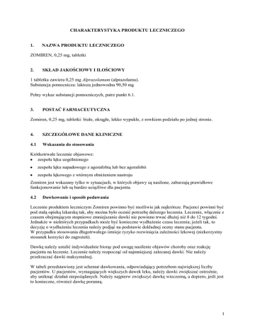 CHARAKTERYSTYKA PRODUKTU LECZNICZEGO 1. NAZWA PRODUKTU LECZNICZEGO ZOMIREN, 0,25 mg, tabletki 2. SKŁAD JAKOŚCIOWY I ILOŚCIOWY 1 tabletka zawiera 0,25 mg Alprazolamum (alprazolamu). Substancja pomocnicza: laktoza jednowodna 90,50 mg Pełny wykaz substancji pomocniczych, patrz punkt 6.1. 3. POSTAĆ FARMACEUTYCZNA Zomiren, 0,25 mg, tabletki: białe, okrągłe, lekko wypukłe, z rowkiem podziału po jednej stronie. 4. SZCZEGÓŁOWE DANE KLINICZNE 4.1 Wskazania do stosowania Krótkotrwałe leczenie objawowe: zespołu lęku uogólnionego zespołu lęku napadowego z agorafobią lub bez agorafobii zespołu lękowego z wtórnym obniżeniem nastroju Zomiren jest wskazany tylko w sytuacjach, w których objawy są nasilone, zaburzają prawidłowe funkcjonowanie lub są bardzo uciążliwe dla pacjenta. 4.2 Dawkowanie i sposób podawania Leczenie produktem leczniczym Zomiren powinno być możliwie jak najkrótsze. Pacjenci powinni być pod stałą opieką lekarską tak, aby można było ocenić potrzebę dalszego leczenia. Leczenie, włącznie z czasem obejmującym stopniowe zmniejszanie dawki nie powinno trwać dłużej niż 8 do 12 tygodni. Jednakże w niektórych przypadkach może być konieczne wydłużenie czasu leczenia; jeżeli tak, to decyzję o wydłużeniu leczenia należy podjąć na podstawie dokładnej oceny stanu pacjenta. W przypadku stosowania długotrwałego istnieje ryzyko rozwinięcia zależności lekowej (niekorzystny stosunek korzyści do zagrożeń). Dawkę należy ustalić indywidualnie biorąc pod uwagę nasilenie objawów choroby oraz reakcję pacjenta na leczenie. Leczenie należy rozpocząć od najmniejszej zalecanej dawki. Nie należy przekraczać dawki maksymalnej. W tabeli przedstawiony jest schemat dawkowania, odpowiadający potrzebom największej liczby pacjentów. U pacjentów, wymagających większych dawek leku, należy dawki zwiększać ostrożnie, aby uniknąć działań niepożądanych. Należy najpierw zwiększyć dawkę wieczorną, a dopiero, jeśli jest to konieczne, również dawkę poranną. 1 Wskazanie Leczenie początkowe Leczenie podtrzymujące Zespół lęku uogólnionego i zespół lękowy z wtórnym obniżeniem nastroju dorośli: 0,25 do 0,5 mg 3 razy na dobę dorośli: 0,5 do 4 mg na dobę, w dwóch lub trzech dawkach podzielonych osoby w wieku podeszłym: 0,25 mg 2 do 3 razy na dobę osoby w wieku podeszłym: 0,5 do 0,75 mg na dobę w dwóch lub trzech dawkach podzielonych 4 mg na dobę w dawkach podzielonych. W wyjątkowych przypadkach od 8 mg do 10 mg na dobę w dawkach podzielonych. Zespół lęku napadowego 0,5 do 1 mg przed snem (dawki nie należy zwiększać o więcej niż 1 mg w ciągu 3 do 4 dni) Jeśli już po zastosowaniu dawek początkowych pojawią się działania niepożądane, należy dawki zmniejszyć. Lek należy odstawiać stopniowo; w przypadku nagłego przerwania leczenia mogą wystąpić objawy odstawienne. Objawy te mogą mieć postać łagodnej dysforii, bezsenności, a także poważniejszych objawów jak kurcze mięśni i brzucha, wymioty, pocenie się, drżenie i drgawki. Stopniowe odstawianie leku powinno być wydłużone w czasie, np. jeśli pacjent zażywa dawkę 0,5 mg rano, 0,5 mg w południe i 1 mg wieczorem, zaleca się zmniejszanie dawki dobowej maksymalnie o 0,25 mg co trzy dni. W niektórych przypadkach zalecane jest zmniejszenie dawki dobowej, bez względu na jej wartość początkową, o 0,5 mg co trzy dni. Jeśli wystąpią objawy odstawienne, należy ponownie wdrożyć poprzedni schemat dawkowania, do momentu zrównoważenia stanu pacjenta, a następnie ponownie rozpocząć, w wolniejszym tempie, stopniowe obniżanie dawki dobowej. Pacjenci leczeni alprazolamem w dawkach większych od 4 mg w czasie zmniejszania dawek mają więcej problemów z odstawieniem leku. Stosowanie u dzieci i młodzieży w wieku poniżej 18 lat: Nie zostało określone bezpieczeństwo i skuteczność leczenia dzieci i młodzieży poniżej 18 lat, dlatego nie należy stosować u dzieci i młodzieży poniżej 18 lat. 4.3 4.4 Przeciwwskazania nadwrażliwość na alprazolam, inne benzodiazepiny lub na którąkolwiek substancję pomocniczą leku (patrz punkt 6.1) myashtenia gravis ciężka niewydolność oddechowa zespół bezdechu nocnego ciężka niewydolność wątroby nie należy stosować u dzieci i młodzieży w wieku poniżej 18 lat Specjalne ostrzeżenia i środki ostrożności dotyczące stosowania Tolerancja leku Zjawisko tolerancji wykazano dla działania uspokajającego alprazolamu, lecz nie przeciwlękowego. Uzależnienie Długotrwałe zażywanie pochodnych benzodiazepiny, w tym alprazolamu, może doprowadzić do psychicznego i fizycznego uzależnienia. Ryzyko uzależnienia zwiększa się wraz z wydłużonym okresem leczenia. Należy szczególnie ostrożnie stosować lek u pacjentów wykazujących skłonność do uzależnienia lub nadużywania alkoholu, narkotyków i leków. 2 Objawy odstawienne Długotrwałe leczenie należy przerywać stopniowo. W przypadku wystąpienia uzależnienia fizycznego, nagłe przerwanie leczenia spowoduje wystąpienie zespołu odstawiennego. Po nagłym przerwaniu leczenia obserwowano skrajną postać zaburzeń lękowych, stany napięcia nerwowego, niepokój (zwłaszcza ruchowy), stany splątania i drażliwości. W poważniejszych przypadkach przerwaniu leczenia towarzyszyły także następujące objawy: utrata poczucia własnej realności i depersonalizacja, przeczulica słuchowa, zdrętwienie i mrowienie kończyn, nadwrażliwość na światło, hałas i dotyk, halucynacje lub napady padaczkowe. Nawrót bezsenności i zaburzeń lękowych: Po nagłym odstawieniu leku może nastąpić przemijające nasilenie zaburzeń lękowych lub może wystąpić bezsenność. Objawom tym mogą dodatkowo towarzyszyć zmiany nastroju, niepokój, zaburzenia snu, a także niepokój (zwłaszcza ruchowy). Z tego powodu należy unikać nagłego przerwania leczenia i stopniowo zmniejszać dobowe dawki leku. Zwiększone ryzy
