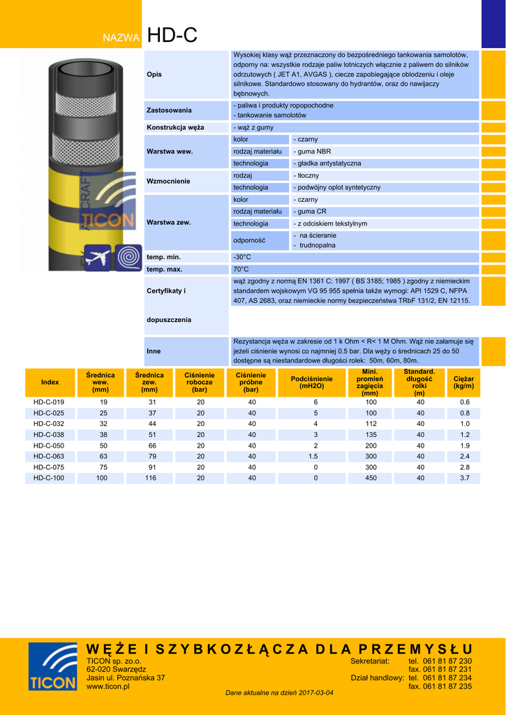 NAZWA HD-C Opis Wysokiej klasy wąż przeznaczony do bezpośredniego tankowania samolotów, odporny na: wszystkie rodzaje paliw lotniczych włącznie z paliwem do silników odrzutowych ( JET A1, AVGAS ), ciecze zapobiegające oblodzeniu i oleje silnikowe. Standardowo stosowany do hydrantów, oraz do nawijaczy bębnowych. Zastosowania - paliwa i produkty ropopochodne - tankowanie samolotów Konstrukcja węża - wąż z gumy Warstwa wew. Wzmocnienie Warstwa zew. kolor - czarny rodzaj materiału - guma NBR technologia - gładka antystatyczna rodzaj - tłoczny technologia - podwójny oplot syntetyczny kolor - czarny rodzaj materiału - guma CR technologia - z odciskiem tekstylnym odporność - na ścieranie - trudnopalna temp. min. -30°C temp. max. 70°C Certyfikaty i wąż zgodny z normą EN 1361 C; 1997 ( BS 3185; 1985 ) zgodny z niemieckim standardem wojskowym VG 95 955 spełnia także wymogi: API 1529 C, NFPA 407, AS 2683, oraz niemieckie normy bezpieczeństwa TRbF 131/2, EN 12115. dopuszczenia Rezystancja węża w zakresie od 1 k Ohm < R< 1 M Ohm. Wąż nie załamuje się jeżeli ciśnienie wynosi co najmniej 0.5 bar. Dla węży o średnicach 25 do 50 dostępne są niestandardowe długości rolek: 50m, 60m, 80m. Inne HD-C-019 19 31 20 40 6 Mini. Mini. promień promień zagięcia zagięcia (mm) (mm) 100 HD-C-025 25 37 20 40 5 100 40 0.8 HD-C-032 32 44 20 40 4 112 40 1.0 HD-C-038 38 51 20 40 3 135 40 1.2 HD-C-050 50 66 20 40 2 200 40 1.9 HD-C-063 63 79 20 40 1.5 300 40 2.4 HD-C-075 75 91 20 40 0 300 40 2.8 HD-C-100 100 116 20 40 0 450 40 3.7 Index Index Średnica wew. (mm) Średnica zew. (mm) Ciśnienie robocze (bar) Ciśnienie próbne (bar) Podciśnienie Podciśnienie (mH2O) (mH2O) Standard. Standard. długość długość rolki rolki (m) (m) 40 Ciężar Ciężar (kg/m) (kg/m) 0.6 WĘŻE I SZYBKOZŁĄCZA DLA PRZEMYSŁU TICON sp. zo.o. 62-020 Swarzędz Jasin ul. Poznańska 37 www.ticon.pl Sekretariat: Dane aktualne na dzień 2017-03-04 tel. 061 81 87 230 fax. 061 81 87 231 Dział handlowy: tel. 061 81 87 234 fax. 061 81 87 235