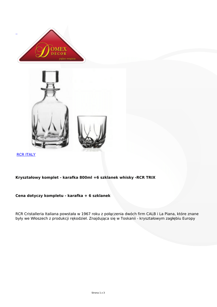 RCR ITALY Kryształowy komplet - karafka 800ml +6 szklanek whisky -RCR TRIX Cena dotyczy kompletu - karafka + 6 szklanek RCR Cristalleria Italiana powstała w 1967 roku z połączenia dwóch firm CALB i La Piana, które znane były we Włoszech z produkcji rękodzieł. Znajdująca się w Toskanii - kryształowym zagłębiu Europy Strona 1 z 3 główna siedziba firmy i fabryka, odpowiada dziś za produkcję 15% kryształow na świecie. Produkty RCR to synonim najwyższej jakości i przykład połączenia tradycyjnynego rękodzieła z nowoczesna technologią produkcji kryształów. W 2008 roku firma opracowała unikalny w skali światowej materiał szklany Luxor o niezwykłej wytrzymałości. Dodatkowe informacje: Kolekcja RCR Cristalleria Italiana - TRIX Wykonana z opatentowanego przez RCR szkła Luxion. SKŁAD KOMPLETU: - karafka 800ml ze szklanym korkiem (wysokość 22cm) - 1szt - szklanki do whisky 290ml - 6szt Strona 2 z 3 Komplet zapakowany jest w fabrycznym ładnym opakowaniu, idealny na prezent lub do własnego użytku. Najwyższej jakości szkło kryształowe. Import z Włoch Strona 3 z 3
