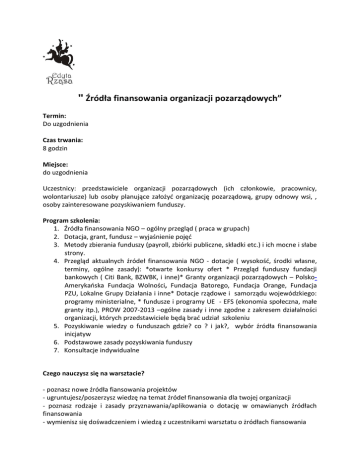 " Źródła finansowania organizacji pozarządowych” Termin: Do uzgodnienia Czas trwania: 8 godzin Miejsce: do uzgodnienia Uczestnicy: przedstawiciele organizacji pozarządowych (ich członkowie, pracownicy, wolontariusze) lub osoby planujące założyd organizację pozarządową, grupy odnowy wsi, , osoby zainteresowane pozyskiwaniem funduszy. Program szkolenia: 1. Źródła finansowania NGO – ogólny przegląd ( praca w grupach) 2. Dotacja, grant, fundusz – wyjaśnienie pojęd 3. Metody zbierania funduszy (payroll, zbiórki publiczne, składki etc.) i ich mocne i słabe strony. 4. Przegląd aktualnych źródeł finansowania NGO - dotacje ( wysokośd, środki własne, terminy, ogólne zasady): *otwarte konkursy ofert * Przegląd funduszy fundacji bankowych ( Citi Bank, BZWBK, i inne)* Granty organizacji pozarządowych – PolskoAmerykaoska Fundacja Wolności, Fundacja Batorego, Fundacja Orange, Fundacja PZU, Lokalne Grupy Działania i inne* Dotacje rządowe i samorządu wojewódzkiego: programy ministerialne, * fundusze i programy UE - EFS (ekonomia społeczna, małe granty itp.), PROW 2007-2013 –ogólne zasady i inne zgodne z zakresem działalności organizacji, których przedstawiciele będą brad udział szkoleniu 5. Pozyskiwanie wiedzy o funduszach gdzie? co ? i jak?, wybór źródła finansowania inicjatyw 6. Podstawowe zasady pozyskiwania funduszy 7. Konsultacje indywidualne Czego nauczysz się na warsztacie? - poznasz nowe źródła fiansowania projektów - ugruntujesz/poszerzysz wiedzę na temat źródeł finansowania dla twojej organizacji - poznasz rodzaje i zasady przyznawania/aplikowania o dotację w omawianych źródłach finansowania - wymienisz się dośwadczeniem i wiedzą z uczestnikami warsztatu o żródłach fiansowania - dowiesz się jak nie zgubid się w wielkiej księdze funduszy i poznasz narzędzia pozyskiwania wiedzy o nich. Jak skorzysta na tym Twoja organizacja? Zdobyta wiedza uruchomi nowe możliwości finansowania twojej organizacji i może zmotywowad do podejmowania niezrealizowanych dotąd projektów lub podsunąd pomysły na zupełnie nowe inicjatywy. Twój udział w szkoleniu pomoże twojej organizacji zadecydowad o wyborze źródeł finansowania i zaplanowad skorzystanie z nich. Prowadzący: Edyta Rząsa - z wykształecenia politolog - dziennikarz, menadżer kultury. Trener w zakresie konstruowania projektów i pozyskiwania funduszy, moderator odnowy wsi. Słuchaczka Szkoły Trenerów „Sied” PTP we Wrocławiu. Absolwentka Szkoły Młodych Trenerów IES i Szkoły Liderów Organizacji Pozarządowych. Jest autorką i współrealizatorką wielu projektów miękkich m.in. jako koordynator w projektach finansowanych z POKL, PROW 2007 -2013, PO FIO, Gminy Wrocław i innych. Od 11 lat związana z 3 sektorem. Przez okres ostatnich 5 lat zajmowała się promocją, pozyskiwaniem funduszy i doradztwem w zakresie źródeł finansowania w samorządzie. Posiada doświadczenie i wiedzę o współpracy partnerskiej i trójsektorowej. Jest certyfikowanym członkiem komitetu Lokalnej Grupy Rybackiej.