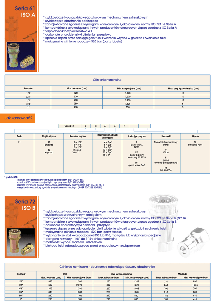* szybkoz³¹cze typu grzybkowego z kulowym mechanizmem zatrzaskowym * szybkoz³¹cze obustronnie odcinaj¹ce * zaprojektowane zgodnie z wymogami wymiarowymi i jakoœciowymi normy ISO 7241-1 Seria A * kompatybilne z szybkoz³¹czami innych producentów oferuj¹cych z³¹cza zgodne z ISO Seria A * wspó³czynnik bezpieczeñstwa 4:1 * doskona³e charakterystyki ciœnienia i przep³ywu * ³¹czenie z³¹cza przez odci¹gniêcie tulei i w³o¿enie wtyczki w gniazdo i zwolnienie tulei * maksymalne ciœnienie robocze - 320 bar (patrz tabela) Ciœnienia nominalne Rozmiar Max. robocze (bar) Max. przy ³¹czeniu rêk¹ (bar) Min. rozrywaj¹ce (bar) 1/4" 320 1,270 10 3/8” 320 1,270 10 1/2" 280 1,105 10 3/4" 280 1,105 5 1” 210 830 5 Jak zamawiaæ? Czêœæ Nr Seria Czêœæ z³¹cza 61 C gniazdo 61 Rozmiar z³¹cza 4 = 1/4" 6 = 3/8” 8 = 1/2" 12 = 3/4" 16 = 1” N wtyczka C 6 6- Rozmiar koñcówek przy³¹cza 4 = 1/4" 6 = 3/8” 8 = 1/2" 10 = 5/8" 12 = 3/4" 16 = 1” F Rodzaj przy³¹cza Uszczelki Opcje F gwint wew. NPTF Materia³ standardowy Buna SL blokada tulei RP gwint calowy walcowy BS 2779 EF* gwint wew. SAE V Viton E guma etyleno-propylenowa M MIL-H-5606 * gwinty SAE: rozmiar 1/4" dostarczany jest tylko z przy³¹czem 3/8” SAE (4-6EF) rozmiar 3/8” dostarczany jest tylko z przy³¹czem 1/2" SAE (6-8EF) rozmiar 1/2" mo¿e byæ na zamówienie dostarczany z przy³¹czem 5/8” SAE (8-10EF) wszystkie inne rozmiary zgodnie z wymiarem nominalnym (8-8EF, 12-12EF, 16-16EF) * szybkoz³¹cze typu grzybkowego z kulowym mechanizmem zatrzaskowym * szybkoz³¹cze z dwustronnym odciêciem * zaprojektowane zgodnie z wymogami wymiarowymi i jakoœciowymi normy ISO 7241-1 Seria B (ISO B) * kompatybilne z szybkoz³¹czami innych producentów oferuj¹cych z³¹cza zgodne z ISO Seria B * doskona³e charakterystyki ciœnienia i przep³ywu * ³¹czenie z³¹cza przez odci¹gniêcie tulei i w³o¿enie wtyczki w gniazdo i zwolnienie tulei * maksymalne ciœnienie robocze - 520 bar (patrz tabela) * wykonanie ze stali kwasoodpornej 303 lub 316, mosi¹dzu lub wykonania specjalne * dostêpne rozmiary - 1/8” do 1” œrednice nominalne * mo¿liwoœæ wyboru materia³u uszczelnieñ * blokada tulei zabezpieczaj¹ca przed przypadkowym roz³¹czeniem Ciœnienia nominalne - obustronnie odcinaj¹ce (zawory obustronnie) Rozmiar Stal Max. robocze (bar) Mosi¹dz Stal kwasoodporna Min. rozrywaj¹ce (bar) Max. robocze (bar) Min. rozrywaj¹ce (bar) Max. robocze (bar) Min. rozrywaj¹ce (bar) 1/8” 345 1,380 280 1,105 210 830 1/4" 520 2,070 380 1,520 260 1,035 3/8” 345 1,380 260 1,035 190 760 1/2" 345 1,380 260 1,035 210 830 3/4" 280 1,105 210 830 155 610 1” 280 1,105 210 830 105 415 Jak zamawiaæ? Czêœæ Nr Materia³ Seria Czêœæ z³¹cza Brak litery stal z pow³ok¹ galwaniczn¹ 72 C gniazdo S stal nierdzewna 303 72 S 4- 4 Rozmiar koñcówek przy³¹cza Rozmiar z³¹cza 2 = 1/8” 4 = 1/4” 6 = 3/8” 8 = 1/2” 12 = 3/4” 16 = 1” N wtyczka C 2 = 1/8” 4 = 1/4” 6 = 3/8” 8 = 1/2” 10 = 5/8” 12 = 3/4” 16 = 1” SS stal kwasoodporna 316 B mosi¹dz F Rodzaj przy³¹cza Uszczelki Opcje F gwint wew. NPTF Brak litery Buna-N (Nitryl) SL blokada tulei RP gwint calowy walcowy BS 2779 V Viton EF* gwint wew. SAE (tylko stal i stal nierdzewna 303) E guma Etyleno-propylenowa * wykonanie ze stali kwasoodpornej 316 dostarczane jest z gwintem wewnêtrznym NPSF * gwinty SAE: rozmiar 1/8" dostarczany jest tylko z przy³¹czem 1/4” SAE (2-4EF) rozmiar 1/4" dostarczany jest tylko z przy³¹czem 3/8” SAE (4-6EF) rozmiar 3/8” dostarczany jest tylko z przy³¹czem 1/2" SAE (6-8EF) rozmiar 1/2" mo¿e byæ na zamówienie dostarczany z przy³¹czem 5/8” SAE (8-10EF) wszystkie inne rozmiary zgodnie z wymiarem nominalnym (8-8EF, 12-12EF, 16-16EF) * szybkoz³¹cze suchoodcinaj¹ce * p³aska powierzchnia ³¹czeniowa * szybkoz³¹cze z dwustronnym odciêciem * zaprojektowane zgodnie z wymogami wymiarowymi i jakoœciowymi normy ISO 16028 * kompatybilne z szybkoz³¹czami innych producentów oferuj¹cych z³¹cza zgodne z ISO 16028 * doskona³e charakterystyki ciœnienia i przep³ywu * wspó³czynnik bezpieczeñstwa 4:1 * mo¿liwoœæ ³¹czenia pod ciœnieniem opcja CP (obecnie dostêpna w rozmiarze 1/2", zarówno dla czêœci gniazdowej jak i wtykowej) opcja ³¹czenia pod ciœnieniem pozwala na zabudowanie ka¿dej z po³ówek szybkoz³¹cza w obci¹¿onej ciœnieniem czêœci obwodu hydraulicznego przy ciœnieniu statycznym do 250 bar * ³¹czenie z³¹cza przez wcisk * maksymalne ciœnienie robocze - 315 bar (patrz tabela) * wykonanie ze stali o wysokiej wytrzyma³oœci * antykorozyjna ¿ó³ta pow³oka galwaniczna z dwuchromianu cynku o wyj¹tkowej odpornoœci * dostêpne rozmiary - 1/4” do 1” œrednice nominalne * rozmiar 3/8” zgodny równie¿ ze standardami HTMA (Hydraulic Tool Manufacturers Association) * mo¿liwoœæ wyboru materia³u uszczelnieñ Ciœnienia nominalne 3 Rozmiar Wyp³yw (cm ) Ciœnienie robocze (bar) Min. ciœnienie rozrywaj¹ce (bar) 1/4” 0.020 315 1260 3/8" 0.035 250 1000 1/2” 0.070 250 1000 5/8" 0.100 250 1000 3/4" 0.150 250 1000 1” 0.250 200 800 Typy koñcówek opcjonalnych Koñcówki F, EF, RP Koñcówki EM, EB Koñcówki ORSB Jak zamawiaæ? Czêœæ Nr 74 C Cecha specjalna Seria Czêœæ z³¹cza Rozmiar z³¹cza Rozmiar koñcówek przy³¹cza Brak litery standardowa seria 74 74 C gniazdo 4 = 1/4” 6 = 3/8” 8 = 1/2” 10 = 5/8” 12 = 3/4” 16 = 1” 4 = 1/4” 6 = 3/8” 8 = 1/2” 10 = 5/8” 12 = 3/4” 16 = 1” CP opcjonalne ³¹czenie pod ciœnieniem N wtyczka 8 -8 F Uszczelki Opcje F gwint wew. NPTF Brak litery Buna-N SL blokada tulei RP gwint calowy walcowy BS 2779 V Viton Rodzaj przy³¹cza EF gwint wew. SAE EM gwint zew. SAE EB przy³¹cze grodziowe SAE ORSB przy³¹cze grodziowe z o'ringiem doczo³owym * opcja CP74 dostêpna jest obecnie tylko w rozmiarze korpusu 1/2" (8) z koñcówkami: -8F, -8RP, -8EF, -10EF i 12EF