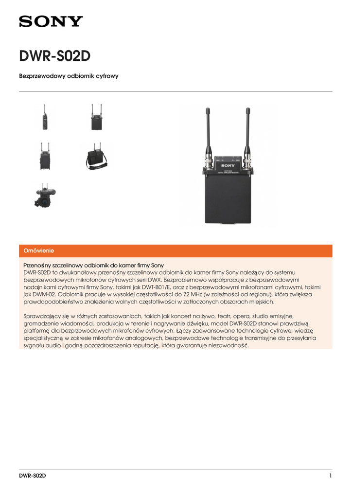DWR-S02D Bezprzewodowy odbiornik cyfrowy Omówienie Przenośny szczelinowy odbiornik do kamer firmy Sony DWR-S02D to dwukanałowy przenośny szczelinowy odbiornik do kamer firmy Sony należący do systemu bezprzewodowych mikrofonów cyfrowych serii DWX. Bezproblemowo współpracuje z bezprzewodowymi nadajnikami cyfrowymi firmy Sony, takimi jak DWT-B01/E, oraz z bezprzewodowymi mikrofonami cyfrowymi, takimi jak DWM-02. Odbiornik pracuje w wysokiej częstotliwości do 72 MHz (w zależności od regionu), która zwiększa prawdopodobieństwo znalezienia wolnych częstotliwości w zatłoczonych obszarach miejskich. Sprawdzający się w różnych zastosowaniach, takich jak koncert na żywo, teatr, opera, studio emisyjne, gromadzenie wiadomości, produkcja w terenie i nagrywanie dźwięku, model DWR-S02D stanowi prawdziwą platformę dla bezprzewodowych mikrofonów cyfrowych. Łączy zaawansowane technologie cyfrowe, wiedzę specjalistyczną w zakresie mikrofonów analogowych, bezprzewodowe technologie transmisyjne do przesyłania sygnału audio i godną pozazdroszczenia reputację, która gwarantuje niezawodność. DWR-S02D 1 Funkcje • Zgodność ze wszystkimi nadajnikami i mikrofonami serii DWX Należący do bezprzewodowego systemu cyfrowych mikrofonów bezprzewodowych serii DWX model DWRS02D bezproblemowo współpracuje z bezprzewodowymi nadajnikami cyfrowymi firmy Sony, takimi jak DWTB01, oraz z bezprzewodowymi mikrofonami cyfrowymi, takimi jak DWM-02. • Transmisja cyfrowego dźwięku wysokiej jakości System bezprzewodowych mikrofonów cyfrowych nadaje i odbiera 24-/48-bitowy cyfrowy sygnał dźwiękowy wysokiej jakości w określonym paśmie częstotliwości. Wykorzystując oryginalny kodek WiDIF-HP firmy Sony, system zapewnia szeroki zakres dynamiki (ponad 106 dB), szerokie pasmo przenoszenia od 20 Hz do 22 kHz oraz bardzo dobre przenoszenie transjentów. • Bezpieczna i stabilna transmisja bezprzewodowa Seria DWX zapewnia transmisję bezprzewodową o wysokiej stabilności i bardzo wysokiej tolerancji na niechciane zakłócenia. Ponadto system przesyła i odbiera dane cyfrowo modulowane i szyfrowane, co minimalizuje ryzyko przechwytywania i zapewnia wysoce bezpieczną transmisję oraz odbiór. • Obsługa wielu różnych funkcji wyjścia Oprócz analogowego wyjścia audio urządzenie DWR-S02D jest wyposażone w trzy wyjścia AES/EBU do 24 bitów/96 kHz. Dostępne jest także wejście/wyjście Word Sync do obsługi sygnału synchronizacji zewnętrznej o częstotliwości od 32 kHz do 96 kHz, które zapewnia szeroki zakres zastosowań w różnych sytuacjach. • Elastyczne opcje zasilania Zasilanie prądem przemiennym od 100 V do 240 V i prądem stałym 12 V umożliwia pracę w globalnym środowisku energetycznym. • Zdalne sterowanie funkcjami nadajnika z poziomu odbiornika Tłumienie sygnału wejściowego, wybór częstotliwości radiowej, moc wyjściowa sygnału radiowego, częstotliwość odłączania niskiego pasma dźwięku i tryb uśpienia nadajnika mogą być kontrolowane zdalnie z poziomu bezprzewodowego odbiornika cyfrowego. • Zaprogramowane plany kanałów łączności bezprzewodowej do jednoczesnej obsługi wielu kanałów Urządzenie DWR-S02D ma wiele zaprogramowanych grup kanałów. Są to połączenia kanałów łączności bezprzewodowej, które umożliwiają jednoczesną obsługę wielu kanałów bez międzymodulacji. • Dwukanałowy szczelinowy odbiornik bezprzewodowy Pomimo funkcjonalności dwukanałowego odbiornika urządzenie DWR-S02D jest wystarczająco małe, aby można było włożyć je bezpośrednio do szczeliny kamery firmy Sony. • Montaż z tyłu kamer DWR-S02D może być zamontowane w tylnej części różnych modeli kamer profesjonalnych firmy Sony za pomocą adaptera DWA-01D. W przypadku kamer z wejściami audio AES/EBU możliwe jest także w pełni cyfrowe nagrywanie dźwięku. • Funkcja automatycznego wyszukiwania kanałów Urządzenie DWR-S02D ma dwie funkcje automatycznego wyszukiwania kanałów, które umożliwiają szybkie, łatwe i bezpieczne zmiany częstotliwości. • Małe rozmiary, niska waga i wytrzymała konstrukcja DWR-S02D 2 Bardzo małe i lekkie urządzenie DWR-S02D dobrze utrzymuje równowagę nawet w przypadku montażu na kamerze. Ponadto konstrukcja ze stopu magnezu i aluminium ma wysoką wytrzymałość i sprawdza się w trudnym środowisku. • Czytelny wyświetlacz OLED (organiczne diody elektroluminescencyjne) z pełną matrycą punktów Szybka reakcja wyświetlacza OLED umożliwia wyraźne i precyzyjne wyświetlanie warunków pracy w czasie rzeczywistym. DWR-S02D 3 Specyfikacja techniczna Ważna uwaga • Aby spełnić wymogi regulacyjne poszczególnych krajów, dostępne są modele produktu działające w wielu różnych zakresach częstotliwości. Aby uzyskać informacje, który produkt najlepiej spełnia określone wymagania, należy skontaktować się z lokalnym sprzedawcą firmy Sony. Sekcja tunera UC14: kanały UHF-TV 14–25 (470–542 MHz) UC30: kanały UHF-TV 30–36 (566–608 MHz) i 38–41 (614–638 MHz) UC42: kanały UHF-TV 42–51 (638–698 MHz) • Kanały odbioru: Ameryka Północna i Południowa • Kanały odbioru: Europa, Bliski Wschód, Afryka, Australia, Nowa Zelandia CE33: kanały UHF-TV 33–40 566–630 MHz (nieodstępny w Nowej Zelandii) CE42*1: kanały UHF-TV 42–50 638–710 MHz CE51: kanały UHF-TV 51–59, 710–782 MHz (niedostępnie w Australii i Nowej Zelandii) • Typ odbiornika Szczelinowy (2 kanały) • Metoda transmisji WiDIF-HP (×2) • Typ odbioru Odbiór przestrzenny • System obwodu • Lokalne oscylatory Podwójna superheterodynowa Oscylator stabilizowany kryształem kwarcu z syntezatorem PLL • Złącze wejścia sygnału radiowego BNC-R, 50 Ω • Typ anteny Odłączane • Czułość 20 dBµ lub mniej (w temperaturze otoczenia 25°C (77°F), przy bitowej stopie błędów = 1 × 10 -5, bez obniżenia stosunku sygnału do szumu) Sekcja audio • Złącze wyjściowe dźwięku