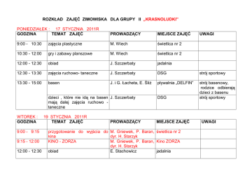 ROZKŁAD ZAJĘĆ ZIMOWISKA DLA GRUPY II „KRASNOLUDKI” PONIEDZIAŁEK : 17 STYCZNIA 2011R GODZINA TEMAT ZAJĘĆ PROWADZĄCY MIEJSCE ZAJĘĆ UWAGI 9:00 - 10:30 zajęcia plastyczne M. Wiech świetlica nr 2 10:30 - 12:00 gry i zabawy planszowe M. Wiech świetlica nr 2 12:00 - 12:30 obiad J. Szczerbaty jadalnia 12:30 - 13:30 zajęcia ruchowo- taneczne J. Szczerbaty DSG strój sportowy 13:30 - 15:00 basen J. i G. Łacheta, E. Śliż pływalnia „DELFIN” strój basenowy, rodzice odbierają dzieci z basenu strój sportowy dzieci , które nie idą na basen J. Szczerbaty mają dalej zajęcia ruchowo taneczne WTOREK : GODZINA 9:00 - 9:15 9:15 - 12:00 12:00 - 12:30 19 STYCZNIA 2011R TEMAT ZAJĘĆ PROWADZĄCY DSG MIEJSCE ZAJĘĆ przygotowanie do wyjścia do M. Gniewek, P. Baran, świetlica nr 2 kina dyr. H. Starzyk KINO - ZORZA M. Gniewek, P. Baran, Kino ZORZA dyr. H. Starzyk obiad E. Stachowicz jadalnia UWAGI 12:30 - 13:30 gry i zabawy edukacyjne E. Stachowicz sala nr 4 13:30 - 15:00 basen J. i G. Łacheta, E. Śliż pływalnia „DELFIN” dzieci , które nie idą na basen E. Stachowicz mają zajęcia - spotkanie z bajką ŚRODA : 19 STYCZNIA 2011R GODZINA TEMAT ZAJĘĆ 9:00 - 10:30 10:30 - 12:00 12:00 - 12:30 12:30 - 13:30 13:30 - 15:00 PROWADZĄCY świetlica nr 1 strój basenowy, rodzice odbierają dzieci z basenu razem z grupą I MIEJSCE ZAJĘĆ UWAGI przygotowanie do wyjścia do E. Smola, A. Pasek- WDK - sala 205 IIp. kina Depa KINO - WDK- Przegląd bajek E. Smola, A. PasekDepa obiad A. Partyka jadalnia zajęcia świetlicowe -gry planszowe, edukacyjne basen A. Partyka świetlica nr 2 J. i G. Łacheta, W. Akuszewski pływalnia „DELFIN” dzieci , które nie idą na basen A. Partyka mają dalej zajęcia świetlicowezabawa w teatr sala nr 3 strój basenowy, rodzice odbierają dzieci z basenu razem z grupą I CZWARTEK : GODZINA 20 STYCZNIA 2011R TEMAT ZAJĘĆ PROWADZĄCY MIEJSCE ZAJĘĆ UWAGI 9:00 - 12:30 FANTAZJA- uczestnicy kl. II L. Kmak, A. Kuśnierz, Fantazja ciepła odzież 9:00 - 12:30 TEATR - uczestnicy kl. III 12:30 - 13:30 obiad M. Pruc, A. Zygmunt, Z. Teatr Czemowska W. Siemaszkowej K. Bieniasz jadalnia 13:30 - 15:00 basen J. i G. Łacheta, W. Akuszewski dzieci , które nie idą na basen K. Bieniasz mają zajęcia świetlicoweKalambury PIĄTEK: 21 STYCZNIA 2011R GODZINA TEMAT ZAJĘĆ PROWADZĄCY 9:00 - 12:00 pływalnia „DELFIN” świetlica nr 2 MIEJSCE ZAJĘĆ 12:00 - 12:30 wycieczka po Rzeszowie - I. Zaremba, J. Kata Muzeum Etnograficzne, Trasa Podziemna obiad B. Hałoń 12:30 - 13:30 gry i zabawy edukacyjne B. Hałoń świetlica nr 2 13:30 - 15:00 basen J. i G. Łacheta, W. Akuszewski B. Hałoń pływalnia „Delfin” zajęcia ekologiczne strój basenowy, rodzice odbierają dzieci z basenu UWAGI jadalnia świetlica nr 2 rodzice odbierają dzieci z basenu z III grupą