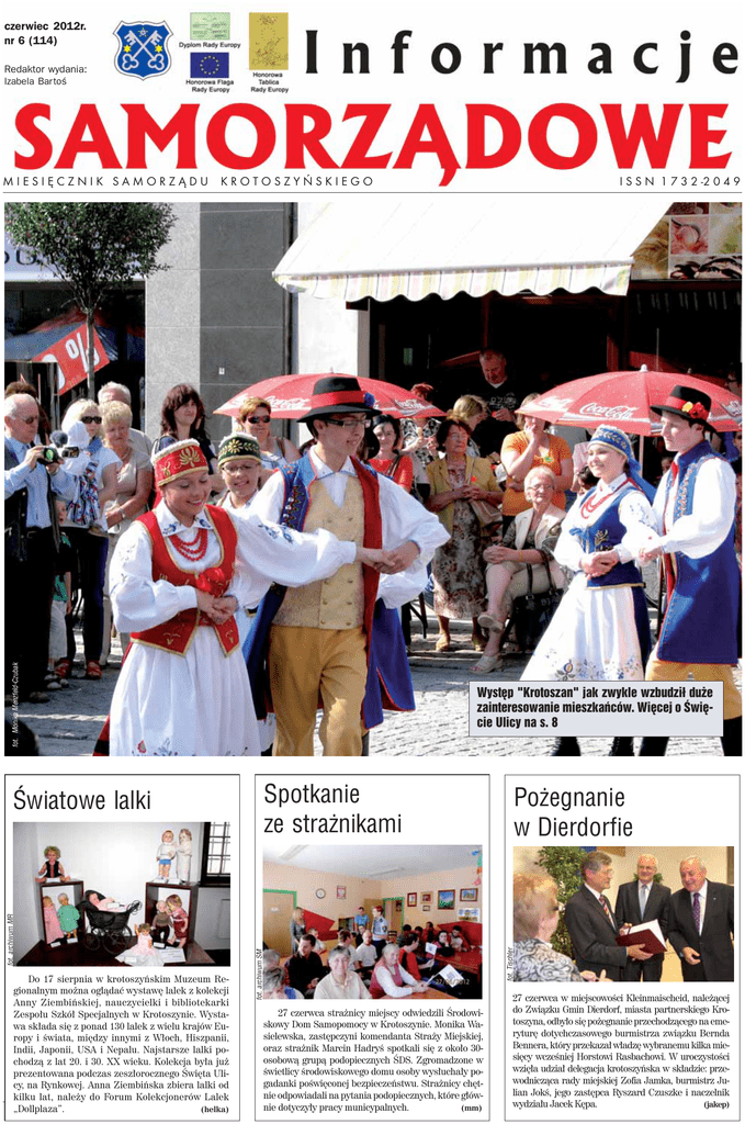 www.is.krotoszyn.pl czerwiec 2012r. 6 (114) nr 6 (114) Redaktor wydania: Izabela Bartoœ KROTOSZYŃSKIEGO fot. Monika Menzfeld-Czubak MIESIĘCZNIK SAMORZĄDU Wystêp "Krotoszan" jak zwykle wzbudzi³ du¿e zainteresowanie mieszkañców. Wiêcej o Œwiêcie Ulicy na s. 8 Spotkanie ze stra¿nikami Po¿egnanie w Dierdorfie fot. Tischler fot. Monika Menzfeld-Czubak fot. archiwum SM fot. archiwum MR Œwiatowe lalki Do 17 sierpnia w krotoszyńskim Muzeum Regionalnym można oglądać wystawę lalek z kolekcji Anny Ziembińskiej, nauczycielki i bibliotekarki Zespołu Szkół Specjalnych w Krotoszynie. Wystawa składa się z ponad 130 lalek z wielu krajów Europy i świata, między innymi z Włoch, Hiszpanii, Indii, Japonii, USA i Nepalu. Najstarsze lalki pochodzą z lat 20. i 30. XX wieku. Kolekcja była już prezentowana podczas zeszłorocznego Święta Ulicy, na Rynkowej. Anna Ziembińska zbiera lalki od kilku lat, należy do Forum Kolekcjonerów Lalek (helka) „Dollplaza”. I S S N 1 7 3 2 -2 0 4 9 27 czerwca strażnicy miejscy odwiedzili Środowiskowy Dom Samopomocy w Krotoszynie. Monika Wasielewska, zastępczyni komendanta Straży Miejskiej, oraz strażnik Marcin Hadryś spotkali się z około 30osobową grupą podopiecznych ŚDS. Zgromadzone w świetlicy środowiskowego domu osoby wysłuchały pogadanki poświęconej bezpieczeństwu. Strażnicy chętnie odpowiadali na pytania podopiecznych, które głównie dotyczyły pracy municypalnych. (mm) 27 czerwca w miejscowości Kleinmaischeid, należącej do Związku Gmin Dierdorf, miasta partnerskiego Krotoszyna, odbyło się pożegnanie przechodzącego na emeryturę dotychczasowego burmistrza związku Bernda Bennera, który przekazał władzę wybranemu kilka miesięcy wcześniej Horstowi Rasbachowi. W uroczystości wzięła udział delegacja krotoszyńska w składzie: przewodnicząca rady miejskiej Zofia Jamka, burmistrz Julian Jokś, jego zastępca Ryszard Czuszke i naczelnik wydziału Jacek Kępa. (jakep) 1 6 (114) Do 31 sierpnia na II piêtrze biblioteki w godzinach jej otwarcia mo¿na ogl¹daæ wystawê fotografii 6. Miêdzynarodowego Biennale Fotografii Artystycznej „Dziecko”. Ekspozycjê udostêpni³a Wojewódzka Biblioteka Publiczna i Centrum Animacji Kultury w Poznaniu, w ramach Objazdowej Galerii Wielkopolskiej Fotografii. W lipcu i sierpniu Krotoszyñska Biblioteka Publiczna im. Arkadego Fiedlera zaprasza od 9.00 do 17.00 od poniedzia³ku do pi¹tku. Kryta p³ywalnia Wodnik czynna jest od 6.00 do 23.00 przez ca³y tydzieñ, a basen na Ogrodowskiego – od 10.00 do 19.00. Muzeum czynne bez zmian: poniedzia³ek, wtorek, czwartek, pi¹tek od godz. 10.00 do 16.00, w œrodê od 10.00 – 18.00, w pierwsz¹ i trzeci¹ niedzielê miesi¹ca od 9.00 – 14.00, w soboty i pozosta³e niedziele - po wczeœniejszym zg³oszeniu dla grup co najmniej 10—osobowych. Urz¹d Miejski w Krotoszynie Centrala Faks Punkt Informacyjny Sekretariat Burmistrza Biuro Rady Miejskiej Stra¿ Miejska (62) (62) (62) (62) (62) (62) (62) 725 725 722 722 722 722 722 42 34 74 74 74 74 74 01 36 58 14 51 07 57 Burmistrz Julian Jokœ przyjmuje interesantów we wtorki w godz. 15.30 – 16.30. Przewodnicz¹ca Rady Miejskiej Zofia Jamka przyjmuje interesantów we wtorki w godz. 14.00 – 15.00. Starostwo Powiatowe (62) 725 42 56 (62) 725 42 57 Powiatowy Urz¹d Pracy (62) 725 36 84 (62) 725 44 56 Komenda Powiatowa Policji w Krotoszynie (62) 725 52 00 Komenda Powiatowa Pañstwowej Stra¿y Po¿arnej (62) 725 29 21 (62) 725 29 22 Miejsko-Gminny Oœrodek Pomocy Spo³ecznej (62) 725 36 68 (62) 725 39 96 Urz¹d Skarbowy 2 Ochotnicza Straż Pożarna w Bożacinie informuje, że zakończona została realizacja projektu pt. Przebudowa obiektu wypoczynku i rekreacji w Bożacinie. Projekt był współfinansowany ze środków Urzędu Marszałkowskiego Województwa Wielkopolskiego w zakresie małych projektów w ramach działania 413 „Wdrażanie lokalnych strategii rozwoju” objętego Programem Rozwoju Obszarów Wiejskich na lata 2007-2012. Wartość projektu wy- Jako że wakacje blisko, bibliotekarki przygotowały dla dzieci wakacyjne konkursy i łamigłówki. Uczniowie wysłuchali też wierszy terapeutycznych Agnieszki Łaby. Na zakończenie wszyscy wzięli udział w malowaniu twarzy – rysunki powstawały według bogatej fantazji uczestników. Beata Waleńska nosi 33 144,16 zł. Celem projektu jest umożliwienie mieszkańcom, a szczególnie dzieciom i młodzieży, zagospodarowanie wolnego czasu. Karol Bielarz, prezes OSP Beniczanie na festynie Œlubowali wype³nianie obowi¹zków 29 czerwca kolejni pracownicy samorządowi złożyli ślubowanie. Zgodnie z przepisami od 1 stycznia 2009 roku każdy, kto podejmuje po raz pierwszy pracę na stanowisku urzędniczym, musi przejść służbę przygotowawczą. Służba obejmuje zarówno teoretyczne, jak i praktyczne przygotowanie do pracy na danym stanowisku i kończy się egzaminem. Pozytywny wynik egzaminu oraz złożenie ślubowania jest warunkiem dalszego zatrudnienia pracownika. W przypadku osób, które kończyły służbę przygotowawczą w naszym urzędzie w czerwcu, wiązało się to również ze szkoleniami przeprowadzanymi w formie kursów e-learningowych, w ramach unijnego projektu „Szkolenia i pomoc doradcza w zakresie etyk i unikania konfliktu interesu w samorządzie terytorialnym”. nadzorowanego przez Ministerstwo Spraw Wewnętrznych i Administracji, dzisiejsze Ministerstwo Administracji i Cyfryzacji. Egzamin na portalu ministerstwa obejmował m.in. zagadnienia finansów publicznych, postępowania administracyjnego, prawa zamówień publicznych, dostępu do informacji publicznej, ochrony danych osobowych i informacji niejawnych, a także kwestie związane z etyką i kulturą pracy urzędnika. Urzędnicy zdawali również egzamin w swojej macierzystej jednostce. Po zaliczeniu egzaminów w obecności burmistrza i reprezentantów kierownictwa urzędu zostały złożone uroczyste ślubowania. Złożyły je: Sylwia Nawrocka,