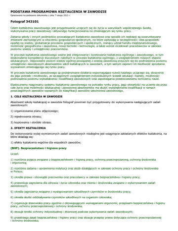 PODSTAWA PROGRAMOWA KSZTAŁCENIA W ZAWODZIE Opracowano na podstawie dokumentu z dnia 7 lutego 2012 r. Fotograf 343101 Celem kształcenia zawodowego jest przygotowanie uczących się do życia w warunkach współczesnego świata, wykonywania pracy zawodowej i aktywnego funkcjonowania na zmieniającym się rynku pracy. Zadania szkoły i innych podmiotów prowadzących kształcenie zawodowe oraz sposób ich realizacji są uwarunkowane zmianami zachodzącymi w otoczeniu gospodarczospołecznym, na które wpływają w szczególności: idea gospodarki opartej na wiedzy, globalizacja procesów gospodarczych i społecznych, rosnący udział handlu międzynarodowego, mobilność geograficzna i zawodowa, nowe techniki i technologie, a także wzrost oczekiwań pracodawców w zakresie poziomu wiedzy i umiejętności pracowników. W procesie kształcenia zawodowego ważne jest integrowanie i korelowanie kształcenia ogólnego i zawodowego, w tym doskonalenie kompetencji kluczowych nabytych w procesie kształcenia ogólnego, z uwzględnieniem niższych etapów edukacyjnych. Odpowiedni poziom wiedzy ogólnej powiązanej z wiedzą zawodową przyczyni się do podniesienia poziomu umiejętności zawodowych absolwentów szkół kształcących w zawodach, a tym samym zapewni im możliwość sprostania wyzwaniom zmieniającego się rynku pracy. W procesie kształcenia zawodowego są podejmowane działania wspomagające rozwój każdego uczącego się, stosownie do jego potrzeb i możliwości, ze szczególnym uwzględnieniem indywidualnych ścieżek edukacji i kariery, możliwości podnoszenia poziomu wykształcenia i kwalifikacji zawodowych oraz zapobiegania przedwczesnemu kończeniu nauki. Elastycznemu reagowaniu systemu kształcenia zawodowego na potrzeby rynku pracy, jego otwartości na uczenie się przez całe życie oraz mobilności edukacyjnej i zawodowej absolwentów ma służyć wyodrębnienie kwalifikacji w ramach poszczególnych zawodów wpisanych do klasyfikacji zawodów szkolnictwa zawodowego. 1. CELE KSZTAŁCENIA W ZAWODZIE Absolwent szkoły kształcącej w zawodzie fotograf powinien być przygotowany do wykonywania następujących zadań zawodowych: 1) organizowania planu zdjęciowego; 2) rejestrowania obrazu; 3) kopiowania i obróbki obrazu. 2. EFEKTY KSZTAŁCENIA Do wykonywania wyżej wymienionych zadań zawodowych niezbędne jest osiągnięcie zakładanych efektów kształcenia, na które składają się: 1) efekty kształcenia wspólne dla wszystkich zawodów; (BHP). Bezpieczeństwo i higiena pracy Uczeń: 1) rozróżnia pojęcia związane z bezpieczeństwem i higieną pracy, ochroną przeciwpożarową, ochroną środowiska i ergonomią; 2) rozróżnia zadania i uprawnienia instytucji oraz służb działających w zakresie ochrony pracy i ochrony środowiska w Polsce; 3) określa prawa i obowiązki pracownika oraz pracodawcy w zakresie bezpieczeństwa i higieny pracy; 4) przewiduje zagrożenia dla zdrowia i życia człowieka oraz mienia i środowiska związane z wykonywaniem zadań zawodowych; 5) określa zagrożenia związane z występowaniem szkodliwych czynników w środowisku pracy; 6) określa skutki oddziaływania czynników szkodliwych na organizm człowieka; 7) organizuje stanowisko pracy zgodnie z obowiązującymi wymaganiami ergonomii, przepisami bezpieczeństwa i higieny pracy, ochrony przeciwpożarowej i ochrony środowiska; 8) stosuje środki ochrony indywidualnej i zbiorowej podczas wykonywania zadań zawodowych; 9) przestrzega zasad bezpieczeństwa i higieny pracy oraz stosuje przepisy prawa dotyczące ochrony przeciwpożarowej i ochrony środowiska; 10) udziela pierwszej pomocy poszkodowanym w wypadkach przy pracy oraz w stanach zagrożenia zdrowia i życia. (PDG). Podejmowanie i prowadzenie działalności gospodarczej Uczeń: 1) stosuje pojęcia z obszaru funkcjonowania gospodarki rynkowej; 2) stosuje przepisy prawa pracy, przepisy prawa dotyczące ochrony danych osobowych oraz przepisy prawa podatkowego i prawa autorskiego; 3) stosuje przepisy prawa dotyczące prowadzenia działalności gospodarczej; 4) rozróżnia przedsiębiorstwa i instytucje występujące w branży i powiązania między nimi; 5) analizuje działania prowadzone przez przedsiębiorstwa funkcjonujące w branży; 6) inicjuje wspólne przedsięwzięcia z różnymi przedsiębiorstwami z branży; 7) przygotowuje dokumentację niezbędną do uruchomienia i prowadzenia działalności gospodarczej; 8) prowadzi korespondencję związaną z prowadzeniem działalności gospodarczej; 9) obsługuje urządzenia biurowe oraz stosuje programy komputerowe wspomagające prowadzenie działalności gospodarczej; 10) planuje i podejmuje działania marketingowe prowadzonej działalności gospodarczej; 11) optymalizuje koszty i przychody prowadzonej działalności gospodarczej. (JOZ). Język obcy ukierunkowany zawodowo Uczeń: 1) posługuje się zasobem środków językowych (leksykalnych, gramatycznych, ortograficznych oraz fonetycznych), umożliwiających realizację zadań zawodowych; 2) interpretuje wypowiedzi dotyczące wykonywania typowych czynności zawodowych artykułowane powoli i wyraźnie, w standardowej odmianie języka; 3) analizuje i interpretuje krótkie teksty pisemne dotyczące wykonywania typowych czynności zawodowych; 4) formułuje krótkie i zrozumiałe wypowiedzi oraz teksty pisemne umożliwiające komunikowanie się w środowisku pracy; 5) korzysta z obcojęzycznych źródeł informacji. (KPS). Kompetencje personalne i społeczne Uczeń: 1) przestrzega zasad kultury i etyki; 2) jest kreatywny i konsekwentny w realizacji zadań; 3) przewiduje skutki podejmowanych działań; 4) jest otwarty na zmiany; 5) potrafi radzić sobie ze stresem; 6) aktualizuje wiedzę i doskonali umiejętności zawodowe; 7) przestrzega tajemnicy zawodowej; 8) potrafi ponosić odpowiedzialność za podejmowane działania; 9) potrafi negocjować warunki porozumień; 10) współpracuje w zespole. 2) efekty kształcenia wspólne dla za