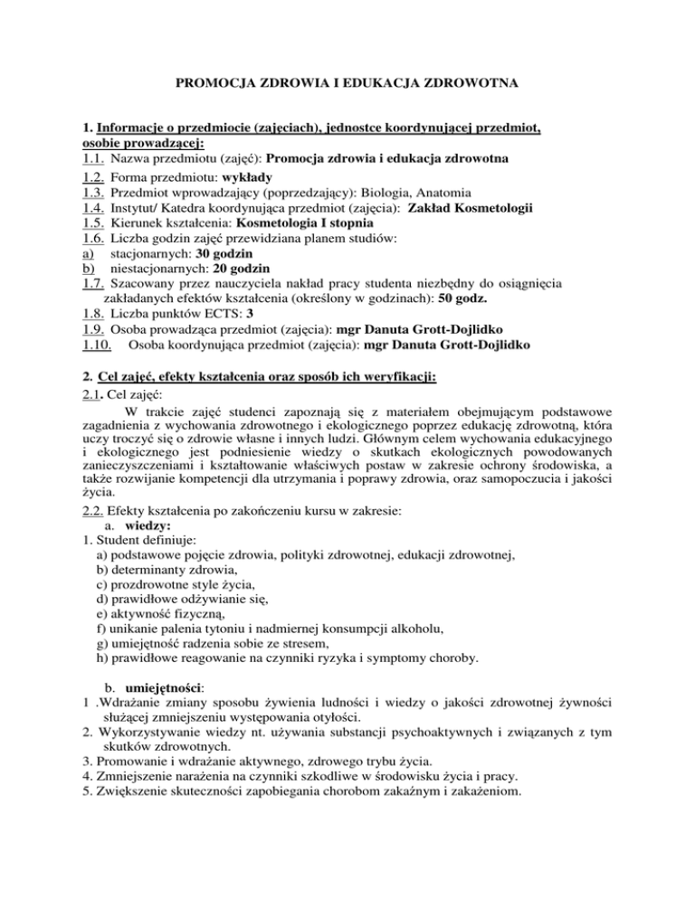 PROMOCJA ZDROWIA I EDUKACJA ZDROWOTNA 1. Informacje o
