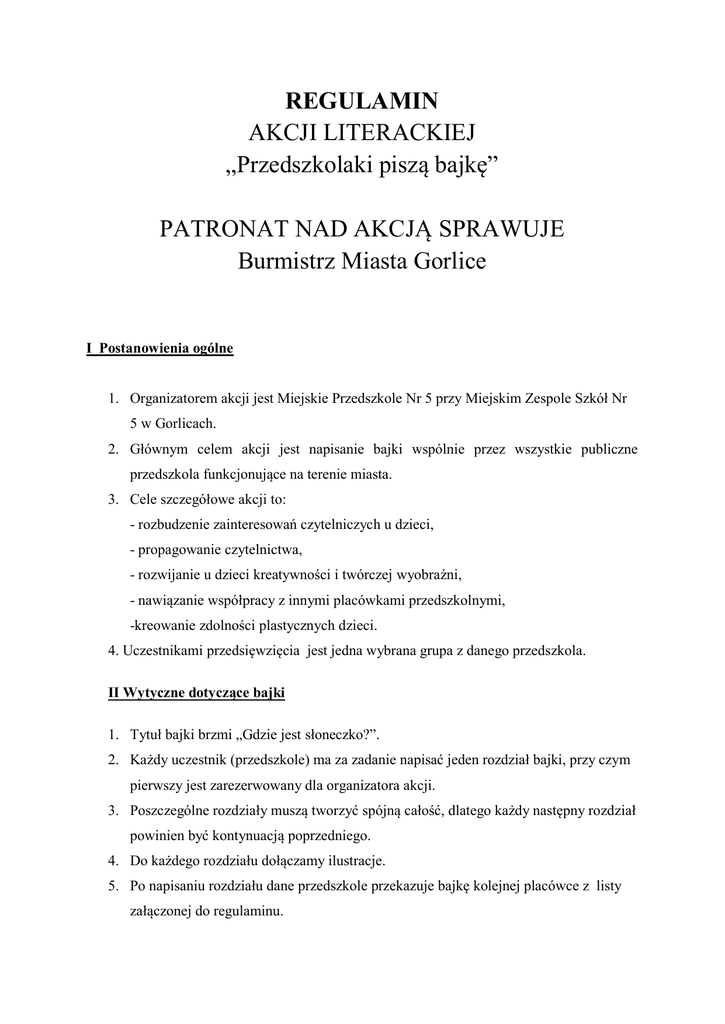 REGULAMIN AKCJI LITERACKIEJ „Przedszkolaki piszą bajkę” PATRONAT NAD AKCJĄ SPRAWUJE Burmistrz Miasta Gorlice I Postanowienia ogólne 1. Organizatorem akcji jest Miejskie Przedszkole Nr 5 przy Miejskim Zespole Szkół Nr 5 w Gorlicach. 2. Głównym celem akcji jest napisanie bajki wspólnie przez wszystkie publiczne przedszkola funkcjonujące na terenie miasta. 3. Cele szczegółowe akcji to: - rozbudzenie zainteresowań czytelniczych u dzieci, - propagowanie czytelnictwa, - rozwijanie u dzieci kreatywności i twórczej wyobraźni, - nawiązanie współpracy z innymi placówkami przedszkolnymi, -kreowanie zdolności plastycznych dzieci. 4. Uczestnikami przedsięwzięcia jest jedna wybrana grupa z danego przedszkola. II Wytyczne dotyczące bajki 1. Tytuł bajki brzmi „Gdzie jest słoneczko?”. 2. Każdy uczestnik (przedszkole) ma za zadanie napisać jeden rozdział bajki, przy czym pierwszy jest zarezerwowany dla organizatora akcji. 3. Poszczególne rozdziały muszą tworzyć spójną całość, dlatego każdy następny rozdział powinien być kontynuacją poprzedniego. 4. Do każdego rozdziału dołączamy ilustracje. 5. Po napisaniu rozdziału dane przedszkole przekazuje bajkę kolejnej placówce z listy załączonej do regulaminu. 6. Prace powinny spełniać następujące kryteria: - forma papierowa A4 i jej kopia zapisana na płycie CD, - tekst pisany czcionką Times New Roman, rozmiar czcionki 16, - technika prac plastycznych to kredki ołówkowe - rozdział powinien zawierać swój tytuł, - każde z przedszkoli dołącza do rozdziału bajki nazwę przedszkola, nazwę grupy piszącej bajkę , imiona dzieci które rysowały ilustracje do bajki oraz imię i nazwisko nauczyciela danej grupy. - rozdział nie może być krótszy niż strona, a nie dłuższy niż 3 strony. 7. Do każdej pracy prosimy dołączyć zaświadczenie Dyrektora/ Kierownika placówki o wyrażeniu zgody na przetwarzanie danych osobowych uczestników akcji. 8. Akcja kończy się opublikowaniem i wydrukowaniem bajki. 9. Każde z przedszkoli w podziękowaniu za swoją pracę i włożony trud, otrzyma jeden egzemplarz bajki oraz certyfikat z uczestnictwa w akcji. 10. Więcej informacji na temat opisanego przedsięwzięcia można uzyskać u nauczycielek Miejskiego Przedszkola Nr 5 pod następującymi numerami telefonów: - 785 868 211 mgr Katarzyna Trzaskoś, - 665 920 370 mgr Katarzyna Barczyk III Harmonogram akcji 1. Akcję literacką rozpoczynamy 21.11.2016 roku 2. Czas na napisanie rozdziału przez jednego uczestnika to dwa tygodnie 3. Termin napisania ostatniego rozdziału przewidywany jest na dzień 28. 02. 2017 roku. 4. Okres od 01. 03. 2017 roku do 30. 04. 2017 roku to czas na edytowanie i drukowanie bajki. 5. W czasie obchodów Dni Gorlic tekst zostanie uroczyście zaprezentowany i odczytany przez znanych Gorliczan.