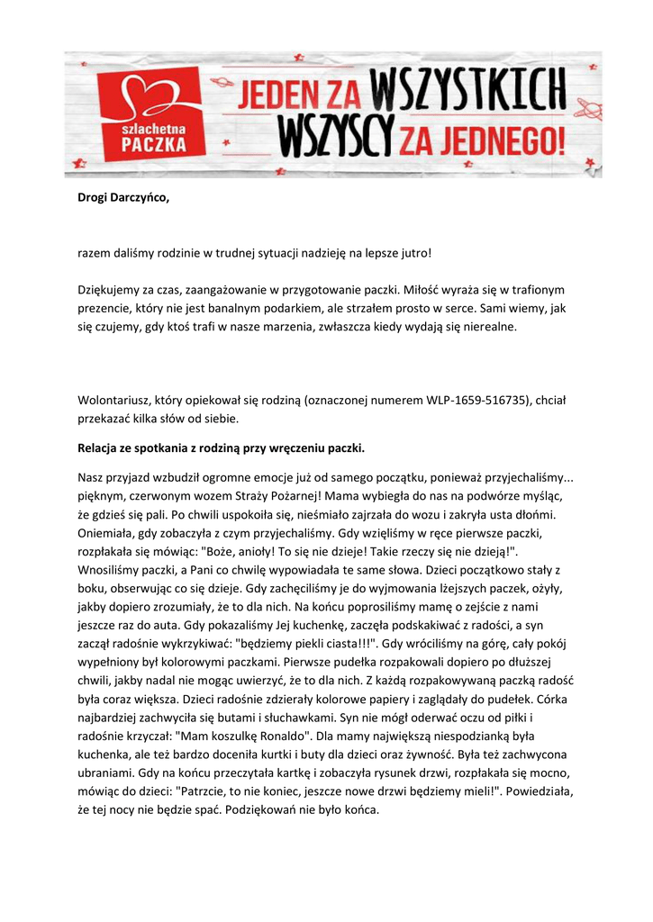 Drogi Darczyńco, razem daliśmy rodzinie w trudnej sytuacji nadzieję na lepsze jutro! Dziękujemy za czas, zaangażowanie w przygotowanie paczki. Miłość wyraża się w trafionym prezencie, który nie jest banalnym podarkiem, ale strzałem prosto w serce. Sami wiemy, jak się czujemy, gdy ktoś trafi w nasze marzenia, zwłaszcza kiedy wydają się nierealne. Wolontariusz, który opiekował się rodziną (oznaczonej numerem WLP-1659-516735), chciał przekazać kilka słów od siebie. Relacja ze spotkania z rodziną przy wręczeniu paczki. Nasz przyjazd wzbudził ogromne emocje już od samego początku, ponieważ przyjechaliśmy... pięknym, czerwonym wozem Straży Pożarnej! Mama wybiegła do nas na podwórze myśląc, że gdzieś się pali. Po chwili uspokoiła się, nieśmiało zajrzała do wozu i zakryła usta dłońmi. Oniemiała, gdy zobaczyła z czym przyjechaliśmy. Gdy wzięliśmy w ręce pierwsze paczki, rozpłakała się mówiąc: "Boże, anioły! To się nie dzieje! Takie rzeczy się nie dzieją!". Wnosiliśmy paczki, a Pani co chwilę wypowiadała te same słowa. Dzieci początkowo stały z boku, obserwując co się dzieje. Gdy zachęciliśmy je do wyjmowania lżejszych paczek, ożyły, jakby dopiero zrozumiały, że to dla nich. Na końcu poprosiliśmy mamę o zejście z nami jeszcze raz do auta. Gdy pokazaliśmy Jej kuchenkę, zaczęła podskakiwać z radości, a syn zaczął radośnie wykrzykiwać: "będziemy piekli ciasta!!!". Gdy wróciliśmy na górę, cały pokój wypełniony był kolorowymi paczkami. Pierwsze pudełka rozpakowali dopiero po dłuższej chwili, jakby nadal nie mogąc uwierzyć, że to dla nich. Z każdą rozpakowywaną paczką radość była coraz większa. Dzieci radośnie zdzierały kolorowe papiery i zaglądały do pudełek. Córka najbardziej zachwyciła się butami i słuchawkami. Syn nie mógł oderwać oczu od piłki i radośnie krzyczał: "Mam koszulkę Ronaldo". Dla mamy największą niespodzianką była kuchenka, ale też bardzo doceniła kurtki i buty dla dzieci oraz żywność. Była też zachwycona ubraniami. Gdy na końcu przeczytała kartkę i zobaczyła rysunek drzwi, rozpłakała się mocno, mówiąc do dzieci: "Patrzcie, to nie koniec, jeszcze nowe drzwi będziemy mieli!". Powiedziała, że tej nocy nie będzie spać. Podziękowań nie było końca. Co chce Państwu przekazać wolontariusz: Bardzo dziękuję za tak rzetelne i profesjonalne podejście do tematu i za wspaniały kontakt. Od początku wiedziałam, że jesteście Państwo bardzo zaangażowani w akcję. Same paczki były pięknie zapakowane, zawartość pieczołowicie i mądrze skomponowana. Współpraca z takim Darczyńcą to czysta przyjemność! Dziękuję i zapraszam również w przyszłym roku! Życzę Państwu wesołych Świąt! Co chce Państwu powiedzieć od siebie rodzina: Bardzo, bardzo dziękują za pomoc. Spadła im ona jak z nieba, w bardzo trudnym momencie (dwa dni wcześniej komornik zajął Pani konto za długi męża i zabrakło by im pieniędzy nawet na jedzenie). To najpiękniejsze, co ich spotkało w życiu. Będą Państwa już na zawsze nosić w sercach. Rodzina życzy Wam pięknych, zdrowych i szczęśliwych Świąt i dziękuje za ogromną pomoc. W XV edycji SZLACHETNEJ PACZKI impuls do zmiany otrzymało ponad 20 700 rodzin, których odwiedziło ponad 10 000 wolontariuszy. Paczki przygotowało ponad 700 000 darczyńców. Dziękujemy, że byłeś wśród nich. W załączniku e-maila znajdziesz imienny certyfikat z podziękowaniem za udział w projekcie.