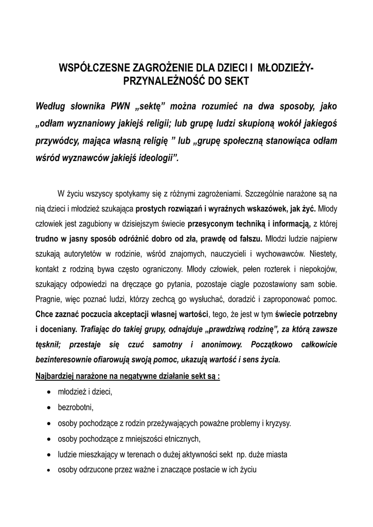 WSPÓŁCZESNE ZAGROŻENIE DLA DZIECI I MŁODZIEŻYPRZYNALEŻNOŚĆ DO SEKT Według słownika PWN „sektę” można rozumieć na dwa sposoby, jako „odłam wyznaniowy jakiejś religii; lub grupę ludzi skupioną wokół jakiegoś przywódcy, mająca własną religię ” lub „grupę społeczną stanowiąca odłam wśród wyznawców jakiejś ideologii”. W życiu wszyscy spotykamy się z różnymi zagrożeniami. Szczególnie narażone są na nią dzieci i młodzież szukająca prostych rozwiązań i wyraźnych wskazówek, jak żyć. Młody człowiek jest zagubiony w dzisiejszym świecie przesyconym techniką i informacją, z której trudno w jasny sposób odróżnić dobro od zła, prawdę od fałszu. Młodzi ludzie najpierw szukają autorytetów w rodzinie, wśród znajomych, nauczycieli i wychowawców. Niestety, kontakt z rodziną bywa często ograniczony. Młody człowiek, pełen rozterek i niepokojów, szukający odpowiedzi na dręczące go pytania, pozostaje ciągle pozostawiony sam sobie. Pragnie, więc poznać ludzi, którzy zechcą go wysłuchać, doradzić i zaproponować pomoc. Chce zaznać poczucia akceptacji własnej wartości, tego, że jest w tym świecie potrzebny i doceniany. Trafiając do takiej grupy, odnajduje „prawdziwą rodzinę”, za którą zawsze tęsknił; przestaje się czuć samotny i anonimowy. Początkowo całkowicie bezinteresownie ofiarowują swoją pomoc, ukazują wartość i sens życia. Najbardziej narażone na negatywne działanie sekt są : młodzież i dzieci, bezrobotni, osoby pochodzące z rodzin przeżywających poważne problemy i kryzysy. osoby pochodzące z mniejszości etnicznych, ludzie mieszkający w terenach o dużej aktywności sekt np. duże miasta osoby odrzucone przez ważne i znaczące postacie w ich życiu Sygnałem alarmowym może być: Nieograniczona władza przywódcy danej grupy. W zagrożonej grupie kładzie się duży nacisk na gromadzenie pieniędzy bez możliwości ich wydatkowania. Jednostka nie ma prawa w każdej chwili zrezygnować z członkostwa, jest zastraszana fizycznie lub psychicznie przez przywódcę lub inne osoby z grupy. Inaczej pod względem doktryny i historii ruchu przedstawia się go na początku członkostwa, a inaczej po pewnym czasie. Członkowie mają utrudniony kontakt z rodzinami, ale jednocześnie obowiązek zakładania ich wewnątrz sekt. Członkowie mają ograniczony dopływ informacji ze światem zewnętrznym. Manipulacja mentalna członkami grupy, tzn. świat zewnętrzny przedstawia się im jako zło i niebezpieczeństwo Po czym poznać sektę? Na czele grupy stoi mistrz lub guru, który posiada najwyższą wiedzę i jest przez wszystkich czczony Pojawiają się wizje nieuchronnego końca świata, a jedyną osobą, która może temu zapobiec jest guru lub mistrz Szansę na zbawienie ma tylko grupa, do której dziecko przynależy Dziecko przestaje się uczyć, wagaruje, rezygnuje ze swoich dawnych zainteresowań, za najważniejszą naukę uważa przesłanie sekty Racjonalne myślenie jest całkowicie odrzucane, a dziecko jest zdania, że tylko ta grupa ma rację Wszystkie osoby występujące przeciwko grupie, są uznawane za wrogów Tylko grupa jest prawdziwą rodziną dziecka i tworzy jedną, nierozerwalną wspólnotę Grupa ingeruje w życie dziecka, domaga się zerwania dotychczasowych więzów z rodziną i znajomymi. Narzuca swym członkom ubiór, sposób żywienia, własny język Żąda bezwarunkowego posłuszeństwa i podporządkowania się panującym w niej regułom O przynależności do sekty, mogą świadczyć następujące sygnały: Dziecko jest milczące i zamknięte w sobie W jego słownictwie pojawiają się nieznane dotąd i niewytłumaczalne zwroty Spędza dużo czasu z nowymi przyjaciółmi, Odnosi się do wszystkiego krytycznie Nie potrafi zachować dystansu Głosi nowe poglądy i zmienia sposób formułowania swoich myśli Traci własną osobowość Nie potrafi myśleć abstrakcyjnie Porzuca dotychczasowe nawyki żywieniowe Odnosi się z dystansem i chłodem do rodziców, zrywa kontakty z dotychczasowymi przyjaciółmi Jest przemęczone i senne, szybko traci dotychczasową wagę. W celu ochrony dzieci i młodzieży przed sektami należy: uatrakcyjniać sposób formy spędzania wolnego czasu, propagować wzorce prorodzinne w sferze psychologicznej, społecznej i ekonomicznej. Staraj się jak najwięcej dowiedzieć o grupie, do której należy twoje dziecko. Utrzymuj kontakt ze swoim dzieckiem. Podtrzymuj każdą inicjatywę rozmowy, z jaką wystąpi twoje dziecko. Pedagog szkolny