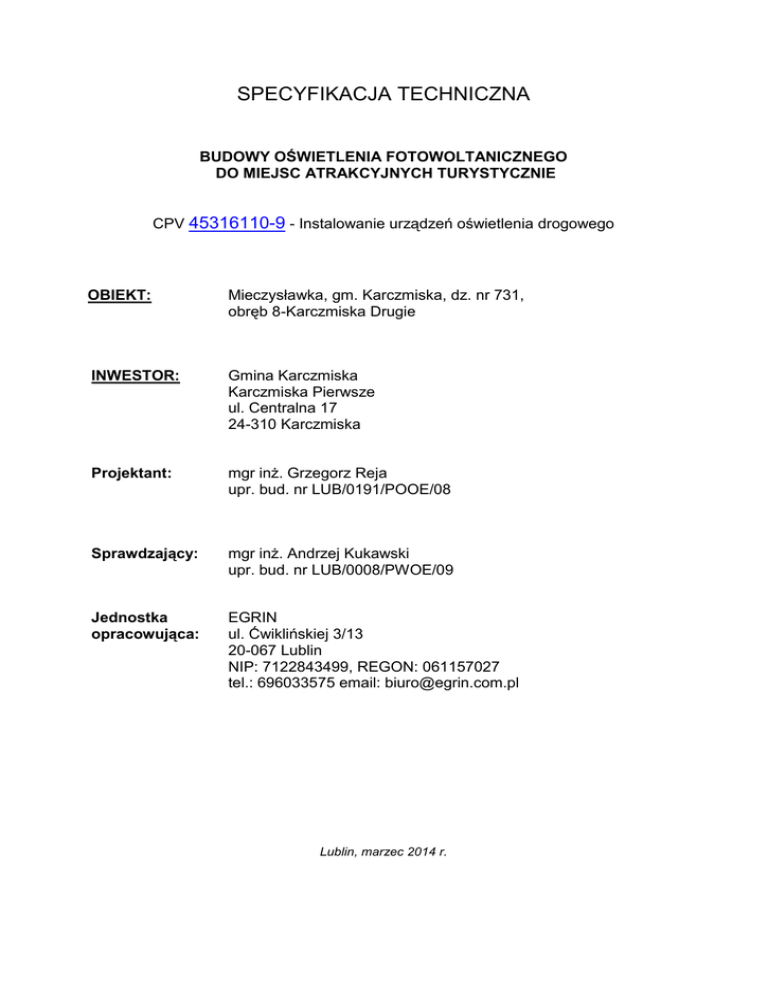 SPECYFIKACJA TECHNICZNA BUDOWY OŚWIETLENIA FOTOWOLTANICZNEGO DO MIEJSC ATRAKCYJNYCH TURYSTYCZNIE CPV 45316110-9 - Instalowanie urządzeń oświetlenia drogowego OBIEKT: Mieczysławka, gm. Karczmiska, dz. nr 731, obręb 8-Karczmiska Drugie INWESTOR: Gmina Karczmiska Karczmiska Pierwsze ul. Centralna 17 24-310 Karczmiska Projektant: mgr inż. Grzegorz Reja upr. bud. nr LUB/0191/POOE/08 Sprawdzający: mgr inż. Andrzej Kukawski upr. bud. nr LUB/0008/PWOE/09 Jednostka opracowująca: EGRIN ul. Ćwiklińskiej 3/13 20-067 Lublin NIP: 7122843499, REGON: 061157027 tel.: 696033575 email: [email protected] Lublin, marzec 2014 r. 1. WSTĘP 1.1. Przedmiot Szczegółowej Specyfikacji technicznej (SST) Przedmiotem niniejszej SST są wymagania dotyczące wykonania i odbioru oświetlenia fotowoltaicznego w ramach: PROJEKT BUDOWLANO-WYKONAWCZY BUDOWY OŚWIETLENIA FOTOWOLTAICZNEGO DO MIEJSC ATRAKCYJNYCH TURYSTYCZNIE w miejscowości Mieczysławka, gm. Karczmiska, dz. nr 731, obręb 8-Karczmiska Drugie. 1.2. Zakres stosowania SST Szczegółowa Specyfikacja Techniczna będzie stosowana, jako dokument kontraktowy przy zlecaniu i realizacji robót wymienionych w punkcie 1.1. 1.3. Zakres robót objętych SST Ustalenia zawarte w niniejszej specyfikacji dotyczą zasad prowadzenia robót związanych z montażem zestawu hybrydowego fotowoltaicznego. 1.4. Określenia podstawowe 1.4.1. Słup - konstrukcja wsporcza osadzona bezpośrednio w gruncie, służąca do zamocowania zestawu hybrydowego. 1.4.2. Wysięgnik - element rurowy łączący słup z oprawą. 1.4.3. Oprawa oświetleniowa - urządzenie służące do rozdziału, filtracji i przekształcania strumienia świetlnego wysyłanego przez źródło światła, zawierające wszystkie niezbędne detale do przymocowania i połączenia z instalacją elektryczną. 1.4.4. Przewód - przewodnik wielożyłowy izolowany, przystosowany do przewodzenia prądu elektrycznego. 1.4.5. Ustój - rodzaj fundamentu dla słupów oświetleniowych. 1.4.7. Dodatkowa ochrona przeciwporażeniowa - ochrona części przewodzących dostępnych w wypadku pojawienia się na nich napięcia w warunkach zakłóceniowych. 1.4.8. Pozostałe określenia podstawowe są zgodne z obowiązującymi odpowiednimi Polskimi Normami. 2. MATERIAŁY Wszystkie materiały i elementy instalacji muszą posiadać odpowiednie certyfikaty dopuszczające do stosowania w budownictwie, atesty, deklaracji itp. Wykonawca przeprowadza rozruchy poszczególnych instalacji, dostarcza instrukcje lub DTR-ki oraz udziela gwarancji prawidłowego działania na wszystkie wykonane prace i dostarczone elementy. 2.1 Elementy gotowe 2.1.1. Przewody Do połączenia paneli PV stosować przewody dedykowane do fotowoltaiki (czarne) min. 1,5mm2 (dla 2x130Wp) i min. 4mm2 (dla 1x245Wp) Do połączenia turbiny stosować przewody min. 3x1.5mm2 - OW (ogumowane, wielożyłowe, czarne).Do połączenia lamp stosować przewody min 2x1mm2 - OW (ogumowane, wielożyłowe, czarne). Wszystkie przewody odporne na działanie czynników zewnętrznych i UV. Wszystkie końce przewodu zaopatrzone w zaciśnięte końcówki kablowe. 2.1.2. Źródła światła i oprawy 1. Źródła światła i oprawy Korpus oprawy wykonany z wysokociśnieniowego aluminium malowanego metodą proszkową. Napięcie pracy 36VDC, wydajność świetlna 120lm/W potwierdzona raportem z badań fotometrycznych przeprowadzonych przez niezależną jednostkę certyfikującą w UE Technologia Chip LED (COB),1x chip COB LED 50W Oprawa o asymetrycznym rozsyle światła, wyposażona w jedną soczewkę kształtującą bryłę fotometryczną Obudowa będąca jednocześnie radiatorem grubożebrowym, samoczyszczącym (pozwalający na łatwe wymywanie zanieczyszczeń przez deszcz) Lampa nie może zawierać w sobie żadnych elementów elektroniki. Lampa musi posiadać wyniki badań fotometrycznych potwierdzonych przez niezależną jednostkę badawczą z UE oraz pliki fotometryczne. Deklaracja CE 2.1.3. Słupy - konstrukcje wsporcze Słupy min 8m, stalowe, ocynkowane. Słupy powinny przenieść obciążenia wynikające z zawieszenia opraw i wysięgników oraz parcia wiatru dla I strefy wiatrowej, zgodnie z PN-75/E-05100 [12]. uwzględniającej wielkość panela PV oraz średnicę turbiny wiatrowej .W dolnej części słupy powinny posiadać jedną lub dwie wnęki zamykane drzwiczkami. Wnęka lub wnęki powinny być przystosowane do zainstalowania typowej tabliczki bezpiecznikowo-zaciskowej. Elementy powinny być proste w granicach dopuszczalnych odchyłek podanych w dokumentacji projektowej i PN-90/B-03200 [7].Wymaga się deklaracji producenta słupów, iż zostały one policzone dla obciążeń wynikających z zainstalowanego sprzętu. 2.1.4. Fundamenty Fundamenty prefabrykowane typu F-xxx, przeznaczone są do posadowienia słupów oświetleniowych. Fundamenty należy instalować w gruncie o nośności nie mniejszej niż 0,2 MPa. Fundamenty muszą być wykonane z betonu zbrojonego klasy C25/30 z odpowiednimi kanałami do wprowadzenia kabli. W zależności od rozmiarów, fundamenty wykonywane są w wersji jednolitego bloku betonowego albo są dzielone i skręcane za pomocą śrub. W zależności od konkretnych warunków lokalizacyjnych i rodzaju wód gruntowych, należy wykonać zabezpieczenie antykorozyjne. 2.1.5. Sterownik układu hybrydowego Zintegrowany sterownik hybrydowy (solarno-wiatrowy) z funkcją śledzenia maksymalnego punktu mocy oraz komunikacji bezprzewodowej. Kontrola ładowania z paneli PV oraz 3 fazowej turbiny wiatrowej. Napięcie pracy 24VDC (nie dopuszcza się dwuzakresowych 12/24V) Wyposażony w wyświetlacz cyfrowy wskazujący napięcie ładowania (V) i prąd ładowania (A) z turbiny i paneli PV, napięcie na akumulatorze (V), pobór prądu przez oprawę (A) oraz stopień naładowania akumulatora w postaci graficznej. Posiadający funkcję regulacji momentu załączenia i wyłączenia lampy w zależności od ilości światła zewnętrznego, czasu pracy lampy Sterowanie lampą LED: 1)
