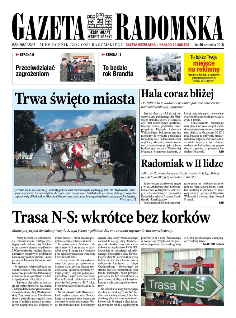 ISSN 2082–2308 M i e s i ę c z n i k R e g i o n u R a d o m s k i e g o GAZETA BEZPŁATNA | NAKŁAD 10 000 EGZ. STRONA 9 STRONA 11 Przeciwdziałać zagrożeniom To także Twoje miejsce na reklamę To będzie rok Brandta Trwa święto miasta Nr 36 czerwiec 2015 Prosimy o kontakt e-mailowy: [email protected] lub tel. 605602977 Hala coraz bliżej Do 2018 roku w Radomiu powinna powstać nowoczesna hala widowiskowo - sportowa. Jest już decyzja o lokalizacji inwestycji celu publicznego dla Miejskiego Ośrodka Sportu i Rekreacji, czyli hali widowiskowo-sportowej. Decyzja została podpisana przez prezydenta Radomia Radosława Witkowskiego. Dokument ten jest niezbędny do wydania pozwolenia na budowę hali. Podczas najbliższej sesji Rady Miejskiej radnym zostanie przedstawiony projekt uchwały, dotyczący zmian w Wieloletniej Prognozie Finansowej Radomia, w której znajdą się zapisy zapewniające płynne finansowanie inwestycji w cyklu 4-letnim. - Konsekwentnie realizujemy nasz plan, którego celem jest wybudowanie najnowocześniejszego tego typu obiektu na Mazowszu. Od 2018 roku będą się tu odbywały międzynarodowe imprezy sportowe, a także wiele innych, w tym również wydarzenia kulturalne, czy gospodarcze – powiedział prezydent Radosław Witkowski. RED Radomiak w II lidze Piłkarze Radomiaka wywalczyli awans do II ligi. Kibice uczcili to wielką fetą w centrum miasta. Rycerskie walki, sportowe biegi, koncerty, pokazy służb mundurowych, wystawy, pikniki dla całych rodzin, historyczne wspominki, festiwal artystów ulicznych – plan tegorocznych Dni Radomia jest niezwykle bogaty. Wszystko rozpoczęło się 14 Radomskim Piknikiem Historycznym, a zakończy dwa tygodnie później koncertem w Amfiteatrze. Więcej na str. 12 W pierwszym barażowym meczu z Wisłą Sandomierz padł bezbramkowy remis. W drugim ”zieloni” wygrali w Sandomierzu 2-1. Bramki dla Radomiaka zdobyli Szymon Stanisławski i Rossi Leandro. Około tysiąca kibiców klubu obej- rzało mecz na telebimie ustawionym na Placu Jagiellońskim. Z trubun stadionu w Sandomierzu mecz oglądali m.in. prezydent Radosław Witkowski i wiceprezydent Konrad Frysztak. RED Trasa N-S: wkrótce bez korków Miasto przystępuje do budowy trasy N-S, czyli północ – południe. Ma ona znacznie usprawnić ruch samochodowy. - Naszym celem jest odkorkowanie centrum miasta. Dlatego przystępujemy do budowy trasy N-S, która ma stanowić alternatywę dla ulicy 25 Czerwca i może rozwiązać jeden z najbardziej uciążliwych problemów komunikacyjnych w mieście - mówi prezydent Radomia Radosław Witkowski. W pierwszej kolejności będzie budowany odcinek trasy od ronda Mikołajczyka przy dworcu PKS do ulicy Żeromskiego w sąsiedztwie wiaduktu i połączenia z ulicą Szklaną. - Pierwsze pieniądze na realizację tej ważnej inwestycji już mamy. To dzięki dotacji, którą miasto otrzymało na budowę ulicy Młodzianowskiej. Przyznana kwota 13 milionów złotych pozwoli zaoszczędzić sporą sumę w budżecie miasta i przeznaczyć ją na poprawę sieci drogowej w innym miejscu – mówi doradca prezydenta Zbigniew Banaszkiewicz. Przygotowywana budowa odcinka trasy N-S ma ruszyć w przyszłym roku. Przetarg na wykonanie prac ogłoszony ma zostać w trzecim kwartale 2016 roku. - Do tego czasu chcemy wykonać wszystkie prace przygotowawcze. Musimy m.in. uzyskać decyzję środowiskową, opracować projekt, wykupić grunty i uzyskać pozwolenie na budowę - wylicza wiceprezydent Konrad Frysztak. Odcinek trasy N-S powinien być gotowy w 2017 roku. Projektowa wartość inwestycji to 32 mln zł. Na odcinku od ronda Mikołajczyka do węzła u zbiegu z ulicą Słowackiego trasa ma mieć dwie jezdnie, po dwa pasy w każdym kierunku. Węzeł ten umożliwi m.in. bezkolizyjny wjazd z ulicy Beliny-Prażmowskiego na wiadukt w ciągu ulicy Słowackiego, a także bezkolizyjny zjazd z wiaduktu w stronę dworców PKS i PKP. Spowoduje to odciążenie zakorkowanego lewoskrętu z ulicy Słowackiego w ulicę 25 Czerwca. Inwestycja będzie się wiązała z koniecznością wyburzenia kamienicy u zbiegu Czachowskiego i Słowackiego, po stronie przejścia podziemnego pod torami kolejowymi. Samo przejście podziemne ma być zlikwidowane, a piesi i rowerzyści będą mieli wydzielony na wiadukcie ciąg pieszo-rowerowy. Na odcinku od ulicy Słowackiego do ulicy Żeromskiego trasa N-S będzie miała jedną jezdnię, która będzie biegła bezpośrednio obok torów kolejowych. U zbiegu z ulicą Szklaną powstanie rondo z wydzielonym prawoskrętem z ulicy Żeromskiego w nową trasę. Projektanci nie przewidują wprowadzenia na drugi etap N-S linii autobusowych wymagających budowy zatok. Źródło: UM Radom 2 AKTUALNOŚCI OD REDAKCJI Z RÓŻNYCH STRON Po królewsku Ponad 90 zawodników z Polski, Ukrainy, Rosji, Hiszpanii, Szwecji wystartowało 31 maja w 18. Królewskim Gambicie Radomia. Wygrał Mateusz Bartel z Polonii Wrocław. Drugie miejsce zajął Michał Olszewski z Gliwic, a trzecie - Petr Golubka z Ukrainy. Nagrodę dla najlepszej zawodniczki otrzymała Joanna Majdan – Gajewska (uplasowała się na 13 miejscu), a wśród radomskich zawodników najwyższą – 25 lokatę – wywalczył Marcin Pomagalski z UKS MDK. Organizatorem imprezy jest Radomskie Stowarzyszenie Sportowe Gambit. To jeden z najbardziej prestiżowych turniejów szachowych w kraju. Podczas czwartej edycji gambitu Radom odwiedził nawet Anatolij Karpow. Pierwszy Królewski Gambit Radomia został rozegrano w 1997 roku, pod patronatem ówczesnego prezesa Polskiego Związku Szachowego Jacka Żemantowskiego. Po jego śmierci, od szóstej edycji turniej nosi jego imię. Przypomnijmy, że Jacek Żemantowski lata dzieciństwa i młodości spędził w Radomiu. Uprawiał wiele dyscyplin sportowych, największe sukcesy odnosił w szermierce i szachach, w tym: II miejsce w drużynowych mistrzostw Polski w szachach, mistrzostwo Warszawy w szpadzie, brązowy medal Letniej Uniwersjady w Budapeszcie, siede