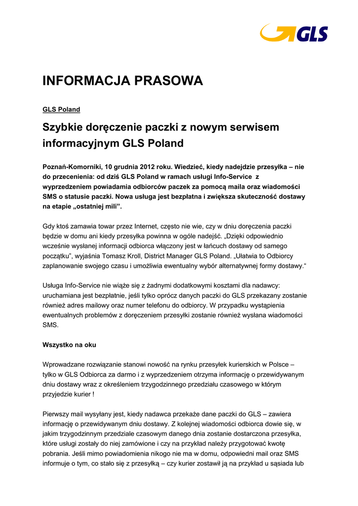 INFORMACJA PRASOWA GLS Poland Szybkie doręczenie paczki z nowym serwisem informacyjnym GLS Poland Poznań-Komorniki, 10 grudnia 2012 roku. Wiedzieć, kiedy nadejdzie przesyłka – nie do przecenienia: od dziś GLS Poland w ramach usługi Info-Service z wyprzedzeniem powiadamia odbiorców paczek za pomocą maila oraz wiadomości SMS o statusie paczki. Nowa usługa jest bezpłatna i zwiększa skuteczność dostawy na etapie „ostatniej mili”. Gdy ktoś zamawia towar przez Internet, często nie wie, czy w dniu doręczenia paczki będzie w domu ani kiedy przesyłka powinna w ogóle nadejść. „Dzięki odpowiednio wcześnie wysłanej informacji odbiorca włączony jest w łańcuch dostawy od samego początku”, wyjaśnia Tomasz Kroll, District Manager GLS Poland. „Ułatwia to Odbiorcy zaplanowanie swojego czasu i umożliwia ewentualny wybór alternatywnej formy dostawy.“ Usługa Info-Service nie wiąże się z żadnymi dodatkowymi kosztami dla nadawcy: uruchamiana jest bezpłatnie, jeśli tylko oprócz danych paczki do GLS przekazany zostanie również adres mailowy oraz numer telefonu do odbiorcy. W przypadku wystąpienia ewentualnych problemów z doręczeniem przesyłki zostanie również wysłana wiadomości SMS. Wszystko na oku Wprowadzane rozwiązanie stanowi nowość na rynku przesyłek kurierskich w Polsce – tylko w GLS Odbiorca za darmo i z wyprzedzeniem otrzyma informację o przewidywanym dniu dostawy wraz z określeniem trzygodzinnego przedziału czasowego w którym przyjedzie kurier ! Pierwszy mail wysyłany jest, kiedy nadawca przekaże dane paczki do GLS – zawiera informację o przewidywanym dniu dostawy. Z kolejnej wiadomości odbiorca dowie się, w jakim trzygodzinnym przedziale czasowym danego dnia zostanie dostarczona przesyłka, które usługi zostały do niej zamówione i czy na przykład należy przygotować kwotę pobrania. Jeśli mimo powiadomienia nikogo nie ma w domu, odpowiedni mail oraz SMS informuje o tym, co stało się z przesyłką – czy kurier zostawił ją na przykład u sąsiada lub w najbliższym punkcie ParcelShop. W przypadku paczek wysyłanych poza granice kraju status przesyłki podawany będzie dodatkowo w języku niemieckim, angielskim lub francuskim. „Ludzie stają się coraz bardziej mobilni, jednak wciąż chcą otrzymywać swoje paczki szybko i bezpiecznie”, podsumowuje Tomasz Kroll. „Wprowadzając usługę Info-Service znaleźliśmy rozwiązanie, pozwalające zwiększyć odsetek paczek doręczonych bezpośrednio do odbiorcy. Proszę wysłać kopię egzemplarza do biura prasowego. STROOMER PR | Concept GmbH, Rellinger Str. 64 a, 20257 Hamburg, Niemcy Telefon: + 49 (0) 40/85 31 33 0, Fax: + 49 (0) 40/85 31 33 22, E-mail: [email protected]