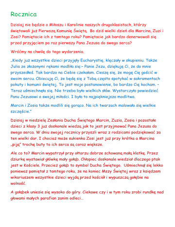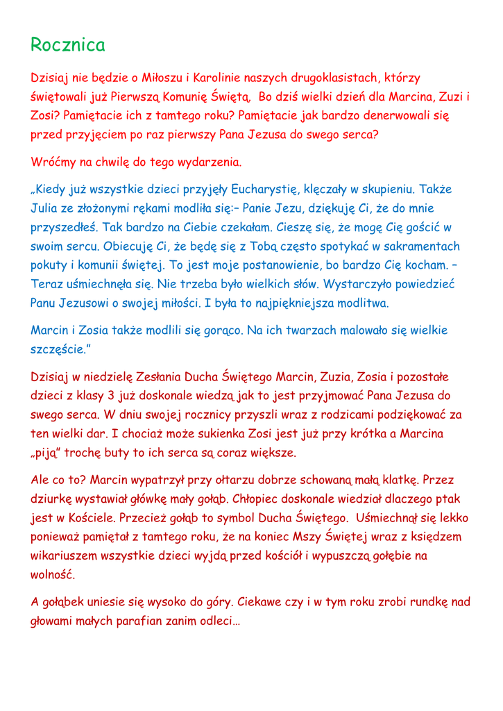 Rocznica Dzisiaj nie będzie o Miłoszu i Karolinie naszych drugoklasistach, którzy świętowali już Pierwszą Komunię Świętą. Bo dziś wielki dzień dla Marcina, Zuzi i Zosi? Pamiętacie ich z tamtego roku? Pamiętacie jak bardzo denerwowali się przed przyjęciem po raz pierwszy Pana Jezusa do swego serca? Wróćmy na chwilę do tego wydarzenia. „Kiedy już wszystkie dzieci przyjęły Eucharystię, klęczały w skupieniu. Także Julia ze złożonymi rękami modliła się:– Panie Jezu, dziękuję Ci, że do mnie przyszedłeś. Tak bardzo na Ciebie czekałam. Cieszę się, że mogę Cię gościć w swoim sercu. Obiecuję Ci, że będę się z Tobą często spotykać w sakramentach pokuty i komunii świętej. To jest moje postanowienie, bo bardzo Cię kocham. – Teraz uśmiechnęła się. Nie trzeba było wielkich słów. Wystarczyło powiedzieć Panu Jezusowi o swojej miłości. I była to najpiękniejsza modlitwa. Marcin i Zosia także modlili się gorąco. Na ich twarzach malowało się wielkie szczęście.” Dzisiaj w niedzielę Zesłania Ducha Świętego Marcin, Zuzia, Zosia i pozostałe dzieci z klasy 3 już doskonale wiedzą jak to jest przyjmować Pana Jezusa do swego serca. W dniu swojej rocznicy przyszli wraz z rodzicami podziękować za ten wielki dar. I chociaż może sukienka Zosi jest już przy krótka a Marcina „piją” trochę buty to ich serca są coraz większe. Ale co to? Marcin wypatrzył przy ołtarzu dobrze schowaną małą klatkę. Przez dziurkę wystawiał główkę mały gołąb. Chłopiec doskonale wiedział dlaczego ptak jest w Kościele. Przecież gołąb to symbol Ducha Świętego. Uśmiechnął się lekko ponieważ pamiętał z tamtego roku, że na koniec Mszy Świętej wraz z księdzem wikariuszem wszystkie dzieci wyjdą przed kościół i wypuszczą gołębie na wolność. A gołąbek uniesie się wysoko do góry. Ciekawe czy i w tym roku zrobi rundkę nad głowami małych parafian zanim odleci…