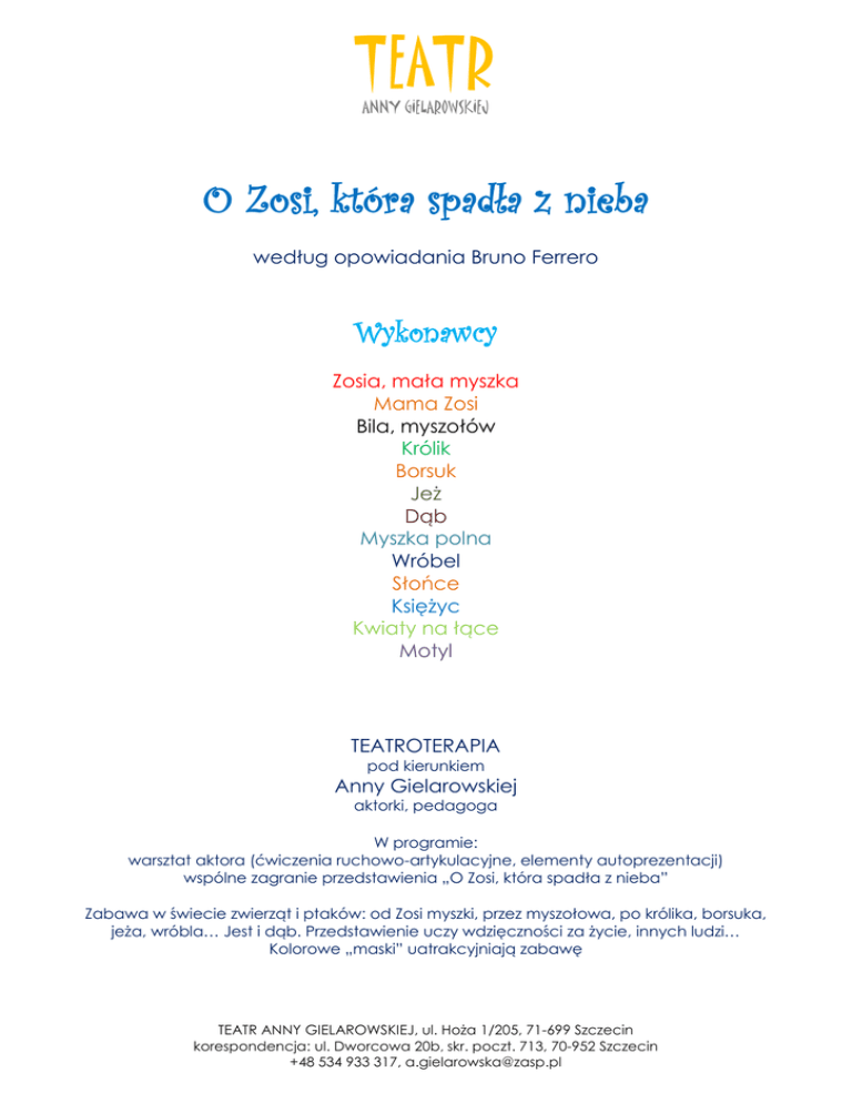 TEATR ANNY GIELAROWSKIEJ O Zosi, która spadła z nieba według opowiadania Bruno Ferrero Wykonawcy Zosia, mała myszka Mama Zosi Bila, myszołów Królik Borsuk Jeż Dąb Myszka polna Wróbel Słońce Księżyc Kwiaty na łące Motyl TEATROTERAPIA pod kierunkiem Anny Gielarowskiej aktorki, pedagoga W programie: warsztat aktora (ćwiczenia ruchowo-artykulacyjne, elementy autoprezentacji) wspólne zagranie przedstawienia „O Zosi, która spadła z nieba” Zabawa w świecie zwierząt i ptaków: od Zosi myszki, przez myszołowa, po królika, borsuka, jeża, wróbla… Jest i dąb. Przedstawienie uczy wdzięczności za życie, innych ludzi… Kolorowe „maski” uatrakcyjniają zabawę TEATR ANNY GIELAROWSKIEJ, ul. Hoża 1/205, 71-699 Szczecin korespondencja: ul. Dworcowa 20b, skr. poczt. 713, 70-952 Szczecin +48 534 933 317, [email protected]