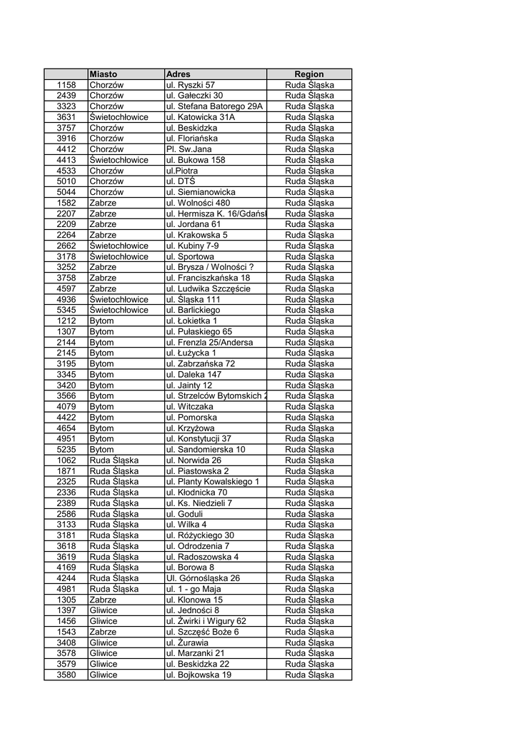 1158 2439 3323 3631 3757 3916 4412 4413 4533 5010 5044 1582 2207 2209 2264 2662 3178 3252 3758 4597 4936 5345 1212 1307 2144 2145 3195 3345 3420 3566 4079 4422 4654 4951 5235 1062 1871 2325 2336 2389 2586 3133 3181 3618 3619 4169 4244 4981 1305 1397 1456 1543 3408 3578 3579 3580 Miasto Chorzów Chorzów Chorzów Świetochłowice Chorzów Chorzów Chorzów Świetochłowice Chorzów Chorzów Chorzów Zabrze Zabrze Zabrze Zabrze Świetochłowice Świetochłowice Zabrze Zabrze Zabrze Świetochłowice Świetochłowice Bytom Bytom Bytom Bytom Bytom Bytom Bytom Bytom Bytom Bytom Bytom Bytom Bytom Ruda Śląska Ruda Śląska Ruda Śląska Ruda Śląska Ruda Śląska Ruda Śląska Ruda Śląska Ruda Śląska Ruda Śląska Ruda Śląska Ruda Śląska Ruda Śląska Ruda Śląska Zabrze Gliwice Gliwice Zabrze Gliwice Gliwice Gliwice Gliwice Adres Region ul. Ryszki 57 Ruda Śląska ul. Gałeczki 30 Ruda Śląska ul. Stefana Batorego 29A Ruda Śląska ul. Katowicka 31A Ruda Śląska ul. Beskidzka Ruda Śląska ul. Floriańska Ruda Śląska Pl. Sw.Jana Ruda Śląska ul. Bukowa 158 Ruda Śląska ul.Piotra Ruda Śląska ul. DTŚ Ruda Śląska ul. Siemianowicka Ruda Śląska ul. Wolności 480 Ruda Śląska ul. Hermisza K. 16/Gdańska Ruda Śląska ul. Jordana 61 Ruda Śląska ul. Krakowska 5 Ruda Śląska ul. Kubiny 7-9 Ruda Śląska ul. Sportowa Ruda Śląska ul. Brysza / Wolności ? Ruda Śląska ul. Franciszkańska 18 Ruda Śląska ul. Ludwika Szczęście Ruda Śląska ul. Śląska 111 Ruda Śląska ul. Barlickiego Ruda Śląska ul. Łokietka 1 Ruda Śląska ul. Pułaskiego 65 Ruda Śląska ul. Frenzla 25/Andersa Ruda Śląska ul. Łużycka 1 Ruda Śląska ul. Zabrzańska 72 Ruda Śląska ul. Daleka 147 Ruda Śląska ul. Jainty 12 Ruda Śląska ul. Strzelców Bytomskich 250DRuda Śląska ul. Witczaka Ruda Śląska ul. Pomorska Ruda Śląska ul. Krzyżowa Ruda Śląska ul. Konstytucji 37 Ruda Śląska ul. Sandomierska 10 Ruda Śląska ul. Norwida 26 Ruda Śląska ul. Piastowska 2 Ruda Śląska ul. Planty Kowalskiego 1 Ruda Śląska ul. Kłodnicka 70 Ruda Śląska ul. Ks. Niedzieli 7 Ruda Śląska ul. Goduli Ruda Śląska ul. Wilka 4 Ruda Śląska ul. Różyckiego 30 Ruda Śląska ul. Odrodzenia 7 Ruda Śląska ul. Radoszowska 4 Ruda Śląska ul. Borowa 8 Ruda Śląska Ul. Górnośląska 26 Ruda Śląska ul. 1 - go Maja Ruda Śląska ul. Klonowa 15 Ruda Śląska ul. Jedności 8 Ruda Śląska ul. Żwirki i Wigury 62 Ruda Śląska ul. Szczęść Boże 6 Ruda Śląska ul. Żurawia Ruda Śląska ul. Marzanki 21 Ruda Śląska ul. Beskidzka 22 Ruda Śląska ul. Bojkowska 19 Ruda Śląska 4588 4903 5025 5588 1028 1254 1276 1419 2693 3379 3577 3581 3582 3584 4296 4534 1245 1321 1971 2400 3134 3389 3613 3614 3615 3623 4174 4295 4658 1152 1549 1834 2191 2747 2784 2865 3105 3352 3397 3591 4475 1322 1484 1624 1933 2114 2437 2624 3632 4656 5198 5430 5914 1420 1534 2048 2993 3084 3164 Zabrze Zabrze Zabrze Zabrze Gliwice Gliwice Gliwice Gliwice Gliwice Gliwice Gliwice Gliwice Gliwice Gliwice Gliwice Gliwice Rydułtowy Racibórz Pszów Racibórz Racibórz Pszów Racibórz Racibórz Racibórz Rydułtowy Racibórz Racibórz Rydułtowy Głubczyce Kędzierzyn-Koźle Kędzierzyn-Koźle Głubczyce Kietrz Kędzierzyn-Koźle Kędzierzyn-Koźle Branice Kuźnia Raciborska Baborów Kędzierzyn-Koźle Kędzierzyn-Koźle Tarnowskie Góry Piekary Śląskie Piekary Śląskie Tarnowskie Góry Tarnowskie Góry Tarnowskie Góry Piekary Śląskie Tarnowskie Góry Zbrosławice Miasteczko Śląskie Tarnowskie Góry Tarnowskie Góry Strzelce Opolskie Pyskowice Zawadzkie Strzelce Opolskie Toszek Dobrodzień ul. Wolności 88 ul. Legnicka ul. Paderewskiego 21a ul. Wolności 273 ul. Gomułki 1 ul. Kozielska 2 ul. Paderewskiego 56 ul. Chorzowska 44B ul. Kolberga 41 ul. Daszyńskiego 135 ul. Dworcowa 44 ul. Dubois 16 ul. Lipowa 7 ul. Czwartaków 13 ul. Toszecka 129 ul. Przyszowska ul. Obywatelska 26 ul. Opawska 69/1 ul. Traugutta 26 ul.Siwonia 38 ul.Ogrodowa 46 ul.Andersa 19 ul. Reymonta 16 ul. Słowackiego 58 ul. Bosaka 61 ul. Raciborska 351 ul. Opawska 18 ul. Opawska 124 Bema 5 Pl. 1-go Maja 1 ul. Piastowska ul. Jana Pawła II 50A ul.Raciborska 1 ul. Raciborska 1 ul.Kozielska 12 ul. Tuwima 3A ul. Żymierskiego 57a ul.Kozielska 2 ul. Wiejska 2a ul. Łokietka 4 ul. Armii Krajowej 38 ul. Łotewska 2 Ul. Kamienna 2 ul. Bytomska 69 Ul. Zagórska 91 ul. Bytomska 30 Ul. Legionów 3 Ul. Skłodowskiej-Curie 65A Ul. Ułańska 2 Ul. Wolności ul. Woźnicka 20A ul. Janasa 33 ul.Finska Pl. Targowy 1 ul. Zaolszany 5 ul. Opolska 61 ul. Gogolińska 31 ul.Gliwicka 10a ul.Oleska 23 Ruda Śląska Ruda Śląska Ruda Śląska Ruda Śląska Ruda Śląska Ruda Śląska Ruda Śląska Ruda Śląska Ruda Śląska Ruda Śląska Ruda Śląska Ruda Śląska Ruda Śląska Ruda Śląska Ruda Śląska Ruda Śląska Ruda Śląska Ruda Śląska Ruda Śląska Ruda Śląska Ruda Śląska Ruda Śląska Ruda Śląska Ruda Śląska Ruda Śląska Ruda Śląska Ruda Śląska Ruda Śląska Ruda Śląska Ruda Śląska Ruda Śląska Ruda Śląska Ruda Śląska Ruda Śląska Ruda Śląska Ruda Śląska Ruda Śląska Ruda Śląska Ruda Śląska Ruda Śląska Ruda Śląska Ruda Śląska Ruda Śląska Ruda Śląska Ruda Śląska Ruda Śląska Ruda Śląska Ruda Śląska Ruda Śląska Ruda Śląska Ruda Śląska Ruda Śląska Ruda Śląska Ruda Śląska Ruda Śląska Ruda Śląska Ruda Śląska Ruda Śląska Ruda Śląska 3359 3388 3629 3637 3723 2660 2731 3565 3567 3596 4176 4240 4459 4558 4688 5193 5434 1731 1889 2299 2599 2663 3239 3598 3780 4310 4626 4860 5192 1064 1255 1542 1545 2334 2859 3571 3572 3594 3597 3969 4181 1900 2190 2797 3085 3616 3634 3871 3990 4233 5224 5545 1246 1436 1973 1974 2063 3038 3070 Tworóg ul. Zamkowa 2A Olesno ul.Kościuszki 25 Strzelce Opolskie ul. Stawowa 2 Zdzieszowice ul. Myśliwca 16 Olesno ul. Dobrodzieńska 7 Kalety Ul. 1 Maja ? Lubliniec ul. Powstańców Śląskich 54 Blachownia Ul. Miodowa 2 Radzionków Ul. Św. Wojciecha 1 Lubliniec ul. Stalmacha 9 Świ