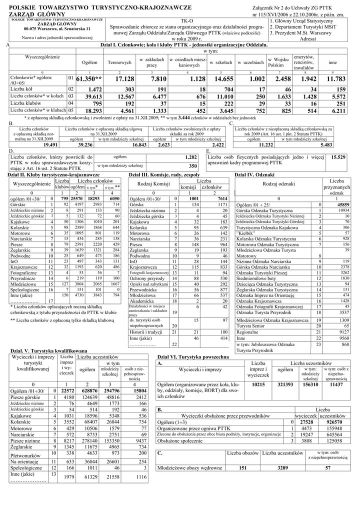 POLSKIE TOWARZYSTWO TURYSTYCZNO-KRAJOZNAWCZE ZARZĄD GŁÓWNY Załącznik Nr 2 do Uchwały ZG PTTK nr 115/XVI/2006 z 22.10.2006r. z późn. zm. POLSKIE TOWARZYSTWO TURYSTYCZNO-KRAJOZNAWCZE 1. Główny Urząd Statystyczny TK-O ZARZĄD GŁÓWNY 2. Departament Turystyki MSiT Sprawozdanie zbiorcze ze stanu organizacyjnego oraz działalności progra00-075 Warszawa, ul. Senatorska 11 3. Prezydent M.St. Warszawy mowej Zarządu Oddziału/Zarządu Głównego PTTK (właściwe podkreślić) Nazwa i adres jednostki sprawozdawczej w roku 2009 r. Adresat A Dział I. Członkowie; koła i kluby PTTK - jednostki organizacyjne Oddziału. w tym: Wyszczególnienie Ogółem Terenowych w zakładach pracy 1 2 3 0 w osiedlach mieszw szkołach kaniowych 4 w uczelniach 5 emerytów, rencistów, inwalidów w Wojsku Polskim 6 7 inne 8 9 01 61.350** 17.128 7.810 1.128 14.655 1.002 2.458 1.942 11.783 02 Liczba członków* w kołach 03 Liczba klubów 04 Liczba członków* w klubach 05 1.472 39.613 795 18.293 303 12.567 192 4.561 191 6.477 37 1.333 18 676 15 452 704 11.010 222 3.645 17 250 29 752 46 1.633 33 825 34 1.428 16 514 159 5.572 251 6.211 Członkowie* ogółem: /03+05/ Liczba kół * z opłaconą składką członkowską i zwolnieni z opłaty na 31.XII.2009; ** w tym 3.444 członków w oddziałach bez jednostek B. C. Liczba członków z opłaconą składką normalną na 31.XII.2009 Liczba członków z opłaconą składką ulgową na 31.XII.2009 ogółem w tym młodzieży szkolnej Liczba członków zwolnionych z opłaty składki za rok 2009 ogółem w tym młodzieży szkolnej Liczba członków z nieopłaconą składką członkowską za rok 2009 (Art. 16 ust. 1 pkt. 2 Statutu PTTK) ogółem w tym młodzieży szkolnej 19.491 39.236 16.843 2.623 2.422 11.232 5.483 D. E. ogółem Liczba członków, którzy powrócili do Liczba osób fizycznych posiadających jedno i więcej 15.529 1.202 PTTK w roku sprawozdawczym korzyuprawnień kadry programowej PTTK w tym młodzieży szkolnej 350 stając z Art. 16 ust. 2 Statutu PTTK Dział II. Kluby turystyczno-krajoznawcze Dział III. Komisje, rady, zespoły Dział IV. Odznaki Liczba Liczba członków Liczba Liczba Wyszczególnienie Rodzaj Komisji Rodzaj odznaki klubów ogółem w tym* w tym ** komisji członków przyznanych 0 ogółem /01÷30/ Górskie Jeździeckie nizinne Jeździeckie górskie 0 1 2 3 1 2 795 25570 92 8 5 50 98 35 15 79 39 25 23 32 4 6 127 7 150 4197 291 132 1306 2589 1095 434 2591 1639 649 497 1193 53 219 3804 151 4730 3 18293 2983 133 72 1010 1868 801 285 2220 1321 473 343 620 36 119 2065 101 3843 4 6050 714 90 60 201 644 119 138 429 284 186 131 486 7 100 1667 0 794 Kajakowe 4 Kolarskie 5 Motorowe 6 Narciarskie 7 Piesze 8 Żeglarskie 9 Podwodne 10 InO 11 Krajoznawcze 12 Fotograficzne 13 Przyrodnicze 14 Młodzieżowe 15 Speleologiczne 16 Inne (jakie) ……………… 17 * Liczba członków opłacających roczną składką członkowską z tytułu przynależności do PTTK w klubie ** Liczba członków z opłaconą tylko składką klubową 0 Ogółem /01÷30/ Górska Jeździecka nizinna Jeździecka górska Kajakowa Kolarska Motorowa Narciarska Piesza Żeglarska Podwodna InO Krajoznawcza cieczek 0 Ogółem /01÷30/ Piesze górskie Jeździeckie nizinne Jeździeckie górskie Kajakowe Kolarskie Motorowe Narciarskie Piesze nizinne Żeglarskie 0 1 2 3 4 5 6 7 8 9 10 Płetwonurków Na orientację 11 Speleologiczne 12 Inne (jakie) 13 ………………… szkolnej 3 4 5 6 7 8 9 10 11 12 Fotografii krajoznawczej 13 Ochrony przyrody 14 Opieki nad zabytkami 15 Przewodnicka 16 Młodzieżowa 17 Akademicka 18 Działalności w miejscu zamieszkania i zakładzie pracy ds. turystyki osób niepełnosprawnych Historii i tradycji Inne (jakie) …………….. Dział. V. Turystyka kwalifikowana Wycieczki i imprezy Liczba Liczba uczestników imprez turystyki w tym i wykwalifikowanej ogółem młodzieży 0 1 2 osób z niepełnosprawnością 1 22572 4180 76 54 1031 3552 429 572 8217 1345 338 2 628876 124639 4649 514 18596 68407 10506 8733 278140 11675 4633 3 294796 48816 1773 192 5348 26844 1579 2751 153350 4965 973 4 15804 2412 166 46 536 754 77 69 9437 734 200 633 166 36044 1011 26601 46 254 3 1979 61329 21558 1116 1 1001 134 4 4 32 95 26 36 148 19 9 28 115 11 88 40 56 66 2 6 2 7614 1171 20 45 183 639 142 231 964 193 46 144 833 94 530 292 877 537 20 42 19 20 21 15 97 21 46 100 414 22 0 Ogółem /01 ÷ 25/ Górska Odznaka Turystyczna Jeździecka Odznaka Turystyki Nizinnej Jeździecka Odznaka Turystyki Górskiej Turystyczna Odznaka Kajakowa ”Kiełbik” Kolarska Odznaka Turystyczna Motorowa Odznaka Turystyczna Młodzieżowa Odznaka Turysta Motorowy Nizinna Odznaka Narciarska Górska Odznaka Narciarska Odznaka Turystyki Pieszej Siedmiomilowe buty Dziecięca Odznaka Turystyczna Żeglarska Odznaka Turystyczna Odznaka Imprez na Orientację Odznaka Krajoznawcza Odznaka Fotografii Krajoznawczej Odznaka Turysta Przyrodnik Młodzieżowa Odznaka Krajoznawcza Turysta Senior Regionalne Inne w tym: Jubileuszowa Odznaka Turysta Przyrodnik Dział VI. Turystyka powszechna A. Wycieczki i imprezy Liczba imprez i wycieczek Ogółem (organizowane przez koła, kluby, oddziały, komisje, BORT) dla swoich członków 10215 321393 Wycieczki obsłużone przez przewodników Ogółem (1÷3) Organizowane przez ogniwa PTTK Zlecone do obsłużenia przez obce biura podróży, instytucje, organizacje Obsłużone społecznie Młodzieżowe obozy wędrowne 8 9 10 11 12 13 14 15 16 17 18 3537 19 20 21 22 23 1309 65 9127 9560 868 119 2378 3262 1830 94 131 474 1428 45 młodzieży szkolnej niepełnosprawnością 156310 11437 Liczba wycieczek uczestników 0 27528 926570 1 4473 155948 2 19247 645564 3 3808 125058 Liczba obozów Liczba uczestników 151 10934 10 70 306 57 928 156 39 Liczba uczestników w tym: w tym: osób z ogółem B. C. 0 1 2 3 4 5 6 7 odznak 1 45859 3289 w tym: osób z niepełnosprawnością 57 Dział VII. Stan kadry programowej i jej szkolenie B. Kadra programowa; szkolenie Wyszczególnienie Liczba przew