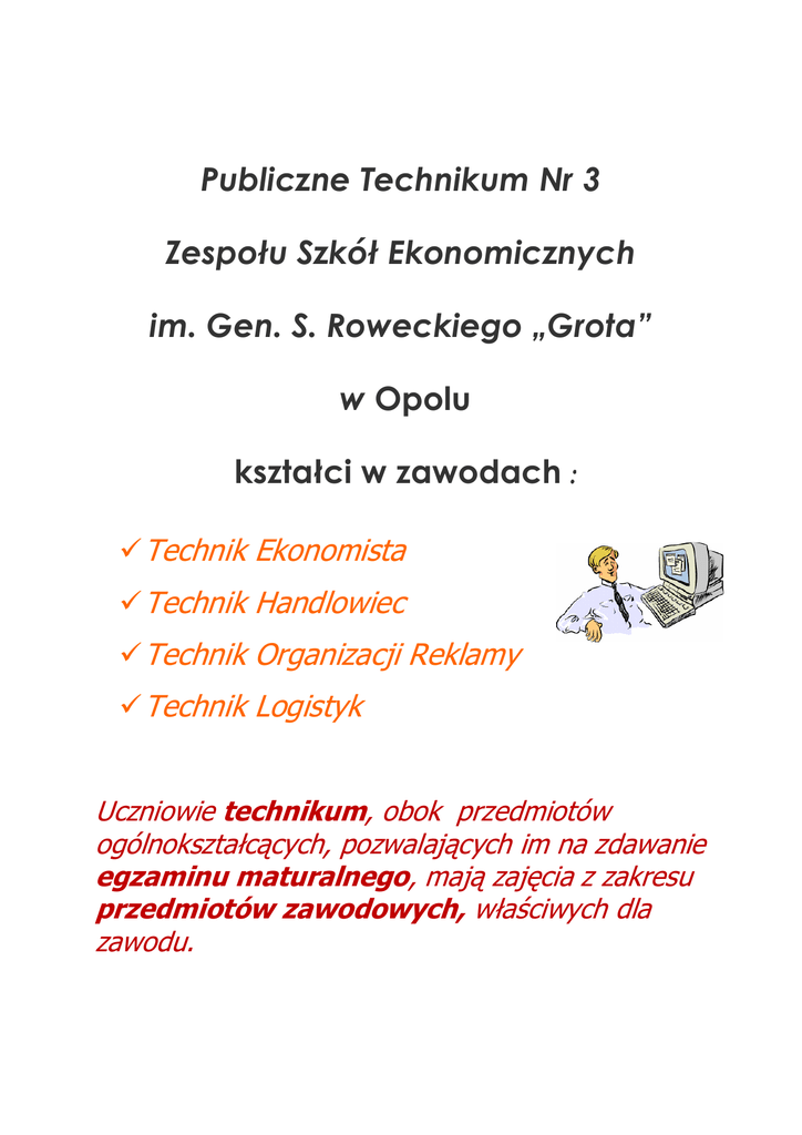 Publiczne Technikum Nr 3 Zespołu Szkół Ekonomicznych im. Gen. S. Roweckiego „Grota” w Opolu kształci w zawodach : Technik Ekonomista Technik Handlowiec Technik Organizacji Reklamy Technik Logistyk Uczniowie technikum, obok przedmiotów ogólnokształcących, pozwalających im na zdawanie egzaminu maturalnego, mają zajęcia z zakresu przedmiotów zawodowych, właściwych dla zawodu. Odbywają także praktyki zawodowe w klasie II i III. Absolwent technikum może przystąpić do zewnętrznego egzaminu zawodowego, na mocy którego uzyska tytuł technika. Na wniosek zdającego do dyplomu potwierdzającego kwalifikacje zawodowe dołącza się Europass - Suplement do Dyplomu Potwierdzającego Kwalifikacje Zawodowe. Dokument ten: określa zakres kompetencji dyplom zawodowy osoby posiadającej ułatwia zrozumienie znaczenia dyplomu, opisuje umiejętności i uprawnienia posiadacza dyplomu, jest ściśle powiązany z zawodem (w danym kraju posiadacze określonego dyplomu otrzymają taki sam suplement), posiada taką samą strukturę we wszystkich krajach UE. Dyplomy i suplementy do dyplomów wydają okręgowe komisje egzaminacyjne. Uczniowie uczestniczą w ogólnopolskim programie METRO EDUKACJA umożliwiającym odbywanie praktyk zawodowych w największych jednostkach handlowych ( REAL, MAKRO ). ZAWODY NA POZIOMIE TECHNIKUM TECHNIK EKONOMISTA Okres nauki: 4 lat Podbudowa: gimnazjum Nabór planowany jest do trzech klas w tym: 1 klasa z rozszerzeniem przedmiotu – matematyka 1 klasa z innowacją „ekoenergia w chemii” 1 klasa „menedżer projektów” z rozszerzoną wiedzą o społeczeństwie Absolwent może otrzymać tytuł technika ekonomisty po zdaniu egzaminu potwierdzającego kwalifikacje w zawodzie. Kształcenie w zawodzie technika ekonomisty zapewnia osiągnięcie kwalifikacji w zakresie finansów, rachunkowości, organizacji procesów związanych z produkcją i sprzedażą wyrobów, towarów i usług. Po drugiej klasie wybór specjalizacji. Zdobyte kwalifikacje pozwolą na zatrudnienie na średnich szczeblach zarządzania w przedsiębiorstwach produkcyjnych, handlowych, usługowych, w działach marketingu, zaopatrzenia, zatrudnienia, księgowości, zbytu i planowania produkcji oraz w instytucjach finansowych, organach administracji rządowej, organach samorządu terytorialnego. Technik ekonomista może być zatrudniony w instytucjach prowadzących badania rynku. Absolwenci przygotowani są również uruchomienia działalności własnej. do zorganizowania i Technik ekonomista to także: Referent finansowy Planista Rewident Kontroler rozliczeń finansowych Inspektor finansowo – księgowy Księgowy Uzupełnieniem dyplomu technika ekonomisty jest suplement w języku polskim i języku obcym zawierający opis kompetencji zawodowych oraz zawody pokrewne wg ustaleń UE, takie jak urzędnik podatkowy, urzędnik ubezpieczeń społecznych, sekretarka, agent celny, spedytor, pośrednik pracy. W grupie przedmiotów obowiązkowych Ekonomicznym wyodrębnić można 2 bloki: w Technikum 1. przedmioty ogólnokształcące: język polski, język obcy (j. angielski, j. niemiecki), matematyka, fizyka, chemia, biologia, historia, wiedza o społeczeństwie, geografia, elementy informatyki, podstawy przedsiębiorczości, przysposobienie obronne, w-f. 2. przedmioty zawodowe: podstawy ekonomii, prawo, ekonomika, rachunkowość, pracownia ekonomiczna, język obcy zawodowy, zajęcia w ramach specjalizacji zawodowej. Przygotowanie praktyczne do zawodu otrzymują uczniowie w czasie zajęć w szkolnych pracowniach komputerowych, oraz w czasie praktyk zawodowych w jednostkach prowadzących działalność gospodarczą. Uczniowie biorą udział w ogólnopolskim programie METRO EDUKACJA. Model absolwenta Technik Ekonomista to osoba, którą charakteryzuje dokładność, systematyczność, odpowiedzialność za pracę, kreatywność i przedsiębiorczość, umiejętność pracy w zespole oraz sprawne posługiwanie się technologiami informatycznymi. Absolwent szkoły przygotowany jest do : planowania i organizowania dowolnej działalności gospodarczej, ewidencjonowania zdarzeń gospodarczych (księgowość pełna i uproszczona ), sporządzania deklaracji podatkowych, zestawień i analiz ekonomicznych i statystycznych, sporządzania dokumentacji handlowej i księgowej, obsługi programów komputerowych ekonomiczno - finansowych i biurowych, wykonywania prac biurowych, działań marketingowych 1 KLASA WIELOZAWODOWA TECHNIK HANDLOWIEC / 15 miejsc TECHNIK ORGANIZACJI REKLAMY / 15 miejsc Okres nauki: 4 lata Podbudowa: gimnazjum Absolwent może otrzymać tytuł technika handlowca lub technika organizacji reklamy po złożeniu egzaminu potwierdzającego kwalifikacje w zawodzie TECHNIK HANDLOWIEC Kształcenie w zawodzie technika handlowca gwarantuje kwalifikacje wymagane na średnim szczeblu zarządzania w przedsiębiorstwach handlowych oraz pozwala na zorganizowanie, uruchomienie i prowadzenie własnej firmy handlowej. Technik handlowiec może podjąć pracę w komórkach handlowo – marketingowych oraz w instytucjach kontroli handlu. Uzupełnieniem dyplomu technika handlowca jest suplement w języku polskim i języku obcym zawierający opis kompetencji zawodowych oraz zawody pokrewne wg ustaleń UE: organizator obsługi sprzedaży internetowej, przedstawiciel handlowy, telemarketer. Technik handlowiec to także: asystent handlowy kupiec sales assistant W grupie przedmiotów obowiązkowych wyodrębnić można 2 bloki: 1. przedmioty ogólnokształcące: język polski, języki obce (j. angielski, j. niemiecki), historia, elementy informatyki, matematyka, fizyka, chemia, biologia, wiedza o społeczeństwie, geografia, przysposobienie obronne, podstawy przedsiębiorczości, po, w-f. 2. przedmioty zawodowe: zasady rachunkowości, rachunkowość handlowa, ekonomika handlu, towaroznawstwo, marketing, technika biurowa, podstawy ekonomii, statystyka, elementy prawa, język obcy zawodowy. Przygotowanie praktyczne do zawodu otrzy