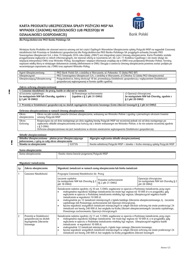KARTA PRODUKTU UBEZPIECZENIA SPŁATY POŻYCZKI MSP NA WYPADEK CZASOWEJ NIEZDOLNOŚCI LUB PRZESTOJU W DZIAŁALNOŚCI GOSPODARCZEJ dla Pożyczkobiorców PKO Banku Polskiego SA Niniejsza Karta Produktu nie stanowi wzorca umowy ani też części Ogólnych Warunków Ubezpieczenia spłaty Pożyczki MSP na wypadek Czasowej niezdolności lub Przestoju w Działalności gospodarczej dla Pożyczkobiorców PKO Banku Polskiego SA przyjętych uchwałą Zarządu PKO Towarzystwo Ubezpieczeń S.A. z dnia 15 listopada 2016 roku (dalej „OWU”) ani integralnej części Umowy ubezpieczenia. Karta Produktu została przygotowana wyłącznie w celach informacyjnych, nie stanowi oferty w rozumieniu art. 66 i art. 71 Kodeksu Cywilnego i nie może służyć do wiążącej interpretacji OWU oraz Wniosko-Polisy. Szczegółowe i wiążące informacje znajdują się w OWU oraz podpisanej Wniosko-Polisie. Terminy napisane wielką literą w niniejszym dokumencie zostały zdefiniowane w OWU. Decyzja o zawarciu Umowy ubezpieczenia powinna zostać podjęta po wcześniejszym zapoznaniu się z OWU oraz zapisami Wniosko-Polisy. Agent Ubezpieczeniowy: Ubezpieczyciel: Ubezpieczający/Ubezpieczony: PKO Bank Polski SA z siedzibą w Warszawie, ul. Puławska 15 (dalej PKO BP) PKO Towarzystwo Ubezpieczeń S.A. z siedzibą w Warszawie, ul Chłodna 52 (dalej PKO Ubezpieczenia) Pożyczkobiorca, który ukończył 18 lat, prowadzący Działalność gospodarczą z wyłączeniem Działalności gospodarczej wykonywanej w formie spółki cywilnej Zakres ochrony ubezpieczeniowej: 1. Czasowa niezdolność do pracy, każde ze zdarzeń w ramach: a) Leczenia szpitalnego b) Poważnego zachorowania (w następstwie NW lub Choroby, zgodnie z (zgodnie z § 2 pkt 31 OWU) § 2 pkt 18 OWU) c) Operacji chirurgicznej (w następstwie NW lub Choroby, zgodnie z § 2 pkt 28 OWU) 2. Przestój w Działalności gospodarczej na skutek wystąpienia Zdarzenia losowego (Lista Zdarzeń losowych § 2 pkt 64 OWU) Ochrona ubezpieczeniowa w ramach Umowy ubezpieczenia: Okres Okres na jaki została zawarta Umowa ubezpieczenia, wskazany we Wniosko-Polisie i zgodny z pierwotnym okresem trwania ubezpieczenia umowy Pożyczki MSP Okres Rozpoczyna się od dnia następnego po dniu wypłaty kwoty Pożyczki MSP nie wcześniej jednak niż od dnia następnego po Ochrony zapłaceniu składki ubezpieczeniowej oraz kończy się z dniem wskazanym we Wniosko-Polisie, o ile nie ustanie wcześniej zgodnie z § 5 OWU. Ochrona ubezpieczeniowa nie jest świadczona w okresie zawieszenia wykonywania Działalności gospodarczej. Składki ubezpieczeniowe: Składka Ubezpieczeniowa - płatna przez Ubezpieczającego jednorazowo, z góry za cały okres ubezpieczenia Stawka za ubezpieczenie 0,075% Suma ubezpieczenia: Suma ubezpieczenia Algorytm wyliczenia składki ubezpieczeniowej Kwota udzielonej Pożyczki MSP × stawka × liczba miesięcy spłaty Pożyczki MSP Kwota równa kwocie przyznanej Pożyczki MSP Wysokość świadczenia: Lp. Zakres ubezpieczenia Wysokość świadczeń w ramach sumy ubezpieczenia lub limitu świadczeń 1 Czasowa Niezdolność Przyczyna Czasowej Niezdolności do Pracy Leczenie szpitalne Poważne zachorowanie (w następstwie NW lub Choroby § 2 (§ 2 pkt 31 OWU) pkt 18 OWU) Operacja chirurgiczna (w następstwie NW lub Choroby § 2 pkt 28 OWU) Świadczenie należne zgodnie z § 10 ust. 5 OWU, wypłacane w oparciu o Podstawę świadczenia, przy czym: maksymalna wysokość każdego świadczenia nie może być wyższa niż 10 000 zł a w przypadku, gdy wyliczenie w oparciu o Podstawę świadczenia miałaby być wyższe, Ubezpieczyciel wypłaca każde świadczenie w wysokości 10 000 zł, maksymalnie po 12 świadczeń miesięcznych z tytułu każdego Zdarzenia ubezpieczeniowego, tj. : Leczenia szpitalnego lub Poważnego zachorowania lub Operacji chirurgicznej, łączna wysokość wszystkich świadczeń miesięcznych w całym Okresie ochrony nie może przekroczyć 24 świadczeń ani kwoty 240 000 zł, bez względu na liczbę Zdarzeń ubezpieczeniowych: Leczenia szpitalnego, Poważnego zachorowania, Operacji chirurgicznych 2 Przestój w Działalności gospodarczej na skutek wystąpienia Zdarzenia losowego Świadczenie należne zgodnie z § 11 ust. 5 OWU, wypłacane w oparciu o Podstawę świadczenia, przy czym: maksymalna wysokość każdego świadczenia nie może być wyższa niż 10 000 zł, a w przypadku, gdy wyliczenie w oparciu o Podstawę świadczenia miałaby być wyższe, Ubezpieczyciel wypłaca każde świadczenie w wysokości 10 000 zł, maksymalnie 12 świadczeń miesięcznych z tytułu tego samego Zdarzenia losowego, łączna wysokość wszystkich świadczeń miesięcznych w całym Okresie ochrony nie może przekroczyć 24 świadczeń ani kwoty 240 000 zł, bez względu na liczbę przypadków Zdarzeń losowych Strona 1/2 Odstąpienie i Rozwiązanie Umowy ubezpieczenia: Ubezpieczający jako przedsiębiorca może pisemnie odstąpić od Umowy ubezpieczenia w terminie 7 dni od dnia jej zawarcia. Ochrona ustaje ze skutkiem na dzień otrzymania oświadczenia o odstąpieniu przez Ubezpieczyciela. Ubezpieczający może rozwiązać Umowę ubezpieczenia w dowolnym terminie, składając pisemne wypowiedzenie Umowy ubezpieczenia ze skutkiem na dzień doręczenia Ubezpieczycielowi. W razie rozwiązanie Umowy ubezpieczenia, Ubezpieczający ponosi jedynie koszt składki ubezpieczeniowej za wykorzystany Okres ochrony ubezpieczeniowej. Ograniczenia i wyłączenia odpowiedzialności Ubezpieczyciela Przykładowe ograniczenia i wyłączenia odpowiedzialności Ubezpieczyciela to: 1. Z tytułu Czasowej niezdolności w następstwie Operacji chirurgicznej lub Leczenia szpitalnego Ubezpieczyciel nie ponosi odpowiedzialności za leczenie szpitalne związane z rehabilitacją, pobytami dziennymi w szpitalu lub sanatorium, pobytami w sanatorium. 2. Z tytułu Czasowej niezdolności w następstwie Poważnego zachorowania lub Operacji chirurgicznej lub Leczenia szpitalnego Ubezpieczyciel nie ponosi odpo