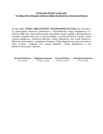 OŚWIADCZENIE ZARZĄDU W SPRAWIE PÓŁROCZNEGO SPRAWOZDANIA FINANSOWEGO Zarząd spółki UNIMA 2000 SYSTEMY TELEINFORMATYCZNE S.A. oświadcza, że sprawozdanie finansowe jednostkowe i skonsolidowane Grupy Kapitałowej za I półrocze 2008 roku i dane porównywalne sporządzone zostały zgodnie z obowiązującymi zasadami rachunkowości oraz że odzwierciedlają w sposób prawdziwy, rzetelny i jasny sytuację majątkową i finansową Emitenta i Grupy Kapitałowej oraz wynik finansowy. Półroczne sprawozdanie z działalności Emitenta i Grupy Kapitałowej zawiera prawdziwy obraz rozwoju i osiągnięć oraz sytuacji Emitenta i Grupy Kapitałowej, w tym podstawowych ryzyk i zagrożeń. Krzysztof Kniszner Magdalena Kniszner Krzysztof Sikora Konrad Kosierkiewicz Prezes Zarządu Wiceprezes Zarządu Wiceprezes Zarządu Członek Zarządu OŚWIADCZENIE ZARZĄDU W SPRAWIE PODMIOTU UPRAWNIONEGO DO BADANIA SPRAWOZDAŃ FINANSOWYCH Zarząd spółki UNIMA 2000 SYSTEMY TELEINFORMATYCZNE S.A. oświadcza, że podmiot uprawniony do badania sprawozdań finansowych BDI Audyt z siedzibą w Krakowie, dokonujący przeglądu sprawozdania finansowego jednostkowego i skonsolidowanego Grupy Kapitałowej za I półrocze 2008 roku został wybrany zgodnie z przepisami prawa oraz spełnił warunki do wydania bezstronnego i niezależnego raportu z przeglądu, zgodnie z właściwymi przepisami prawa krajowego. Krzysztof Kniszner Magdalena Kniszner Krzysztof Sikora Konrad Kosierkiewicz Prezes Zarządu Wiceprezes Zarządu Wiceprezes Zarządu Członek Zarządu Półroczne skonsolidowane sprawozdanie finansowe Grupy UNIMA za okres zakończony 30.06.2008 roku sporządzony w tysiącach złotych polskich Raport półroczny za 2008 rok Półroczne skonsolidowane sprawozdanie finansowe za okres od 1 stycznia do 30 czerwca 2008 1 Półroczne skonsolidowane sprawozdanie finansowe Grupy UNIMA za okres zakończony 30.06.2008 roku sporządzony w tysiącach złotych polskich -SPIS TREŚCII. INFORMACJE OGÓLNE .................................................................................................................................................................4 2.Skład grupy kapitałowej ................................................................................................................................................ 4 3.Schemat graficzny grupy kapitałowej UNIMA2000 ..................................................................................................... 5 4.Podstawowe dane dot. sporządzenia sprawozdania finansowego ................................................................................. 5 5.Korekty z tytułu zastosowania po raz pierwszy MSSF/MSR ........................................................................................ 5 II ZASADY RACHUNKOWOŚCI.......................................................................................................................................................5 1.Zmiany stosowanych zasad rachunkowości. ................................................................................................................. 5 2.Profesjonalny osąd kierownictwa, oszacowania, i założenia ....................................................................................... 6 3.Zasady konsolidacji ....................................................................................................................................................... 6 4.Inwestycja w jednostce stowarzyszonej......................................................................................................................... 7 5.Udział we wspólnym przedsięwzięciu........................................................................................................................... 7 6.Przeliczanie pozycji wyrażonych w walucie ................................................................................................................. 7 7.Wartości niematerialne .................................................................................................................................................. 7 8.Koszty badawczych prac rozwojowych......................................................................................................................... 7 9.Wartość firmy ................................................................................................................................................................ 7 10.Rzeczowe aktywa trwałe ............................................................................................................................................. 8 11.Koszty finansowania zewnętrznego............................................................................................................................. 8 12.Nieruchomości inwestycyjne ....................................................................................................................................... 8 13.Aktywa finansowe ....................................................................................................................................................... 8 14.Aktywa trwałe i grupy aktywów przeznaczone do zbycia......................................................................................... 10 15.Utrata wartości aktywów niefinansowych ................................................................................................................. 10 16.Leasing....................................................................................................................................................................... 10 17.Zapasy........................................................................................................................................................................ 10 18.Należności.................................................................................................................................................................. 11 19.Środki pien