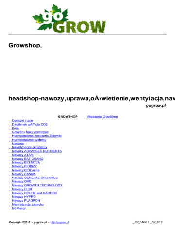 Growshop, headshop-nawozy,uprawa,oÅ›wietlenie,wentylacja,naw gogrow.pl GROWSHOP Akcesoria GrowShop Doniczki i tace Dwutlenek wÄ™gla CO2 Folie GrowBox boxy uprawowe Hydroponiczne Akcesoria Zbiorniki Hydroponiczne systemy Nasiona Nawilżacze Jonizatory Nawozy ADVANCED NUTRIENTS Nawozy ATAMI Nawozy BAT GUANO Nawozy BIO NOVA Nawozy BIOBIZZ Nawozy BIOCanna Nawozy CANNA Nawozy GENERAL ORGANICS Nawozy GHE Nawozy GROWTH TECHNOLOGY Nawozy HESI Nawozy HOUSE and GARDEN Nawozy HYPRO Nawozy PLAGRON Neutralizacja zapachu No Mercy Copyright ©2017 - gogrow.pl - http://gogrow.pl _PN_PAGE 1 _PN_OF 2 Ochrona roÅ›lin Osmoza odwrócona OÅ›wietlenie OÅ›wietlenie LED PodÅ‚oża uprawowe Procesy koÅ„cowe Programatory Sterowniki Przydatne gadżety Regulatory pH SMS Alarm Systemy NawadniajÄ…ce Systemy Wertykalne Ukorzenianie RoÅ›lin UrzÄ…dzenia Pomiarowe Wentylacja Filtracja Zestawy uprawowe Growshop podzielony na podkategorie, w których znaleźć można praktycznie wszystko co potrzebne do uprawy roÅ›lin wymagajÄ…cych szczególnej opieki oraz Å›rodków ochrony. JeÅ›li czegoÅ› nie ma w wybranych podkategoriach growshopu gogrow zapraszamy do kontaktu poprzez formularz lub telefonicznie a nasz pracownik przygotuje lub sprowadzi dla PaÅ„stwa zamówienia specjalne. Copyright ©2017 - gogrow.pl - http://gogrow.pl _PN_PAGE 2 _PN_OF 2