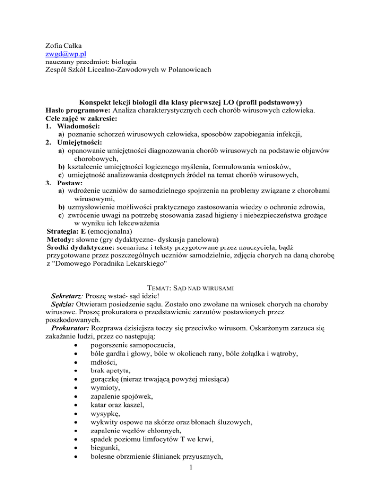 Zofia Całka [email protected] nauczany przedmiot: biologia Zespół Szkół Licealno-Zawodowych w Polanowicach Konspekt lekcji biologii dla klasy pierwszej LO (profil podstawowy) Hasło programowe: Analiza charakterystycznych cech chorób wirusowych człowieka. Cele zajęć w zakresie: 1. Wiadomości: a) poznanie schorzeń wirusowych człowieka, sposobów zapobiegania infekcji, 2. Umiejętności: a) opanowanie umiejętności diagnozowania chorób wirusowych na podstawie objawów chorobowych, b) kształcenie umiejętności logicznego myślenia, formułowania wniosków, c) umiejętność analizowania dostępnych źródeł na temat chorób wirusowych, 3. Postaw: a) wdrożenie uczniów do samodzielnego spojrzenia na problemy związane z chorobami wirusowymi, b) uzmysłowienie możliwości praktycznego zastosowania wiedzy o ochronie zdrowia, c) zwrócenie uwagi na potrzebę stosowania zasad higieny i niebezpieczeństwa grożące w wyniku ich lekceważenia Strategia: E (emocjonalna) Metody: słowne (gry dydaktyczne- dyskusja panelowa) Środki dydaktyczne: scenariusz i teksty przygotowane przez nauczyciela, bądź przygotowane przez poszczególnych uczniów samodzielnie, zdjęcia chorych na daną chorobę z "Domowego Poradnika Lekarskiego" TEMAT: SĄD NAD WIRUSAMI Sekretarz: Proszę wstać- sąd idzie! Sędzia: Otwieram posiedzenie sądu. Zostało ono zwołane na wniosek chorych na choroby wirusowe. Proszę prokuratora o przedstawienie zarzutów postawionych przez poszkodowanych. Prokurator: Rozprawa dzisiejsza toczy się przeciwko wirusom. Oskarżonym zarzuca się zakażanie ludzi, przez co następują: • pogorszenie samopoczucia, • bóle gardła i głowy, bóle w okolicach rany, bóle żołądka i wątroby, • mdłości, • brak apetytu, • gorączkę (nieraz trwającą powyżej miesiąca) • wymioty, • zapalenie spojówek, • katar oraz kaszel, • wysypkę, • wykwity ospowe na skórze oraz błonach śluzowych, • zapalenie węzłów chłonnych, • spadek poziomu limfocytów T we krwi, • biegunki, • bolesne obrzmienie ślinianek przyusznych, 1 • zapalenie opon mózgowych, • pojawienie się brodawek na skórze. Sekretarz: Na ławie oskarżonych zasiadają wirusy powodujące wściekliznę, wirusowe zapalenie wątroby, ospę, świnkę, odrę, AIDS itd. Sędzia: proszę o przesłuchanie świadków Prokurator: Powołuję pierwszego świadka- jest nim chory na wściekliznę. Proszę przedstawić sposób zakażenia, objawy i przebieg choroby. Chory na wściekliznę: Idąc ulicą zostałem pogryziony przez psa. w początkowym okresie występowało złe samopoczucie, mdłości, bóle gardła i głowy, brak apetytu, bóle w okolicy rany. Po czterech dniach wystąpiło u mnie uczucie lęku, wrażliwość na dźwięk i światło, zacząłem łzawić, stałem się bardziej nerwowy. Dobrze, że byłem pod opieką lekarza- objawy powoli minęły. Uważam, że wirus wścieklizny jest temu winien. Prokurator: Powołuję na świadka chorego na wirusowe zapalenie wątroby. Chory: Wirusem B zostałam zarażona u stomatologa. Czułam się fatalnie- bolała mnie głowa i wystąpiła wysoka gorączka, osłabienie, bóle żołądka i wątroby, wymioty. Po czterech dniach zachorowałam na żółtaczkę. Uważam, że wirus B jest winien mojej choroby. Prokurator: Powołuję na świadka chorą na odrę. Chora: Odwiedziłam koleżankę i zaraziłam się. Wystąpiły u mnie: gorączka, zapalenie spojówek, katar i kaszel oraz wysypka. Tak wtedy wyglądałam (tu wyciąga zdjęcie chorego na odrę i pokazuje zebranym). Uważam, że wirus odry jest winien- to przez niego tak wyglądałam! Prokurator: Powołuję na świadka chorego na ospę prawdziwą. Chory na ospę: Spotkałem się z chorym kolegą i po 12 dniach sam zachorowałem. Miałem wysoką gorączkę, na skórze wykwity w postaci plamek rozwijających się stopniowo w grudki i pęcherzyki. Pęcherzyki te ropiały a następnie zasychały i odpadały pozostawiając szpecące blizny (pokazuje zdjęcie chorego na ospę)- tak wtedy wyglądałem... Prokurator: Powołuję na świadka chorego na różyczkę. Chora: Dojeżdżam do pracy autobusem i przypuszczam, że tam właśnie od chorego zaraziłam się tą chorobą. Znosiłam ją ciężko- wystąpiła u mnie wysoka temperatura, zapalenie węzłów chłonnych a także bladoróżowa wysypka. Choroba zakończyła się dla mnie fatalnie, gdyż byłam w drugim miesiącu ciąży- nastąpiło poronienie. Uważam, że ten wirus jest podwójnie winny. Prokurator: Powołuję na świadka chorego na świnkę. Chory na świnkę: Zaraziłem się, gdy odwiedziłem chorą koleżankę, która bardzo kaszlała i kichała. Choroba ta miała bolesny przebieg- miałem obrzmiałe ślinianki, nie mogłem niczego przełknąć. Gdy choroba pozornie ustąpiła, to wystąpiły powikłania w formie zapalenia opon mózgowych. Dzięki właściwej diagnozie lekarzy wyzdrowiałem. Uważam, że odpowiedzialność za moją chorobę i cierpienia ponosi wirus! 2 Prokurator: Świadek jest wolny. Wysoki Sądzie, wysłuchaliśmy wszystkich skarg złożonych przez chorych na choroby wirusowe. Proszę teraz o wyrażenie zgody na przesłuchanie oskarżonych. (w imieniu oskarżonych głos zabiera wirus wścieklizny) Prokurator: Czy teraz, po konfrontacji z waszymi ofiarami, wy- wirusy jesteście świadome nieszczęść, na jakie skazujecie nas- ludzi? Wirus wścieklizny: My- wirusy jesteśmy po to, aby zarażać- taka jest nasza rola. Ponadto uważamy, iż wy- ludzie- istoty myślące winniście przestrzegać higieny, nie kontaktować się z ludźmi chorymi, nie głaskać każdego spotkanego zwierzęcia, poddawać się obowiązkowym szczepieniom ochronnym. Ponadto- zwróćcie uwagę na fakt, że niektóre choroby wirusowe raz przebyte dają odporność na całe życie, jak na przykład-ospa wietrzna, różyczka... Prokurator: Nie mam więcej pytań. Wysoki Sądzie- proszę o wysłuchanie wirusologaeksperta do spraw wirusów. Wypowie się