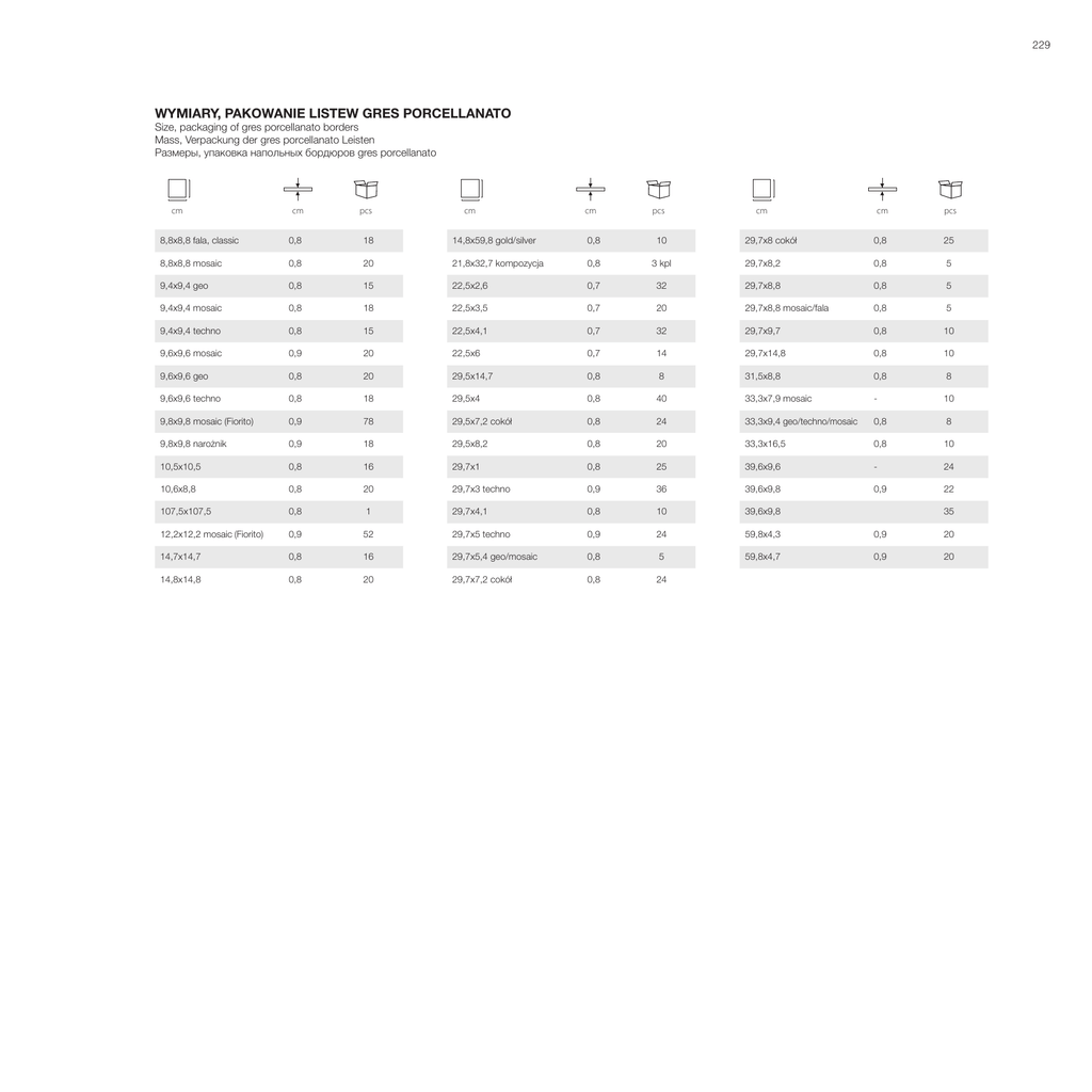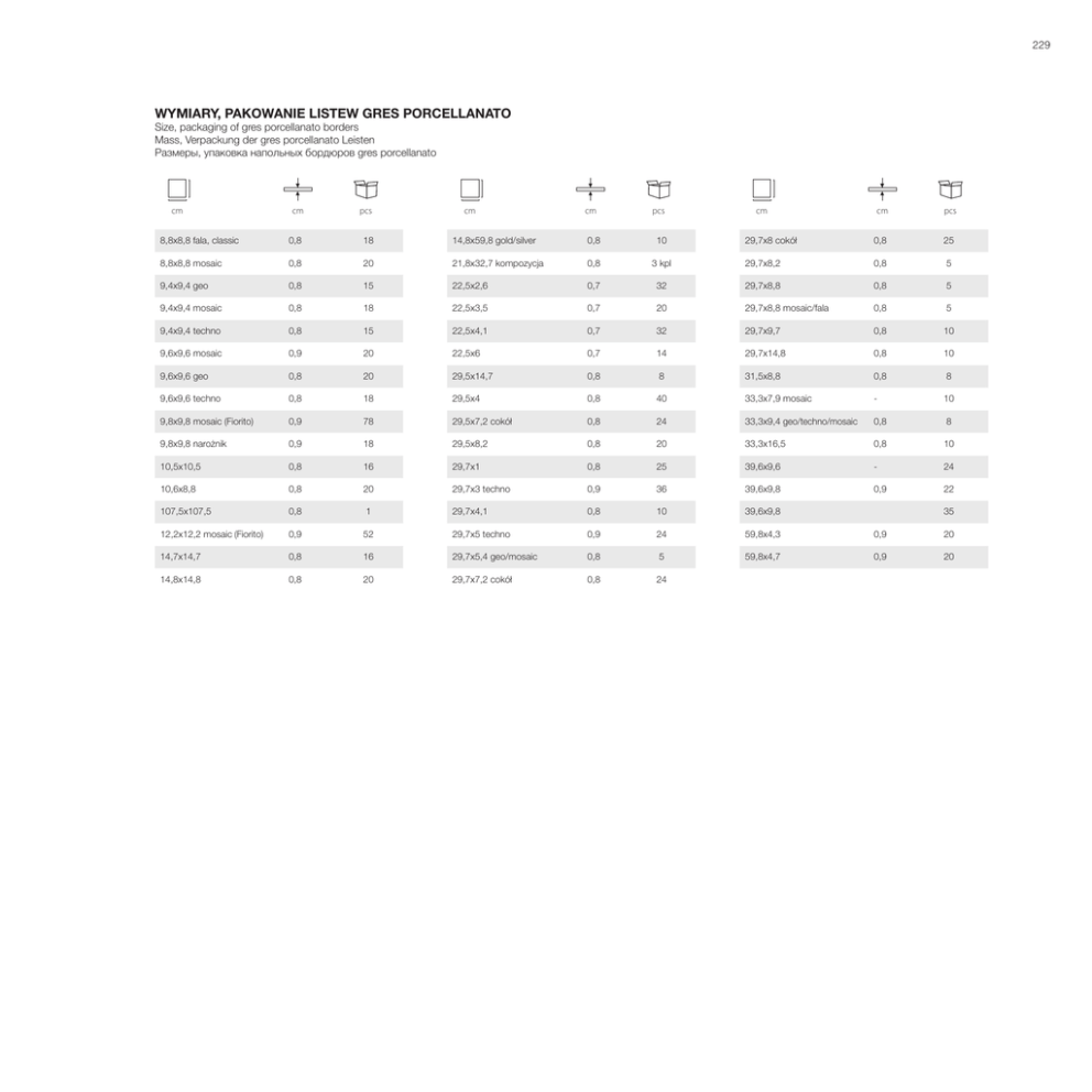 229 WYMIARY, PAKOWANIE LISTEW GRES PORCELLANATO Size, packaging of gres porcellanato borders Mass, Verpackung der gres porcellanato Leisten Размеры, упаковка напольных бордюров gres porcellanato cm cm cm pcs cm pcs 8,8x8,8 fala, classic 0,8 18 14,8x59,8 gold/silver 0,8 10 8,8x8,8 mosaic 0,8 20 21,8x32,7 kompozycja 0,8 9,4x9,4 geo 0,8 15 22,5x2,6 9,4x9,4 mosaic 0,8 18 9,4x9,4 techno 0,8 9,6x9,6 mosaic cm cm pcs 29,7x8 cokół 0,8 25 3 kpl 29,7x8,2 0,8 5 0,7 32 29,7x8,8 0,8 5 22,5x3,5 0,7 20 29,7x8,8 mosaic/fala 0,8 5 15 22,5x4,1 0,7 32 29,7x9,7 0,8 10 0,9 20 22,5x6 0,7 14 29,7x14,8 0,8 10 9,6x9,6 geo 0,8 20 29,5x14,7 0,8 8 31,5x8,8 0,8 8 9,6x9,6 techno 0,8 18 29,5x4 0,8 40 33,3x7,9 mosaic - 10 9,8x9,8 mosaic (Fiorito) 0,9 78 29,5x7,2 cokół 0,8 24 33,3x9,4 geo/techno/mosaic 0,8 8 9,8x9,8 narożnik 0,9 18 29,5x8,2 0,8 20 33,3x16,5 0,8 10 10,5x10,5 0,8 16 29,7x1 0,8 25 39,6x9,6 - 24 10,6x8,8 0,8 20 29,7x3 techno 0,9 36 39,6x9,8 0,9 22 107,5x107,5 0,8 1 29,7x4,1 0,8 10 39,6x9,8 12,2x12,2 mosaic (Fiorito) 0,9 52 29,7x5 techno 0,9 24 59,8x4,3 0,9 20 14,7x14,7 0,8 16 29,7x5,4 geo/mosaic 0,8 5 59,8x4,7 0,9 20 14,8x14,8 0,8 20 29,7x7,2 cokół 0,8 24 35