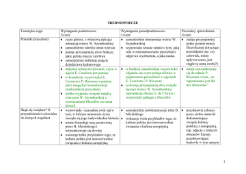 ŚREDNIOWIECZE Tematyka zajęć Wymagania podstawowe. Uczeń: Pomniki przeszłości ♦ czyta głośno, z właściwą dykcją i intonacją wiersz W. Szymborskiej ♦ samodzielnie określa temat wiersza ♦ podaje przynajmniej dwie funkcje, jakie pełnią muzea i archiwa ♦ samodzielnie definiuje pojęcie dziedzictwa kulturowego ♦ objaśnia własnymi słowami, czym w ujęciu E. Cassirera jest pamięć ♦ w kontekście wypowiedzi E. Cassirera i P. Ricoeura wyjaśnia, jakie mogą być konsekwencje zniekształceń przeszłości ♦ krótko wyjaśnia związek między wierszem W. Szymborskiej a rozważaniami filozofów na temat historii Skąd się wziąłem? O ♦ wypowiada i uzasadnia swój sąd o przynależności człowieka tym, w którym momencie życia do różnych wspólnot zaczęła się jego indywidualna historia ♦ ustnie formułuje tezę postawioną przez B. Micińskiego i ustosunkowuje się do niej ♦ wskazuje kilka przykładów tego, że kultura polska jest nierozerwalnie związana z kulturą europejską Wymagania ponadpodstawowe. Procedury sprawdzania. Uczeń: Uczeń: ♦ samodzielnie interpretuje wiersz W. ♦ zadaje przynajmniej Szymborskiej jedno pytanie natury filozoficznej dotyczące ♦ wypowiada własne zdanie o tym, jaką przemijania (np. czy rolę w rekonstruowaniu przeszłości człowiek, mimo odgrywa wyobraźnia, a jaką nauka upływu czasu, jest ciągle tą samą osobą?) ♦ w krótkiej samodzielnej wypowiedzi ♦ ustnie ustosunkowuje objaśnia, na czym polega różnica w się do zdania P. pojmowaniu przeszłości w ujęciach Ricoeura o tym, „że E. Cassirera i P. Ricoeura zapominanie jest dla nas zbawienne” ♦ wskazuje przynajmniej dwa związki łączące wiersz W. Szymborskiej, reprodukcję obrazu G. de Chirico i wypowiedź jednego z filozofów ♦ samodzielnie problematyzuje tekst B. ♦ przedstawia zebrany Micińskiego przez siebie materiał dokumentujący ♦ wskazuje wiele przykładów tego, że związki kultury kultura polska jest nierozerwalnie polskiej z europejską, związana z kulturą europejską (np. zdjęcia z różnych obszarów Europy przedstawiające budowle w tym samym 1 ♦ wymienia wartości uniwersalne wpisane w kulturę ♦ podaje przynajmniej po jednym funkcjonującym w kulturze przykładzie piękna, dobra, wierności itp. Poetycka podróż w ♦ przeszłość – analiza i interpretacja wiersza Anny Świrszczyńskiej Nie ♦ narodzona ♦ ♦ ♦ Słowniki i sposoby posługiwania się nimi ♦ stylu ♦ wymienia elementy, które świadczą o architektonicznym) dziedzictwie kulturowym i przynależności do kręgu kultury (np. język, tradycja) ♦ podaje argumenty potwierdzające, że wymienione wcześniej elementy świadczą o przynależności do kultury samodzielnie określa temat wiersza ♦ przy pomocy nauczyciela analizuje i ♦ ustnie wykonuje A. Świrszczyńskiej i wyodrębnia interpretuje wiersz A. zadanie 1 z 15 s. poszczególne obrazy Świrszczyńskiej, ze szczególnym podręcznika zwróceniem uwagi na funkcje wskazuje w tekście wszystkie epitety obrazów poetyckich i metafory oraz określa ich funkcje w wierszu ♦ odnajduje w wierszu A. Świrszczyńskiej nawiązania odwołując się do wiersza A. kulturowe Świrszczyńskiej, podaje przynajmniej jeden przykład na to, że prawda literacka nie jest tożsama z rzeczywistością lub prawdą historyczną przy pomocy nauczyciela analizuje i ♦ przy niewielkiej pomocy nauczyciela ♦ ustanie wypowiada się na temat roli interpretuje wiersz A. analizuje i interpretuje wiersz A. Świrszczyńskiej zwracając uwagę na minionych kultur we Świrszczyńskiej ze szczególnym własnym życiu funkcje obrazów poetyckich, zwróceniem uwagi na funkcje zabiegów językowych i operowanie obrazów poetyckich paradoksem samodzielnie wyjaśnia sens nawiązań do różnych epok ♦ wyraża własne zdanie na temat jakości życia oderwanego od kultury rozpoznaje typy słowników i właściwie się nimi posługuje ♦ wykonuje ćwiczenia słownikowe różnego typu przygotowane przez nauczyciela 2 W poszukiwaniu genesis kultury zbiorowej i indywidualnej Z Biblią w ręku – krótki przewodnik po Świętej Księdze „Na początku…” – kosmogonia biblijna „Ocalony” poeta jako nowy Adam ♦ czyta głośno, z właściwą dykcją i ♦ odnajduje i nazywa odwołania intonacją wiersz R. Brandstaettera stylistyczne obecne w wierszu (psalm, litania) ♦ odczytuje wyraziste konteksty literackie (Mickiewicz, ♦ odnajduje w wierszu wiele Kochanowski) i historyczne (II wojna kontekstów literackich i światowa) historycznych i wykorzystuje je w interpretacji ♦ w kontekście wiersza wypowiada własne zdanie na temat ♦ cytuje przynajmniej jeden fragment kulturotwórczej roli Biblii tekstu, do którego R. Brandstaetter nawiązuje w swym wierszu ♦ podaje najważniejsze zagadnienia ♦ wyjaśnia różnicę między rodzajami dotyczące historii Biblii i jej ksiąg biblijnych (np. historyczną przekładów księgą Genesis a Apokalipsą) ♦ w swych wypowiedziach właściwie ♦ porównuje kosmogonie biblijną i posługuje się słownictwem mitologiczną związanym z Biblią (np. Pięcioksiąg, ♦ we fragmentach tłumaczeń Biblii Genesis, Ewangelia) wskazuje różnice składniowe, ♦ na podstawie podanego skrótu fleksyjne i słownikowe odnajduje odpowiedni fragment Biblii ♦ we fragmentach dwóch przekładów tekstów biblijnych wskazuje różnice słownikowe (np. słownictwo dotyczące kobiety) i składniowe ♦ czyta głośno, z właściwą dykcją i ♦ samodzielnie interpretuje wiersz, intonacją wiersz T. Różewicza wykorzystując kontekst biblijny, historyczny i wiadomości o biografii ♦ samodzielnie wskazuje nawiązania do autora Biblii (stwarzanie i nazywanie), historii (wojna) i biografii poety ♦ wyjaśnia funkcję, jaką w wierszu pełni demitologizacja ♦ przy pomocy nauczyciela formułuje tezy interpretacyjne ♦ stawia pytanie o własną, indywidualną genesis kulturową ♦ 