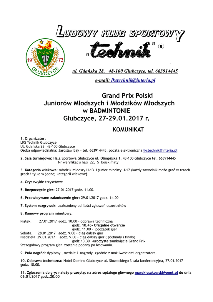 ! ul. Gdańska 28, 48-100 Głubczyce, tel. 663914445 e-mail: [email protected] Grand Prix Polski Juniorów Młodszych i Młodzików Młodszych w BADMINTONIE Głubczyce, 27-29.01.2017 r. KOMUNIKAT 1. Organizator: LKS Technik Głubczyce Ul. Gdańska 28, 48-100 Głubczyce Osoba odpowiedzialna: Jarosław Bąk – tel. 663914445, poczta elektroniczna [email protected] 2. Sala turniejowa: Hala Sportowa Głubczyce ul. Olimpijska 1, 48-100 Głubczyce tel. 663914445 Nr weryfikacji hali 22, 5 boisk maty 3. Kategoria wiekowa: młodzik młodszy U-13 i junior młodszy U-17 (każdy zawodnik może grać w trzech grach i tylko w jednej kategorii wiekowej. 4. Gry: zwykłe trzysetowe 5. Rozpoczęcie gier: 27.01.2017 godz. 11.00. 6. Przewidywane zakończenie gier: 29.01.2017 godz. 14.00 7. System rozgrywek: uzależniony od ilości zgłoszeń uczestników 8. Ramowy program minutowy: Piątek, 27.01.2017 godz. 10.00 – odprawa techniczna godz. 10.45– Oficjalne otwarcie godz. 11.00 – początek gier Sobota, 28.01.2017 godz. 9.00 – ciąg dalszy gier Niedziela 29.01.2017 godz. 9.00 – ciąg dalszy gier ( półfinały i finały) godz.13.30 -uroczyste zamknięcie Grand Prix Szczegółowy program gier zostanie podany po losowaniu. 9. Pula nagród: dyplomy , medale i nagrody zgodnie z możliwościami organizatora. 10. Odprawa techniczna: Hotel Domino Głubczyce ul. Słowackiego 3 sala konferencyjna, 27.01.2017 godz. 10.00. 11. Zgłoszenia do gry: należy przesyłąc na adres sędziego głównego [email protected] do dnia 06.01.2017 godz.20.00 - lista zgłoszeń będzie publikowana na stronie www.tournamentsoftware.com 12. Losowanie: 17.01.2017 godz. 16:00 publikacja losowania: 18.01.2017 do godz. 20:00 13. Wpisowe – Gra pojedyncza 34 zł/zawodnik, gra podwójna 30 zł/zawodnik 14.Zakwaterowanie : -Hotel „Domino” ul.Słowackiego w Głubczycach 60 zł-/os/doba (przy hali) Telefon : (+48) 77 485 09 01 Fax : (+48) 77 485 09 05 E-mail : [email protected] -Dworek Peszków ul. Parkowa 4 w Głubczycach pokój 2-osobowy 150 zł/doba ze śniadaniem, 1 osobowy 110zł/doba ze śniadaniem ( 500m od hali ) Tel. 505032899 -Internat Zespół Szkół Centrum Kształcenia Rolniczego ul.Niepodległości 1 w Głubczycach 25 zł/os/ doba (500m od hali) Tel. 774852885 -Hotel „Tanie noclegi „ Głubczyce ul. Żeromskiego 25 , 25 zł/os/doba (100m od hali) Tel. 796 786 250 -Szkolne schronisko Młodzieżowe Zopowy ul. Opawska 14 15zł/os/doba ( 10 km od hali ok. 15 min) tel.553 305 415 , 553 305 416 lub 77 485 76 12 -Hotel „Florres „ ul. Nowa 1 b 47-280 Pawłowiczki 70 zł/os/doba ze śniadaniem (15 km od hali ok. 15 min) tel.693232873 E-mail:[email protected] - Hotel Fantazja ul. Dworcowa 5 48-250 Głogówek pokój 2 osobowy z łazienką od 90 zł, 3 osobowy z łazienka od 120zł, 4 osobowy z łazienką od 160 zł [ 20 km od hali 20 min] Tel. 77 437 21 62 17.Wyżywienie: w hotelu „Domino” przy hali 10 zł śniadanie,20 zł obiad,15 zł kolacja Zamówienia na posiłki prosimy zgłaszać do 23.01.2017r. na adres organizatora e-mail [email protected] Tel. 663 914 445 lub 605 306 950 18.Sędzia główny: Marek ŁYSAKOWSKI (licencja GPL 11) – poczta elektroniczna: [email protected], tel. 604510079. 19. Lotki – Uczestnicy dostarczają we własnym zakresie. 20. Inne 1. Termin wręczenia trofeów – niedziela 29.01.2017 według planu na ten dzień. 2. Przepisy końcowe – obowiązuje Regulamin Sportowy PZBad. 3. Stoisko ze sprzętem sportowym marki „ FORZA” z możliwością naciągania rakiet.