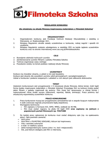 REGULAMIN KONKURSU dla młodzieży na etiudę filmową inspirowaną materiałem z Filmoteki Szkolnej ORGANIZATORZY Organizatorem konkursu jest Fundacja Centrum Edukacji Obywatelskiej z siedzibą w Warszawie, ul. Noakowskiego 10/1. Niniejszy Regulamin określa zasady uczestnictwa w konkursie, rodzaj nagród i sposób ich uzyskania. Niniejszy Regulamin zostanie udostępniony w siedzibie CEO na każde żądanie uczestników konkursu oraz na stronie internetowej www.ceo.org.pl/filmotekaszkolna 1. 2. 3. • • • • CELE Rozwijanie zdolności twórczych uczniów Zainteresowanie uczniów filmami z pakietu Filmoteka Szkolna Twórcza organizacja czasu wolnego Pozyskanie wiedzy na temat podstaw realizacji etiudy filmowej UCZESTNICY Konkurs ma charakter otwarty, a udział w nim jest bezpłatny. Konkurs jest otwarty dla wszystkich uczniów szkół gimnazjalnych i ponadgimnazjalnych. Udział w konkursie i podanie związanych z udziałem w nim danych jest całkowicie dobrowolne. TEMAT Zadaniem konkursowym jest przygotowanie 1-5 minutowej etiudy filmowej, której temat, treść bądź forma byłaby inspirowana materiałem z Filmoteki Szkolnej. Przysyłając film na konkurs trzeba podać jakim filmem z pakietu inspirowali się autorzy. Film może być opracowany w różnej formie i wykorzystywać różne środki wyrazu (dokument, reportaż, fabuła, animacja). Praca powinny być artystyczną wypowiedzią uczestników konkursu. PRACE KONKURSOWE Prace konkursowe muszą być przygotowane samodzielnie lub w zespole liczącym maksymalnie 5 osób (wówczas nagrody przyznawane będą zespołowo). Wymagania techniczne: • film zapisany w formacie AVI, WMV, MPEG, wielkość do 40 MB; • film musi zostać nagrany na płytę CD bądź DVD oraz zapisany na jednym z popularnych portali filmowych np. YOUTUBE 1. 2. 3. • • • • • • Do każdej pracy zgłoszonej do konkursu musi zostać dołączony opis (np. na opakowaniu płyty). Opis powinien zawierać: tytuł pracy tytuł filmu z FILMOTEKI SZKOLNEJ, którym był inspirowany imię i nazwisko autora/ów e-mail i nr telefonu autora adres korespondencyjny autora (ulica i nr, kod i miejscowość) link, pod którym dostępny jest film w internecie, 1 • 4. 5. Jeden uczestnik lub zespół może przesłać max. 2 prace. Autorzy, nadsyłając pracę, zgadzają się na zamieszczenie jej kopii na stronach internetowych CEO oraz wykorzystanie jej przy produkcji i rozpowszechnianiu materiałów edukacyjnych oraz informacyjnych. Do każdej przesłanej pracy plastycznej uczestnicy muszą dołączyć oświadczenie dotyczące prawa autorskiego i prawa do wizerunku (w przypadku uczestników nieletnich oświadczenie powinno zostać podpisane przez ich opiekunów pranych), które znajduje się na stronie www.ceo.org.pl/filmotekaszkolna. Organizatorzy zastrzegają sobie prawo do odrzucenia prac niezwiązanych z tematyką konkursu. Zabronione jest przesyłanie prac sprzecznych z dobrymi obyczajami, naruszającymi ogólnie przyjęte wartości – takie prace nie będą brały udziału w konkursie. O tym, że nadesłana praca narusza powyższe zasady, decyduje ocena organizatorów konkursu. 6. 7. 8. • • • • • nazwa i adres szkoły TERMINARZ KONKURSU ogłoszenie konkursu 10 listopada 2011 nadsyłanie prac: do 15 lutego 2012 (decyduje data stempla pocztowego) wyłonienie 10 prac, które wezmą udział w konkursie głównym oraz głosowaniu Internautów – 1 marca 2012 głosowanie w internecie 1 marca – 14 marca 2012 ogłoszenie wyników: 15 marca 2012 (zarówno NAGRODA JURY, NAGRODA INTERNAUTÓW jak i WYRÓŻNIENIA) ZASADY PRZYZNAWANIA NAGRÓD Zostaną przyznane dwie nagrody NAGRODA INTERNAUTÓW i NAGRODA FILMOTEKI SZKOLNEJ. AKCJI! Organizatorzy zastrzegają sobie prawo przyznania maksymalnie dwóch WYRÓŻNIEŃ. 2. JURY (wybrane przez organizatorów konkursu) wyłoni 10 najlepszych prac, na które głosować będą internauci poprzez stronę internetową www.ceo.org.pl/filmotekaszkolna. Film, który otrzyma najwięcej głosów zdobędzie NAGRODĘ INTERNAUTÓW. 3. Jury przyzna również NAGRODĘ FILMOTEKI SZKOLNEJ. AKCJI! według następujących kryteriów: – oryginalność pomysłu – indywidualny i twórczy charakter wypowiedzi – poprawność techniczna 1. 4. JURY zastrzega sobie prawo przyznania maksymalnie dwóch wyróżnień kierując się takimi samymi kryteriami jak przy wyborze NAGRODY FILMOTEKI SZKOLNEJ.AKCJI!, tj: -oryginalność pomysłu - indywidualny i twórczy charakter wypowiedzi - poprawność techniczna • • • • NAGRODY NAGRODA INTERNAUTÓW – program do montażu filmów: Nero, video premium, dyplom NAGRODA FILMOTEKI SZKOLNEJ. AKCJA! – program do montażu filmów: Nero, video premium, dyplom WYRÓŻNIENIA – książki o tematyce filmowej, dyplom Kopie nagrodzonych i wyróżnionych prac zostaną opublikowane w internecie na stronie CEO: www.ceo.org.pl/filmotekaszkolna oraz www.filmotekaszkolna.pl 2 ZGŁOSZENIE PRAC KONKURSOWYCH Pracę konkursową należy zgłosić wypełniając formularz zgłoszeniowy na stronie www.ceo.org.pl/filmotekaszkolna. W formularzu należy od razy wpisać link do filmu. Pracę należy również przesłać w wersji elektronicznej na DVD, dokładnie opisaną, wraz z oświadczeniem uczestnika konkursu, w jednej przesyłce, na adres organizatora konkursu: Fundacja Centrum Edukacji Obywatelskiej ul. Noakowskiego 10/ 1 00 – 666 Warszawa z dopiskiem: „Konkurs filmowy” Przesłanie pracy konkursowej jest równoznaczne z uczestnictwem w konkursie. Prace konkursowe można przesyłać wyłącznie do 15 lutego 2012 – decyduje data stempla pocztowego. Po zakończeniu konkursu CEO nie zwraca nadesłanych prac ich autorom. OGŁOSZENIE KONKURSU Informacje o czasie trwania i zasadach Konkursu oraz nagrodach zostaną przedstawione: – nauczycielom szkół gimnazjalnych i ponadgimnazjalnych – przedstawicielom wybranych mediów – na stronie internetowej www.ceo.org.pl OŚWIADCZENIA O PRAWACH AUTORSKICH 1. Uczestni