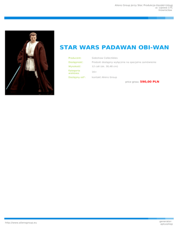 Aliens Group Jerzy Stec Produkcja-Handel-Usługi ul. Lipowa 17C Inowrocław STAR WARS PADAWAN OBI-WAN Producent: Sideshow Collectibles Dostępność: Produkt dostępny wyłącznie na specjalne zamówienie Wysokość: 12 cali (ok. 30,48 cm) Kategoria wiekowa: 16+ Dostępny od*: kontakt Aliens Group price gross: http://www.aliensgroup.eu 590,00 PLN generator: aptusshop