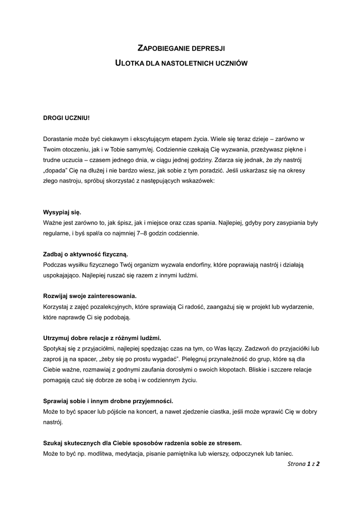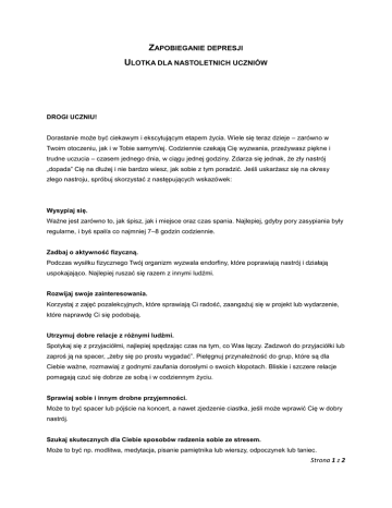 ZAPOBIEGANIE DEPRESJI ULOTKA DLA NASTOLETNICH UCZNIÓW DROGI UCZNIU! Dorastanie może być ciekawym i ekscytującym etapem życia. Wiele się teraz dzieje – zarówno w Twoim otoczeniu, jak i w Tobie samym/ej. Codziennie czekają Cię wyzwania, przeżywasz piękne i trudne uczucia – czasem jednego dnia, w ciągu jednej godziny. Zdarza się jednak, że zły nastrój „dopada” Cię na dłużej i nie bardzo wiesz, jak sobie z tym poradzić. Jeśli uskarżasz się na okresy złego nastroju, spróbuj skorzystać z następujących wskazówek: Wysypiaj się. Ważne jest zarówno to, jak śpisz, jak i miejsce oraz czas spania. Najlepiej, gdyby pory zasypiania były regularne, i byś spał/a co najmniej 7–8 godzin codziennie. Zadbaj o aktywność fizyczną. Podczas wysiłku fizycznego Twój organizm wyzwala endorfiny, które poprawiają nastrój i działają uspokajająco. Najlepiej ruszać się razem z innymi ludźmi. Rozwijaj swoje zainteresowania. Korzystaj z zajęć pozalekcyjnych, które sprawiają Ci radość, zaangażuj się w projekt lub wydarzenie, które naprawdę Ci się podobają. Utrzymuj dobre relacje z różnymi ludźmi. Spotykaj się z przyjaciółmi, najlepiej spędzając czas na tym, co Was łączy. Zadzwoń do przyjaciółki lub zaproś ją na spacer, „żeby się po prostu wygadać”. Pielęgnuj przynależność do grup, które są dla Ciebie ważne, rozmawiaj z godnymi zaufania dorosłymi o swoich kłopotach. Bliskie i szczere relacje pomagają czuć się dobrze ze sobą i w codziennym życiu. Sprawiaj sobie i innym drobne przyjemności. Może to być spacer lub pójście na koncert, a nawet zjedzenie ciastka, jeśli może wprawić Cię w dobry nastrój. Szukaj skutecznych dla Ciebie sposobów radzenia sobie ze stresem. Może to być np. modlitwa, medytacja, pisanie pamiętnika lub wierszy, odpoczynek lub taniec. Strona 1 z 2 Wszystkie te aktywności pomagają utrzymać dobre samopoczucie i wewnętrzną równowagę. Jeśli jednak zły nastrój utrzymuje się, a Ty: ciągle jesteś smutny/a, przygnębiony/a lub rozdrażniony/a, ostatnio schudłeś/aś, nie masz apetytu lub jesz zbyt wiele, nie możesz spać lub śpisz zbyt długo, nie masz sił, nic ci się nie chce, odczuwasz różne bóle i dolegliwości w ciele, Jest Ci ciągle „jakoś tak źle…”, nie cieszysz się tym, co jeszcze niedawno sprawiało Ci przyjemność, masz kłopoty z koncentracją lub zapamiętywaniem, źle o sobie myślisz, nie lubisz siebie, możesz cierpieć na depresję. Depresja to czwarty najpoważniejszy problem zdrowotny na świecie, cierpi na nią obecnie 5–10% młodych osób. PAMIĘTAJ! To zbyt poważny problem, by radzić sobie z nim w pojedynkę. Prośba o radę to nie wstyd. Zwróć się do zaufanego nauczyciela, pedagoga lub psychologa szkolnego i powiedz o swoich odczuciach i obserwacjach. Oni będą wiedzieli, jak można Ci pomóc, żebyś znów mógł/mogła cieszyć się codziennym życiem. Nie jesteś sam/a. Strona 2 z 2